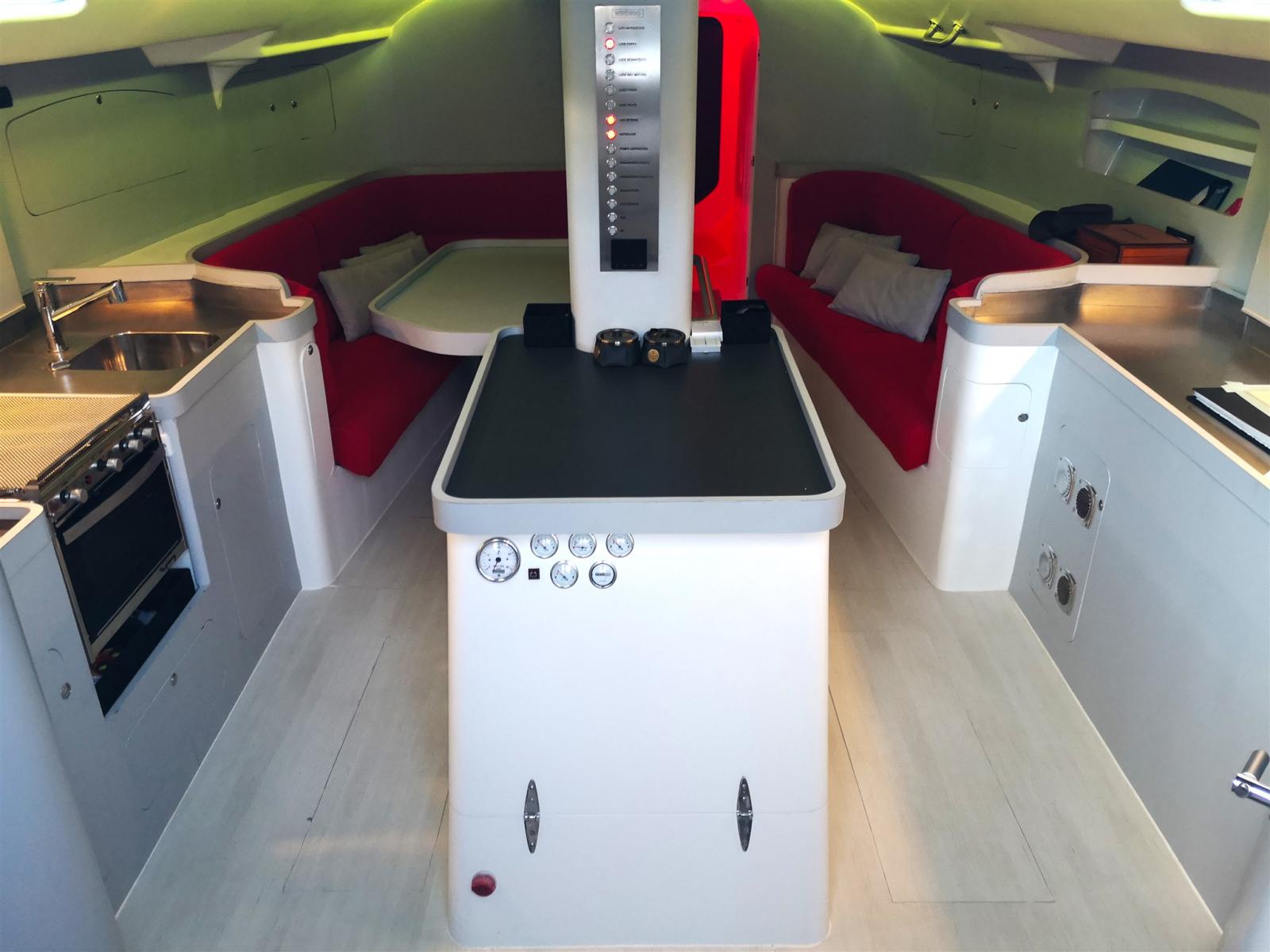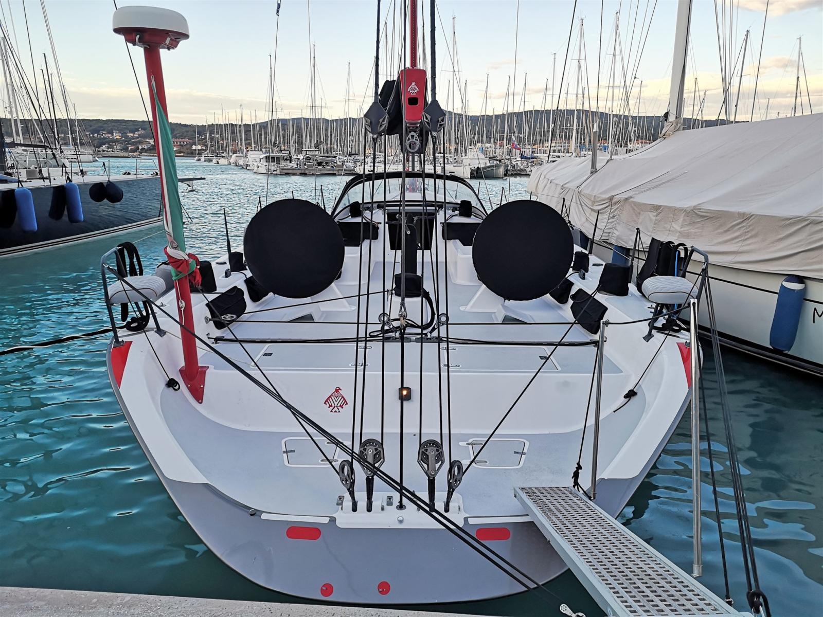 Entièrement construit en fibre de carbone et équipé d’une quille rétractable, utilisé comme yacht de croisière rapide pour la navigation estivale.