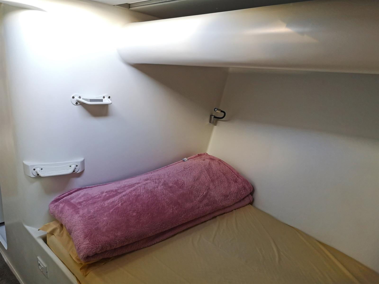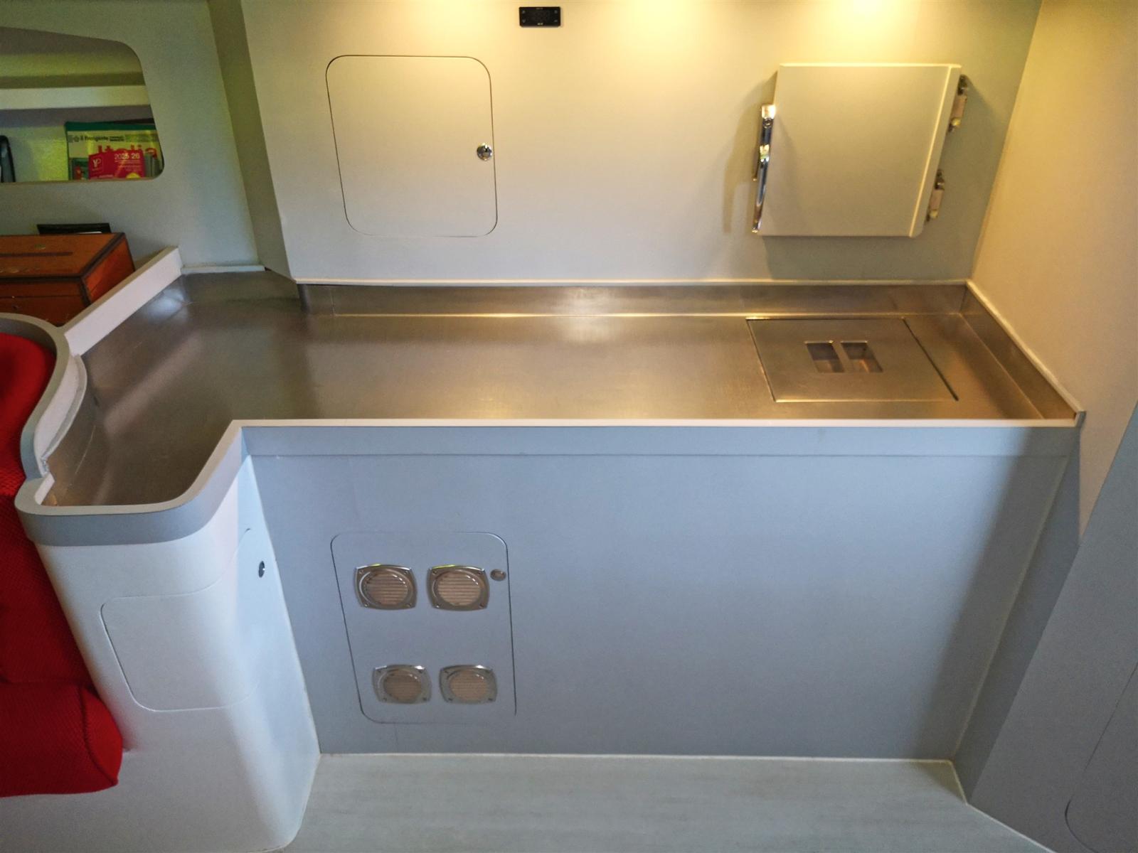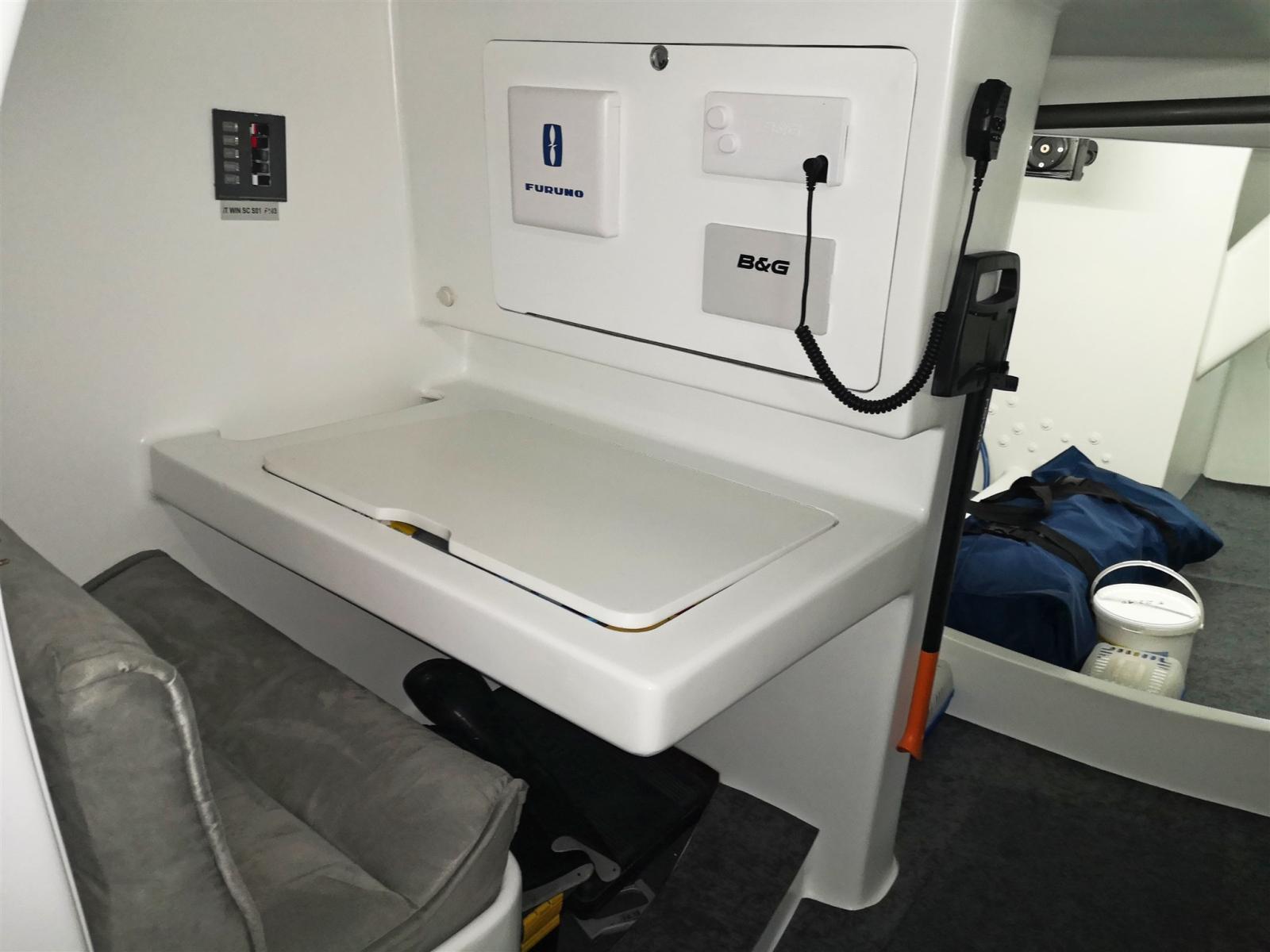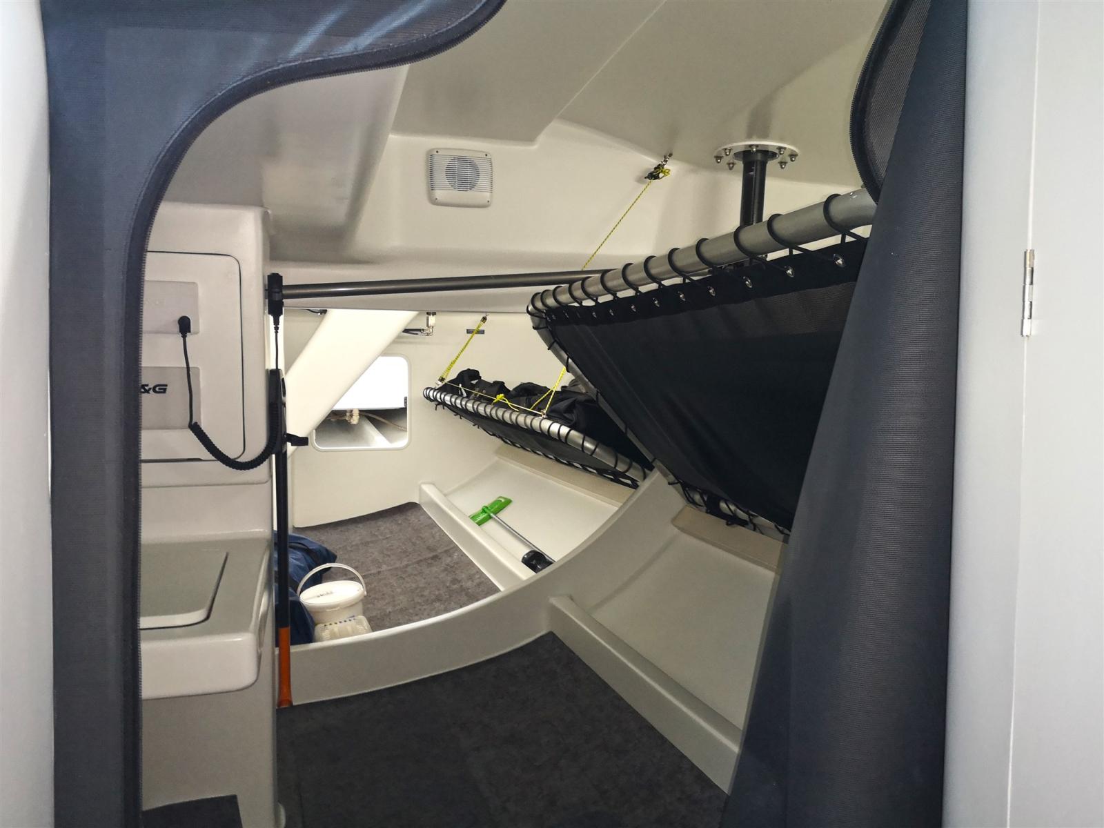 Salle technique à l’arrière avec entrée bâbord, table de cartes et 3 couchettes pour l’équipage