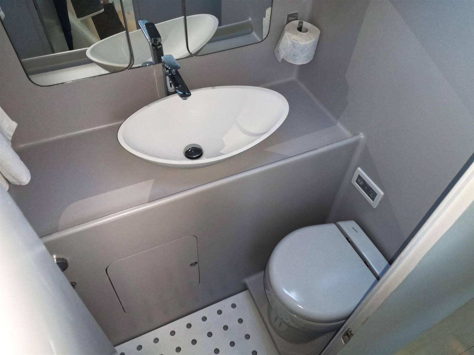 Salle de bain privée dans la cabine principale avec lavabo, toilettes électriques et douche