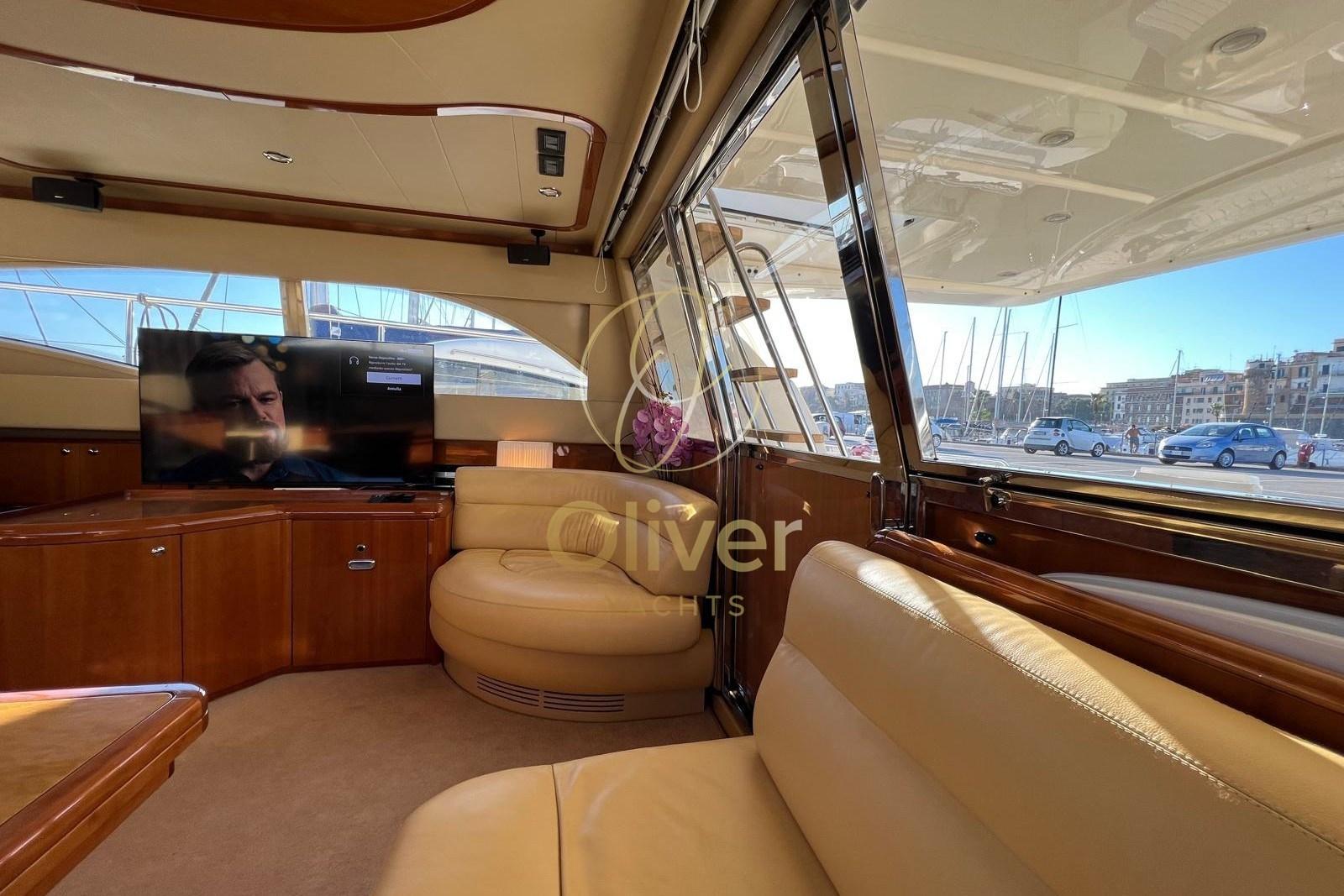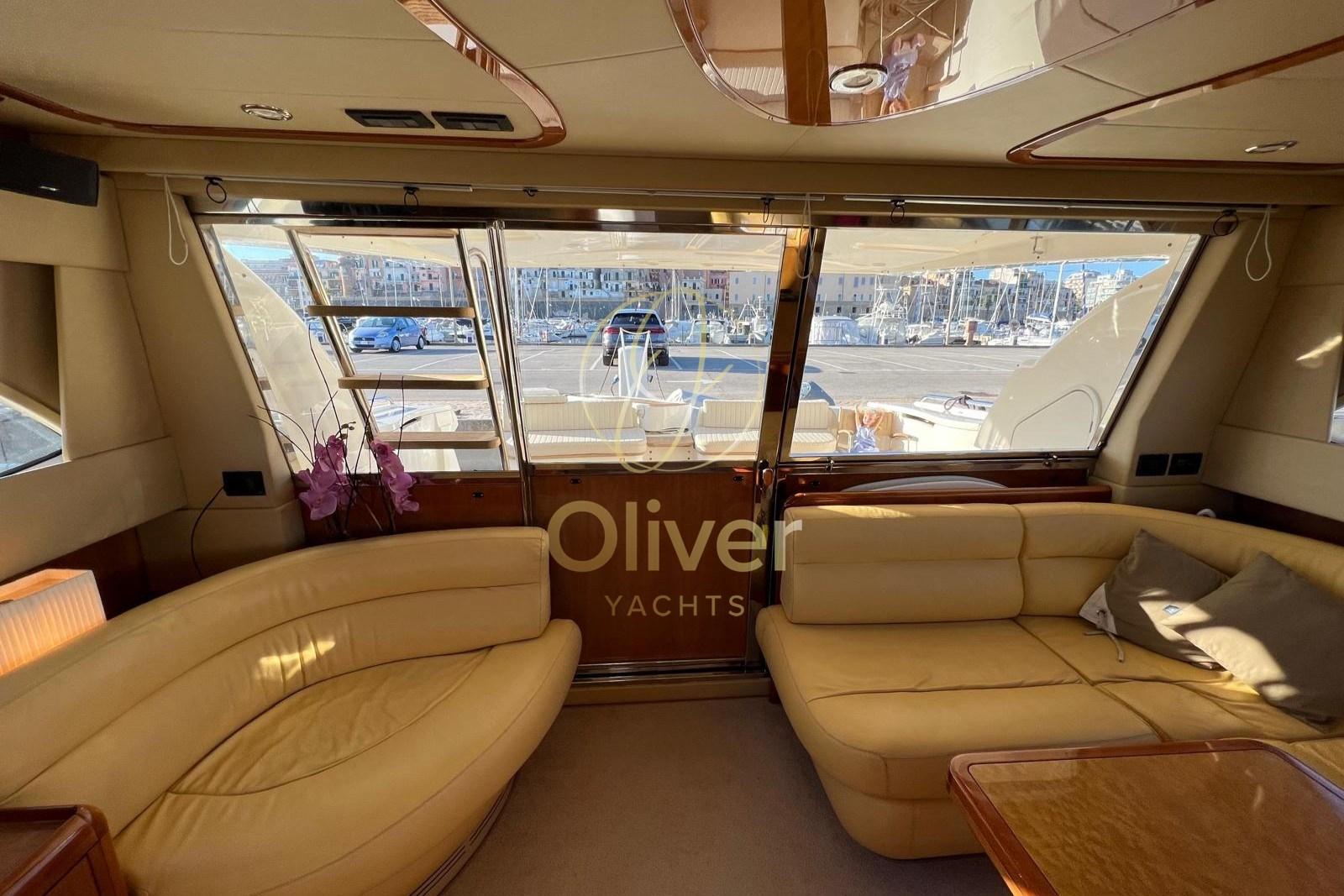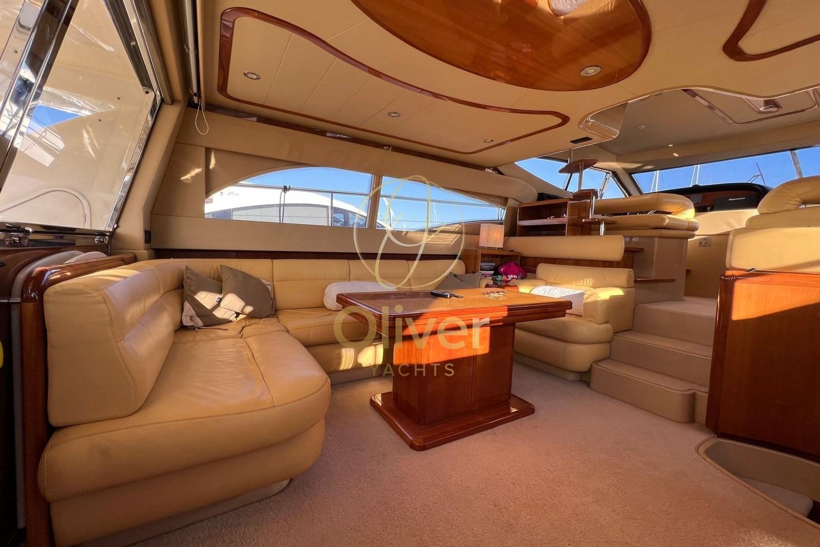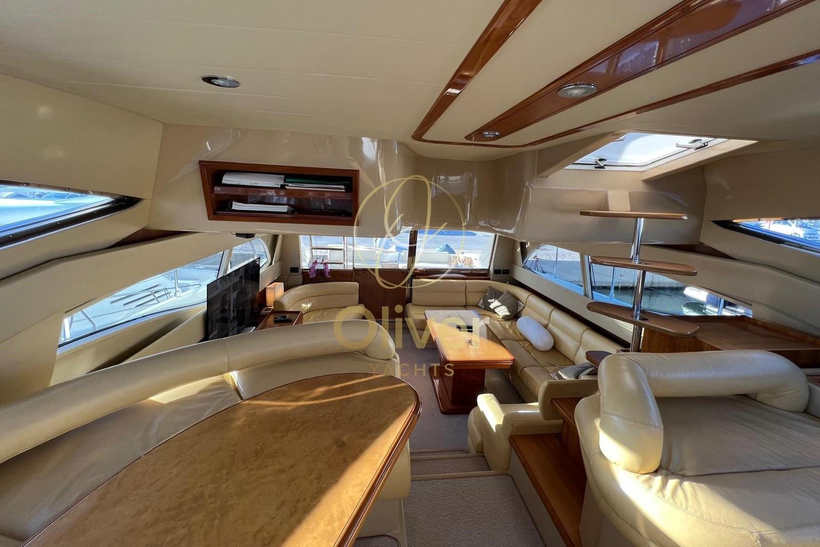 Les intérieurs de la Ferretti 590 se distinguent par leur luminosité, leur espace et leur atmosphère élégante, typiques de la production Ferretti. Le salon est grand et accueillant, avec des canapés opposés, une salle à manger bien séparée et de grandes surfaces vitrées qui garantissent la lumière naturelle et la vivabilité, même dans la rade ou au port.