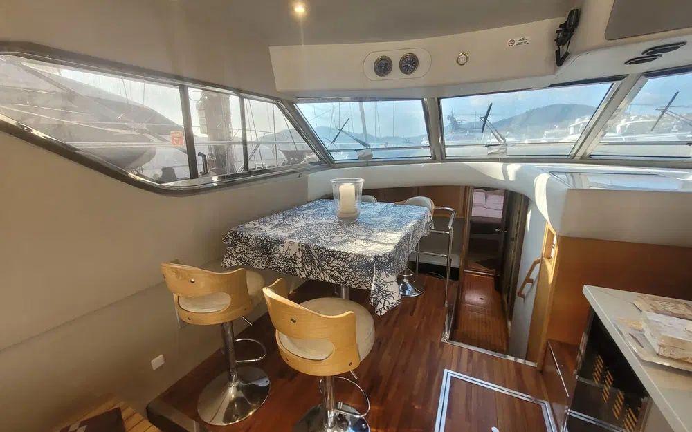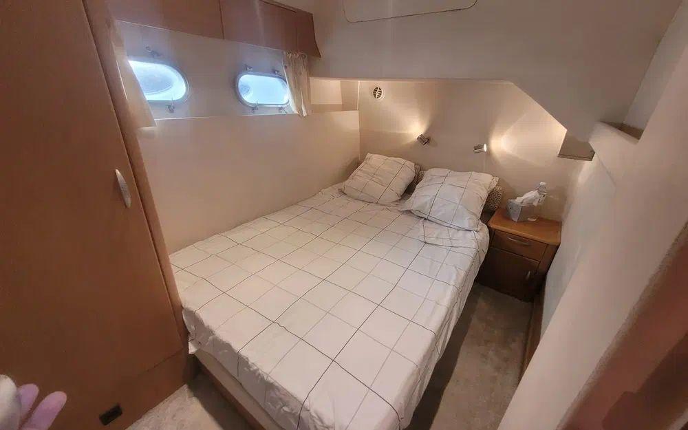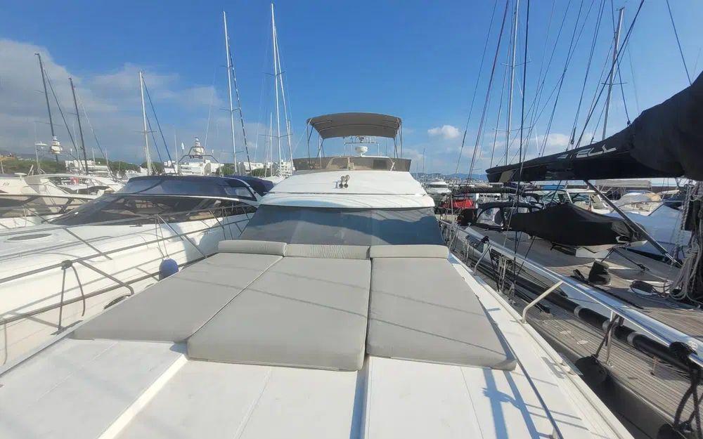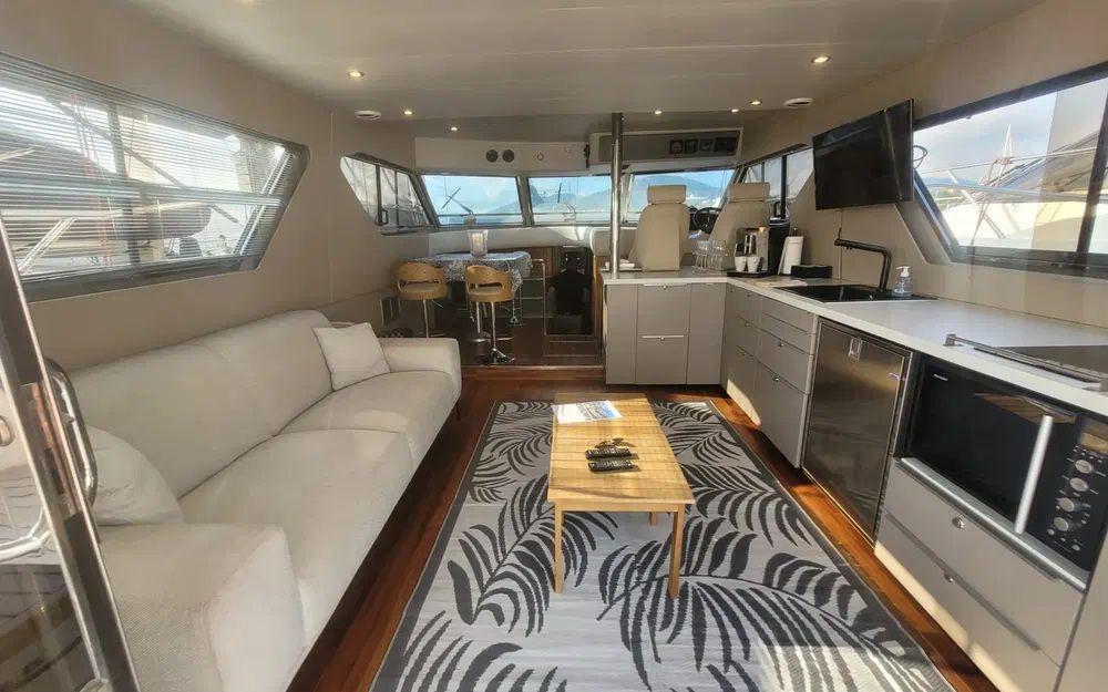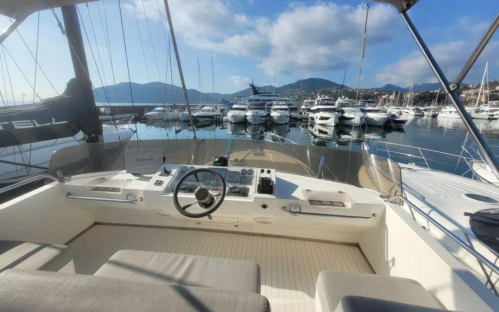 Dès l’embarquement, on découvre des volumes généreux et une circulation fluide, aussi bien à l’intérieur qu’à l’extérieur. Le cockpit, prolongé par une plateforme de bain en teck et une passerelle hydraulique, invite naturellement à la vie au mouillage. Le flybridge, spacieux et convivial, offre un excellent poste de pilotage et un espace détente idéal pour les navigations estivales.