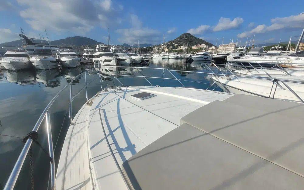 La carène éprouvée du Princess 55, associée à une motorisation bi-moteur Volvo Penta TAMD 122 D de 480 chevaux chacun, assure une navigation stable, rassurante et confortable. La vitesse de croisière recommandée d’environ 18 nœuds permet de longues traversées en toute sérénité. Les propulseurs d’étrave et de poupe, combinés aux flaps, rendent les manœuvres simples et précises, même en équipage réduit.