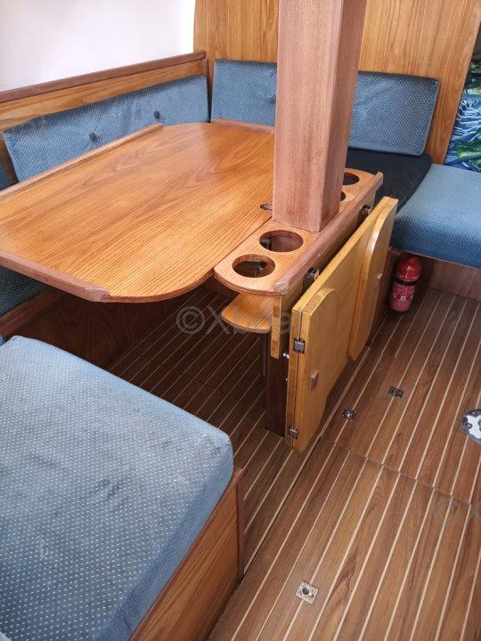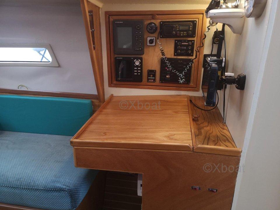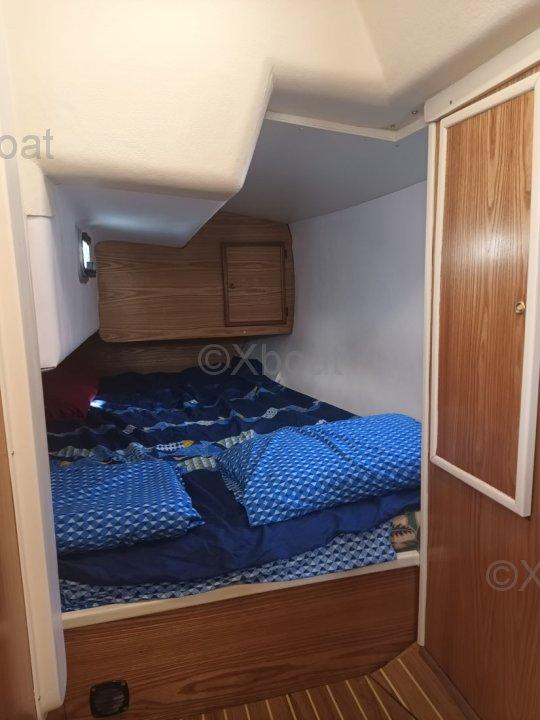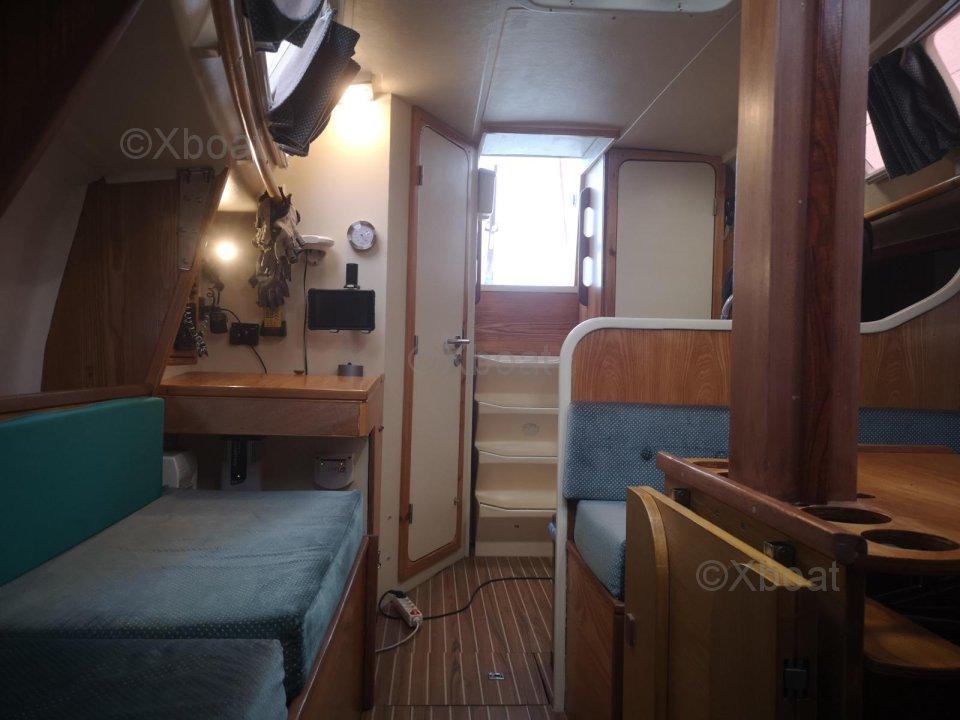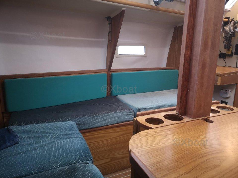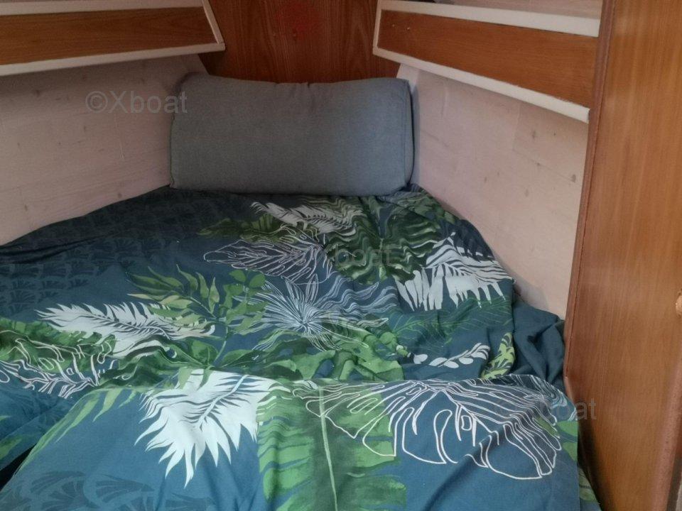 Aménagements : 2 Cabine Doubles + carré transformable - Couchage : 7 pers. ; 1 salle d’eau avec eau chaude au port (220v), WC - Cuve à eaux noire avec jauge à infra son Gobius, 1 dressing ; Cuisine : Réfrigérateur de classe tropical 12/220 v - Neuf (2025), Ensemble réchaud/Four, 2 bacs évier eau chaude + pédale eau de mer, réservoir 200L eau douce
