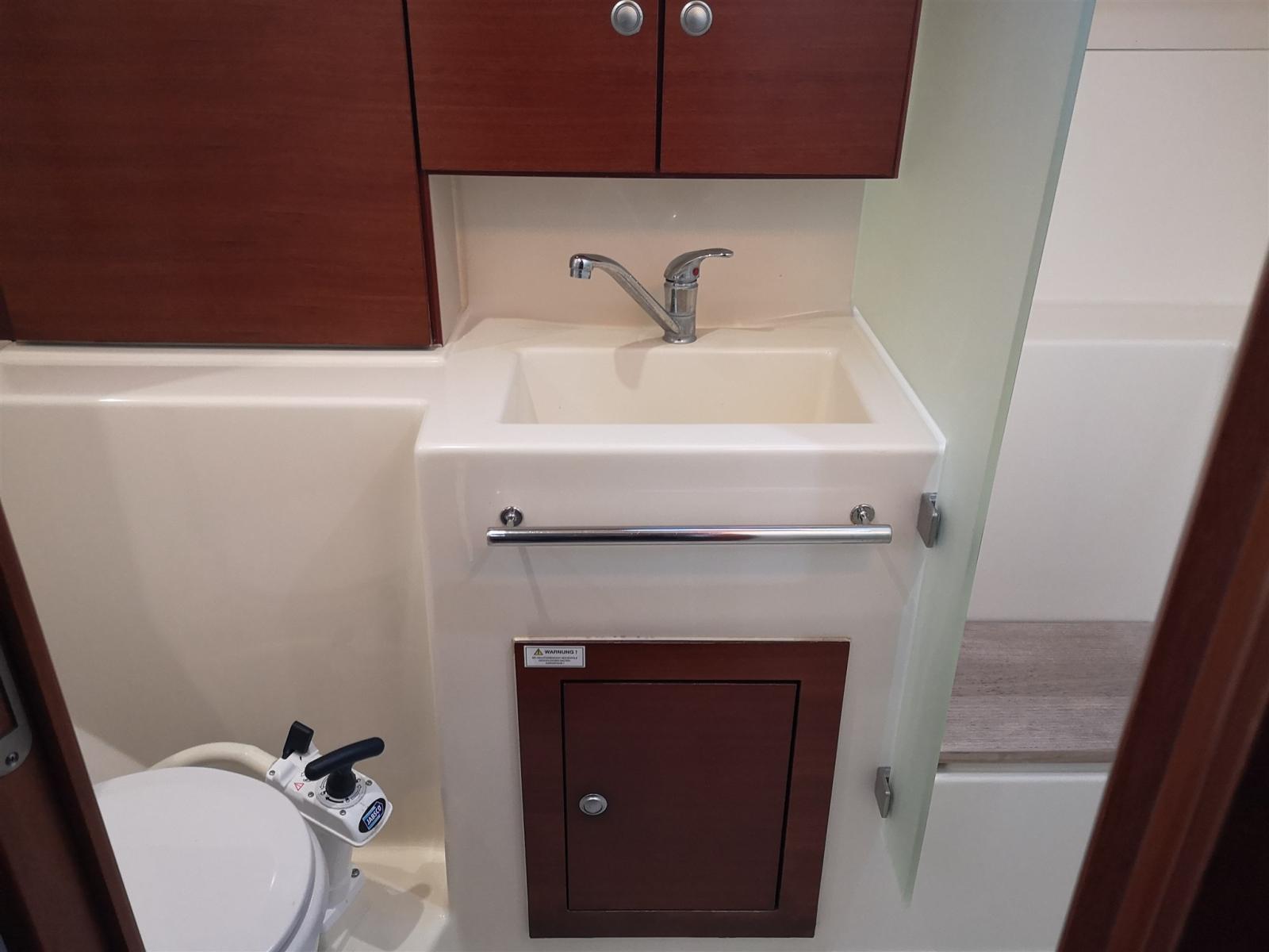 Cabine principale avec lit double, armoires et salle de bain privée avec lavabo, toilettes manuelles et douche