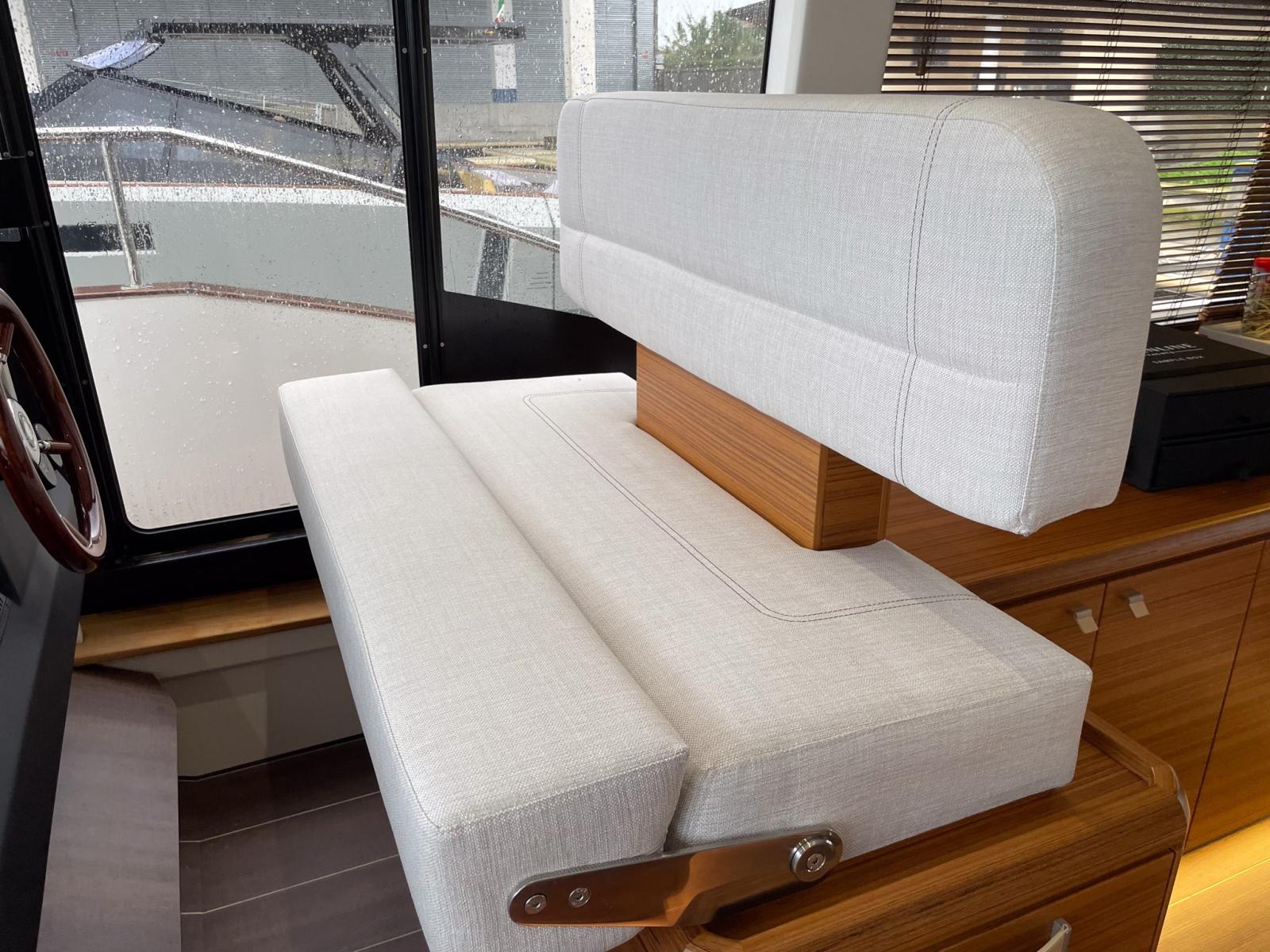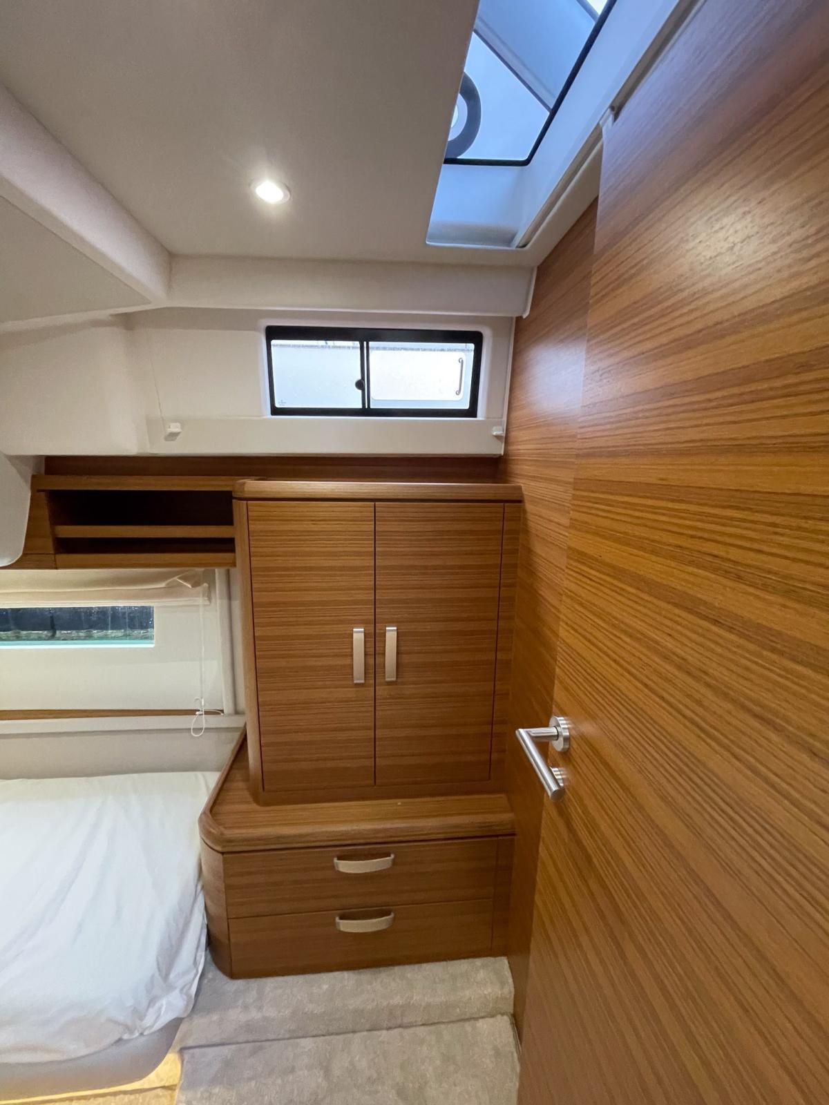 Couleur de la coque : Blanc pur (RAL 9010) + couleur de cabine Blanc pur (RAL 9010) - Disposition du salon : buffet incluant décodeur - Sellerie en tissu Rugana CRÈME - Sellerie en tissu Rugana GREY - Mobilier en teck doré avec détails en cuir blanc et moquette de sable, sol stratifié foncé - Pack électrique Greenline : 2 panneaux photovoltaïques dans le deckhouse, environ 280 W chacun, 3 x batteries de service Victron LiFePo 160Ah (5,76 kW), chargeur automatique onduleur 12V/5000VA/120A (système embarqué permanent 230V), système de contrôle Greenline App