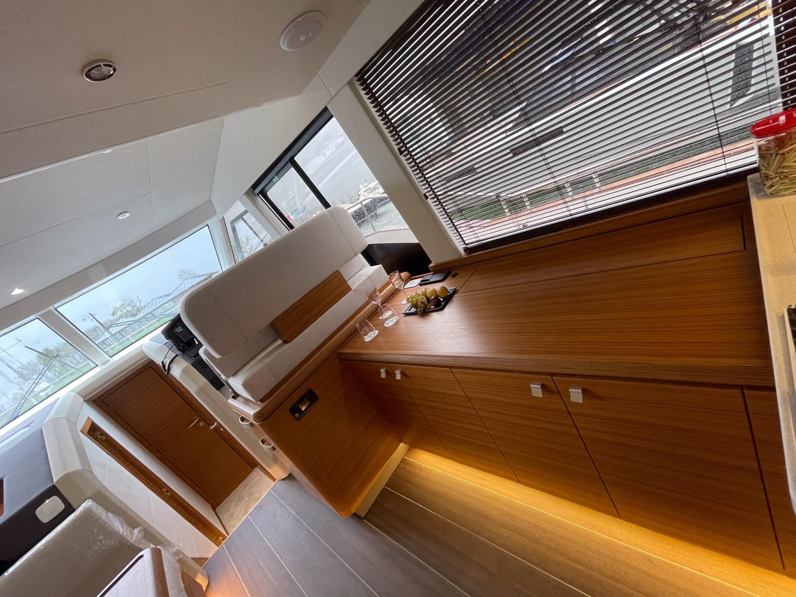 3 cabines, 2 salles de bain de luxe avec 2 douches séparées (au lieu de 3 salles de bain attenantes) - Cabine principale sur île/lit de confort - Disposition du salon avec buffet à droite - Stores vénitiens en bois couleur teck doré - Tissu Rugana CRÈME - Meubles en teck doré incluant des détails en cuir blanc et moquette sablée, sol stratifié foncé - Sols rayés