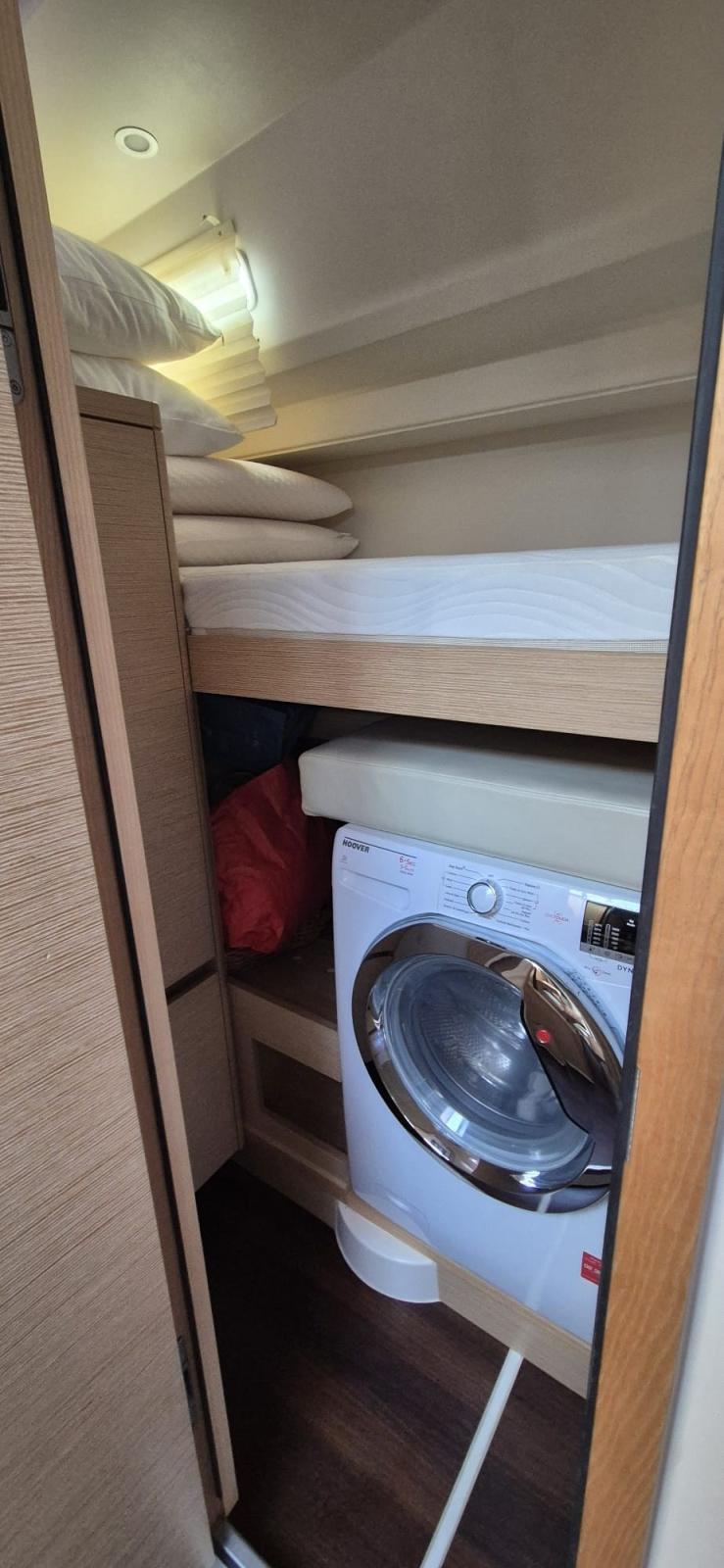Cabine avec lits superposés, 1 lit supprimé pour installer la machine à laver-sèche-linge et créer des compartiments de rangement. Améliorez le matelas à ressorts/mémoire de forme « confort »