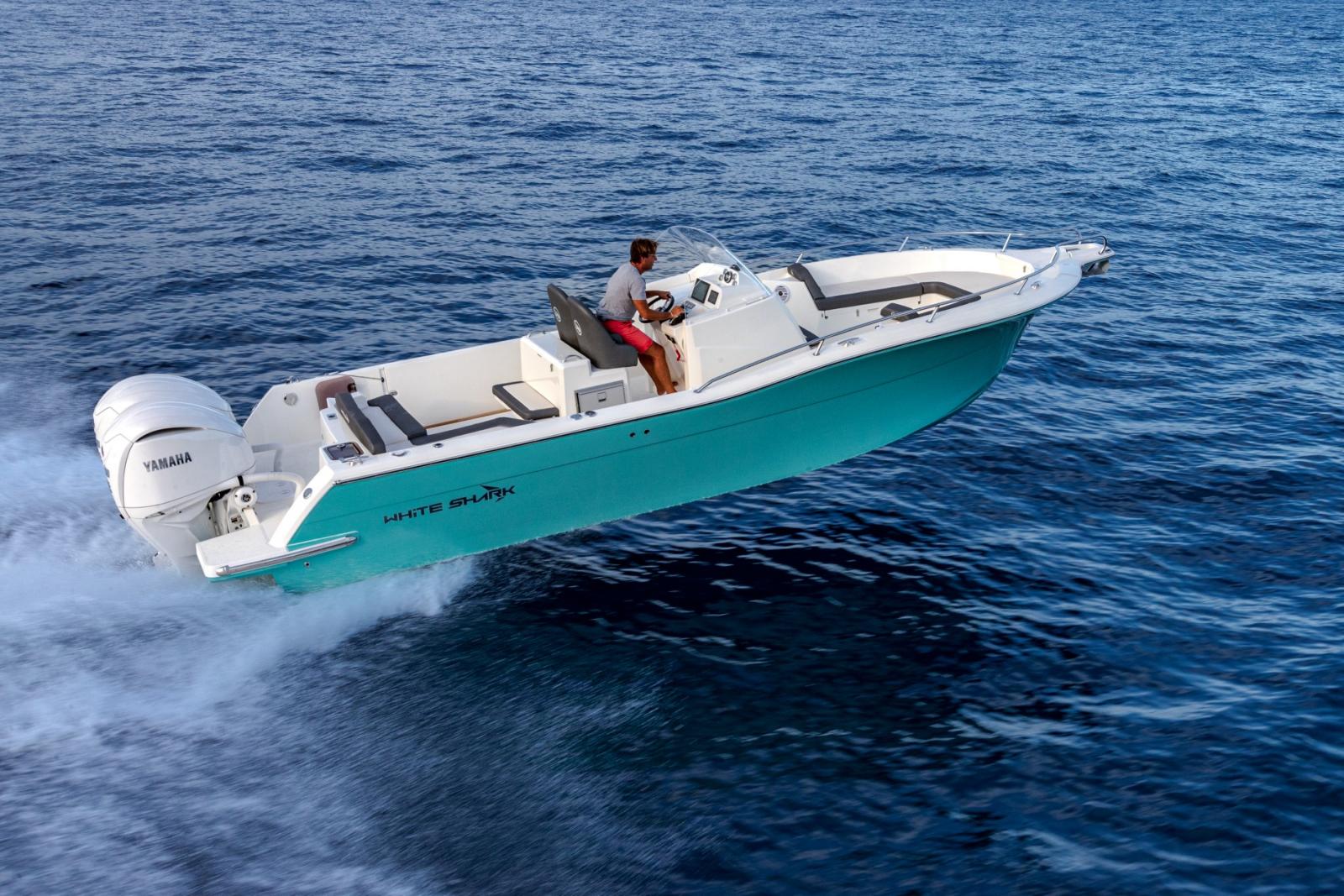 Le White Shark 280 cc Evo est un bateau très accueillant et confortable avec un carré dinette sur le cockpit, un leaning post avec évier, un carré avant transformable en bain de soleil, un pavois ouvrant à babord et de grandes plateformes arrières pour un accès à la mer confortable. Avec une longueur de 8,75 mètres, cet exemplaire respecte et sublime l'ADN White Shark.