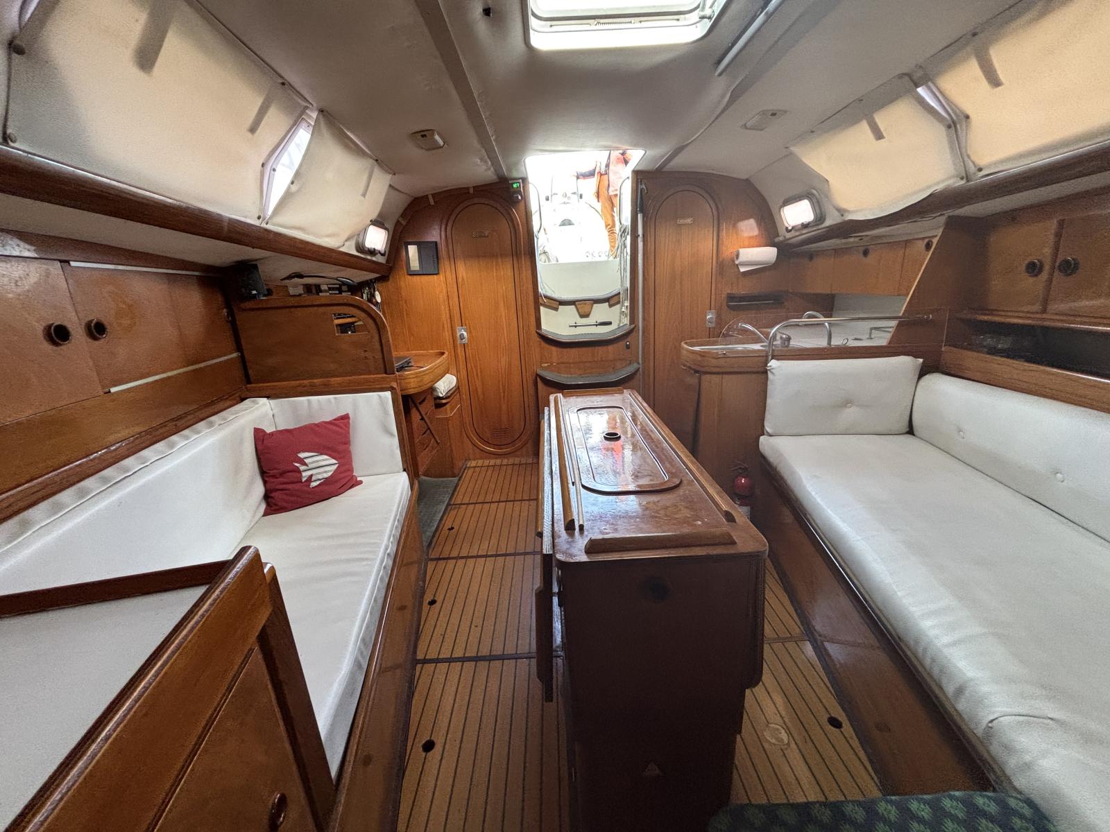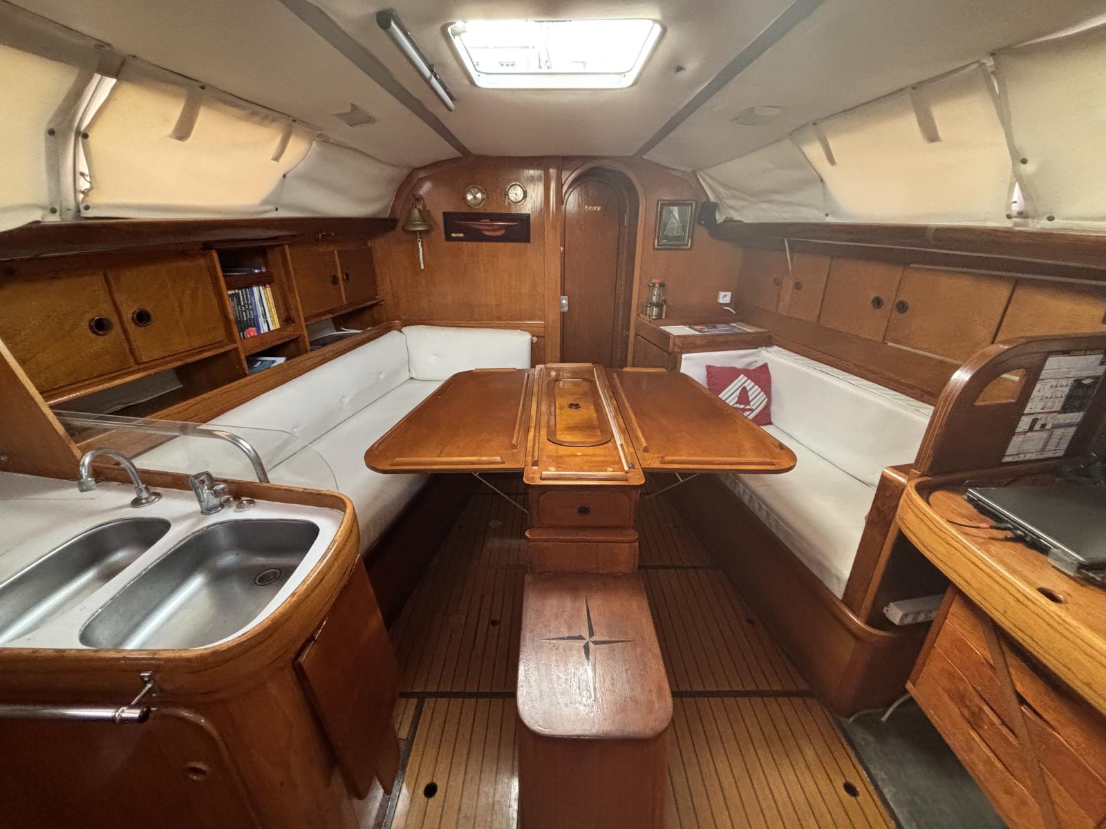 L'intérieur est composé d'un carré spacieux et lumineux avec une table centrale, des rangements optimisés, 3 cabines doubles, d'une salle d'eau avec wc.