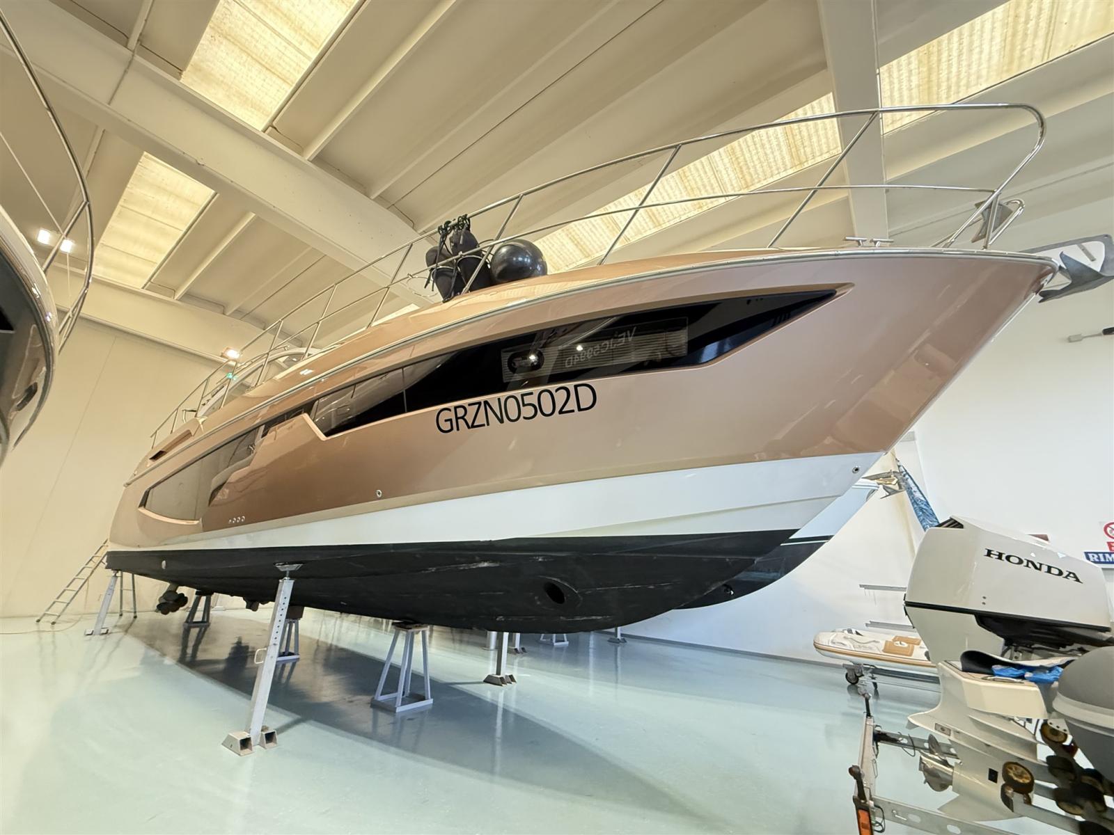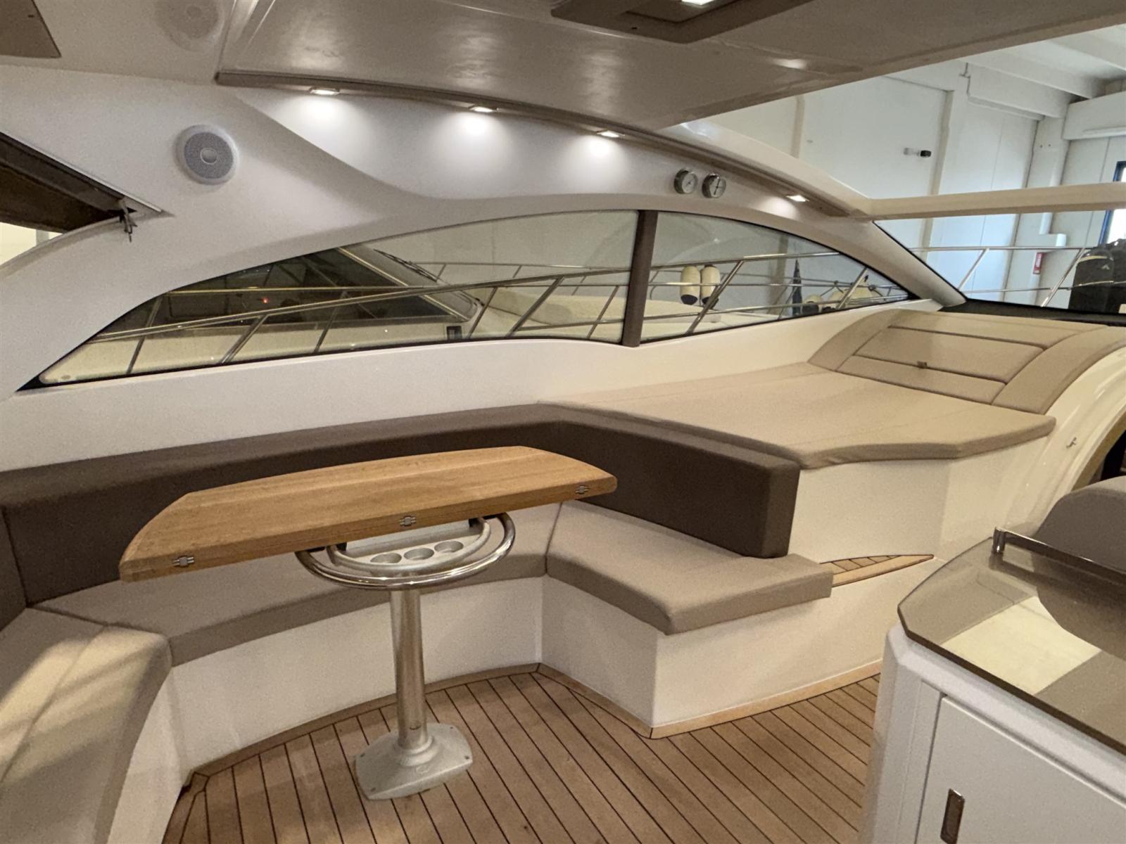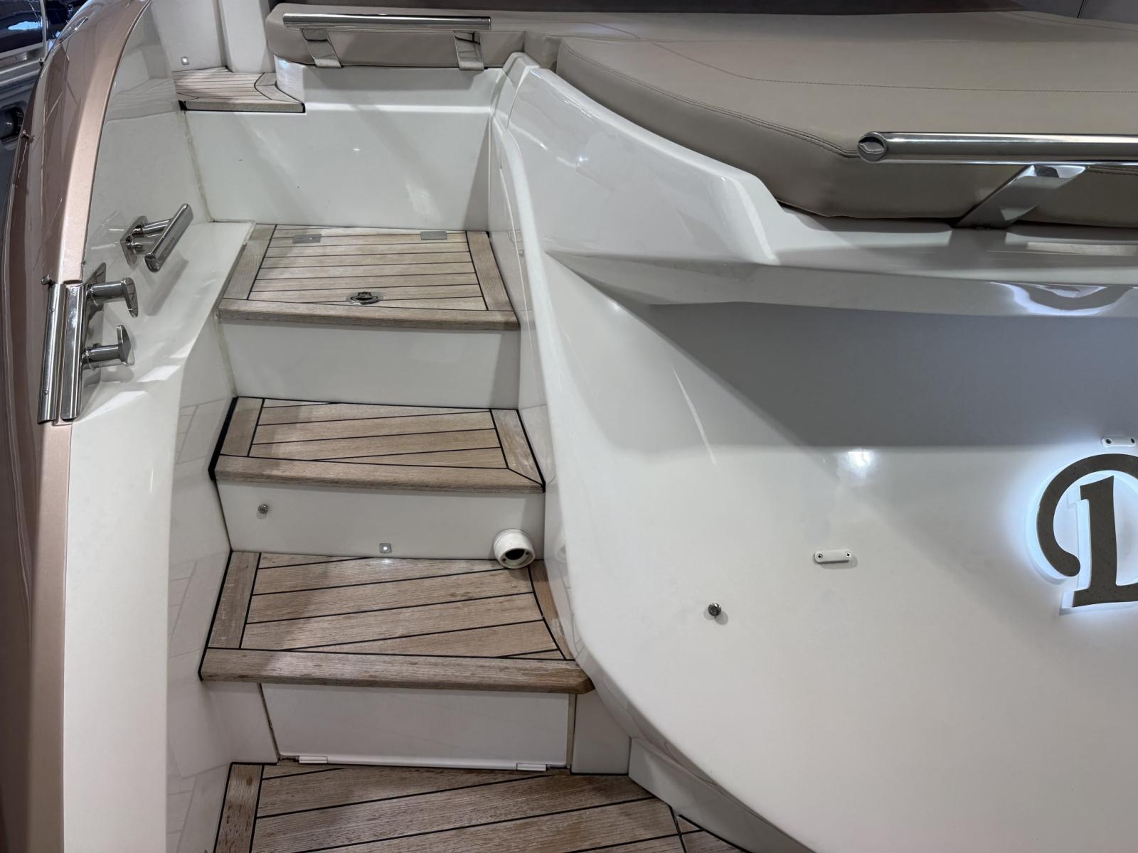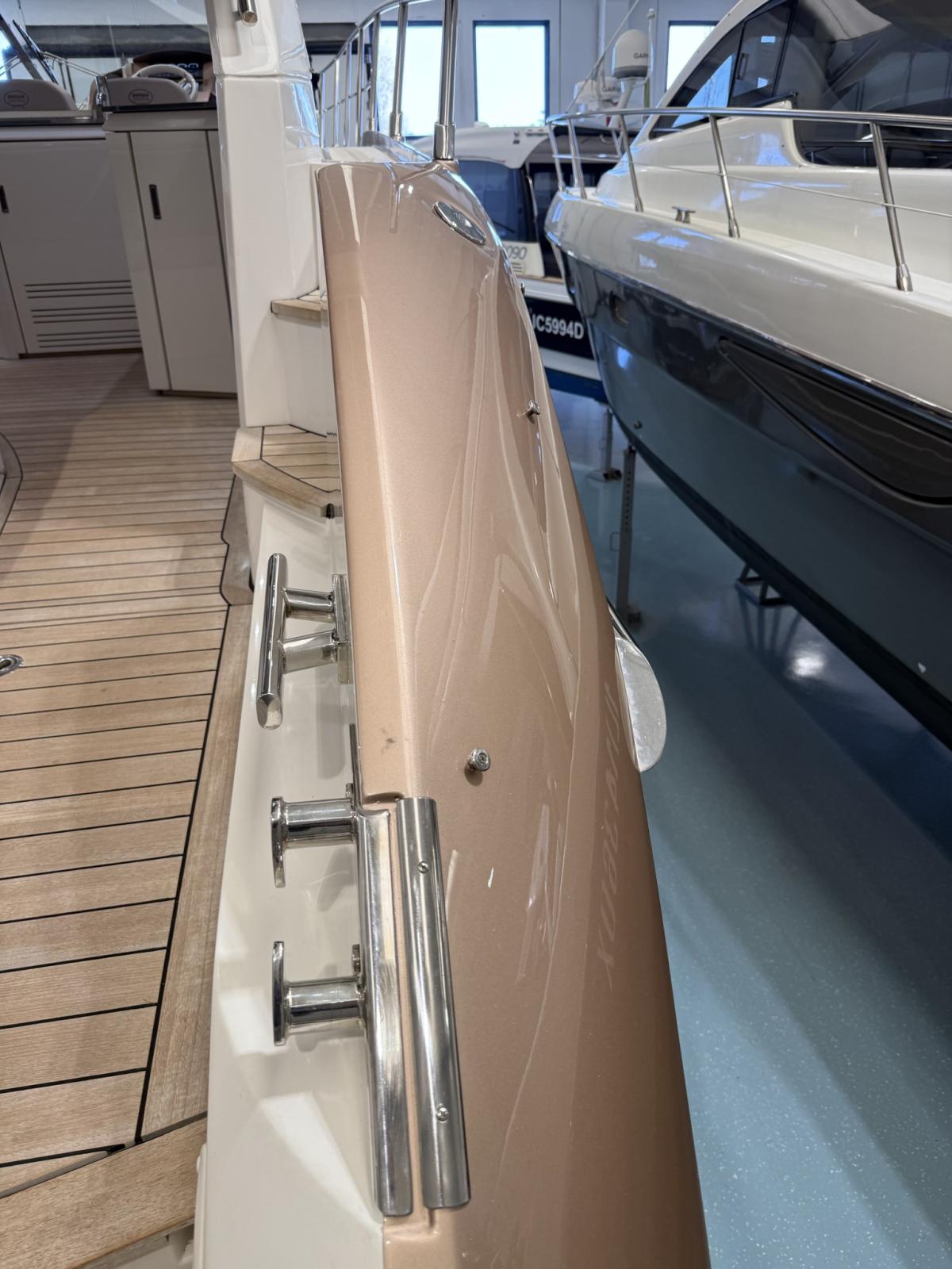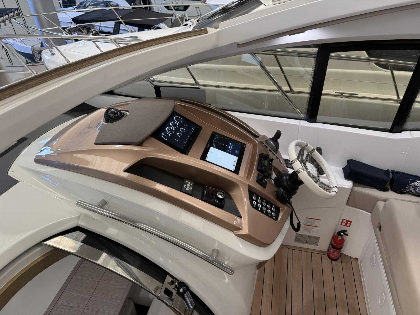 Alarme moteur, Alarme de pompe de cale, Ouverture du compartiment moteur électrique, Eau sous pression, Douche de cockpit, Phare de poursuite, Flaps hydrauliques, Garage à annexe, Hard top, Extincteur(s) fixe(s), Indicateurs de flaps, Lavabo dans le cockpit, Éclairage de courtoisie, Spots sous-marins, Passerelle, Plateforme arrière, Cockpit en teck, Prise de quai, Guindeau électrique, Echelle de bain, table de cockpit, Corne.