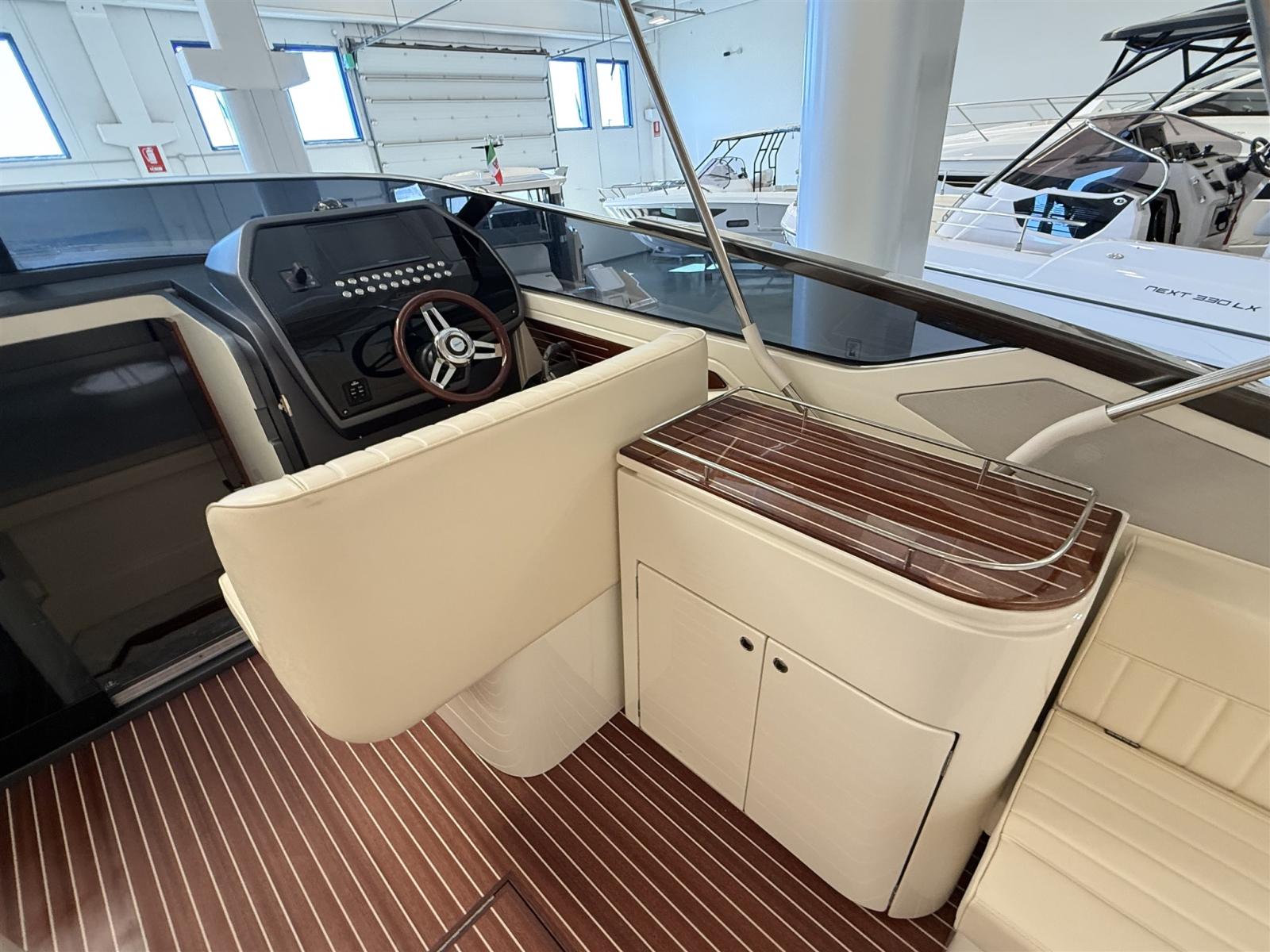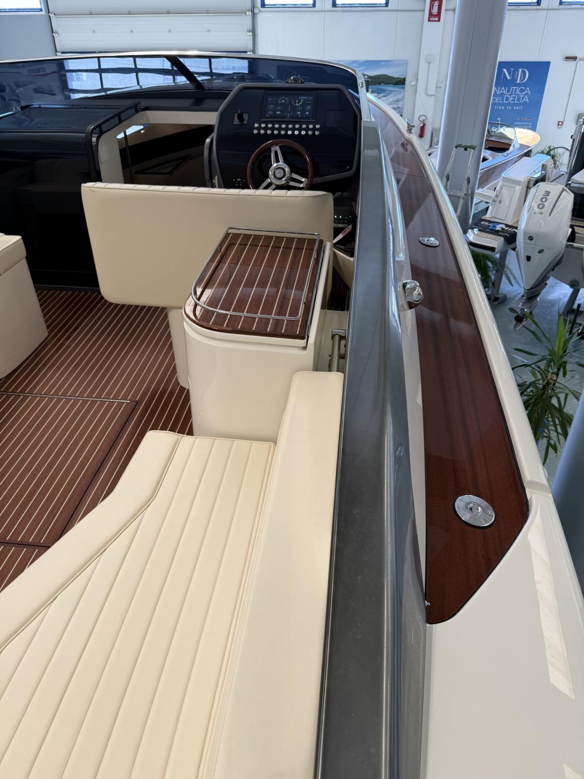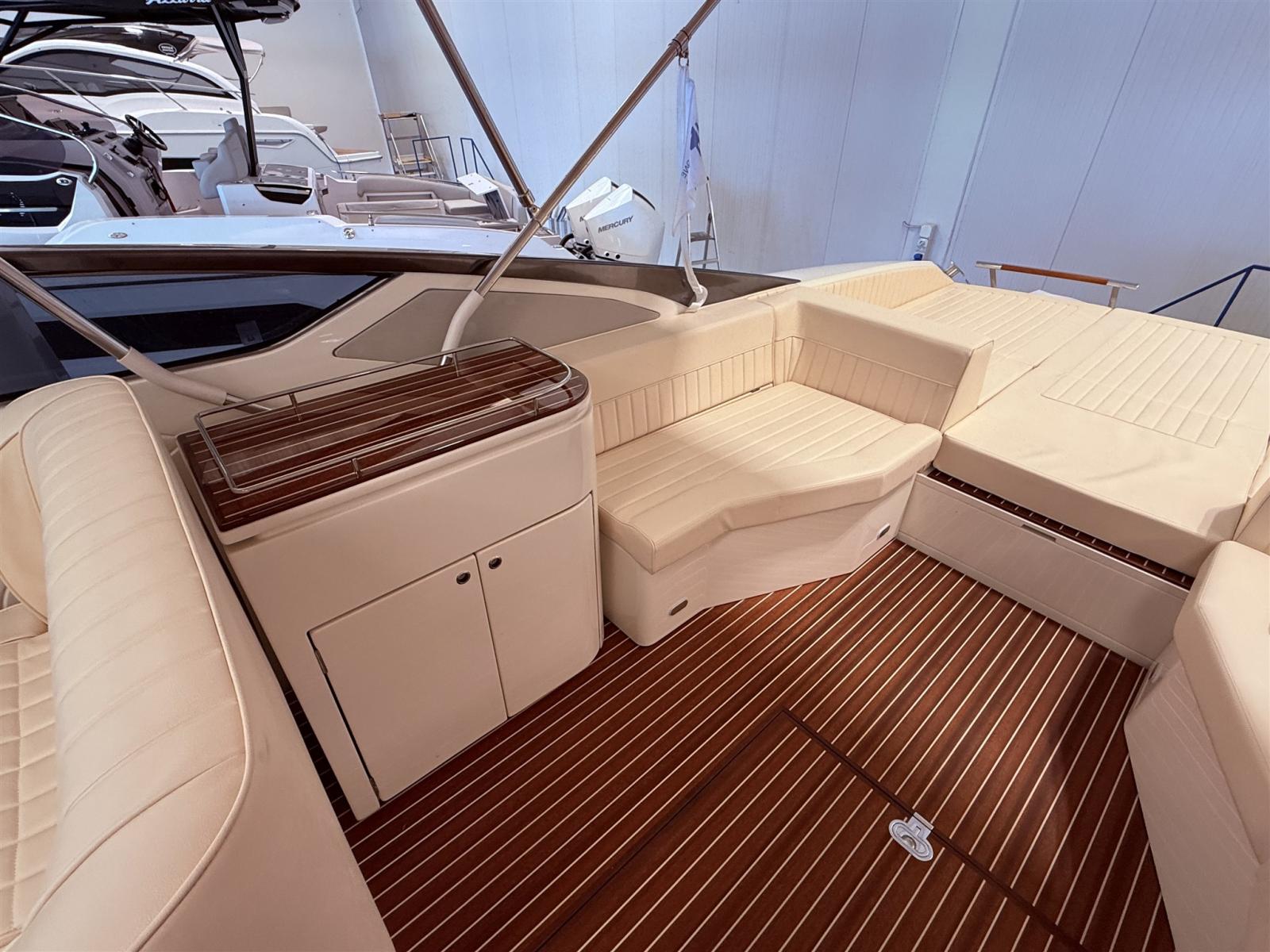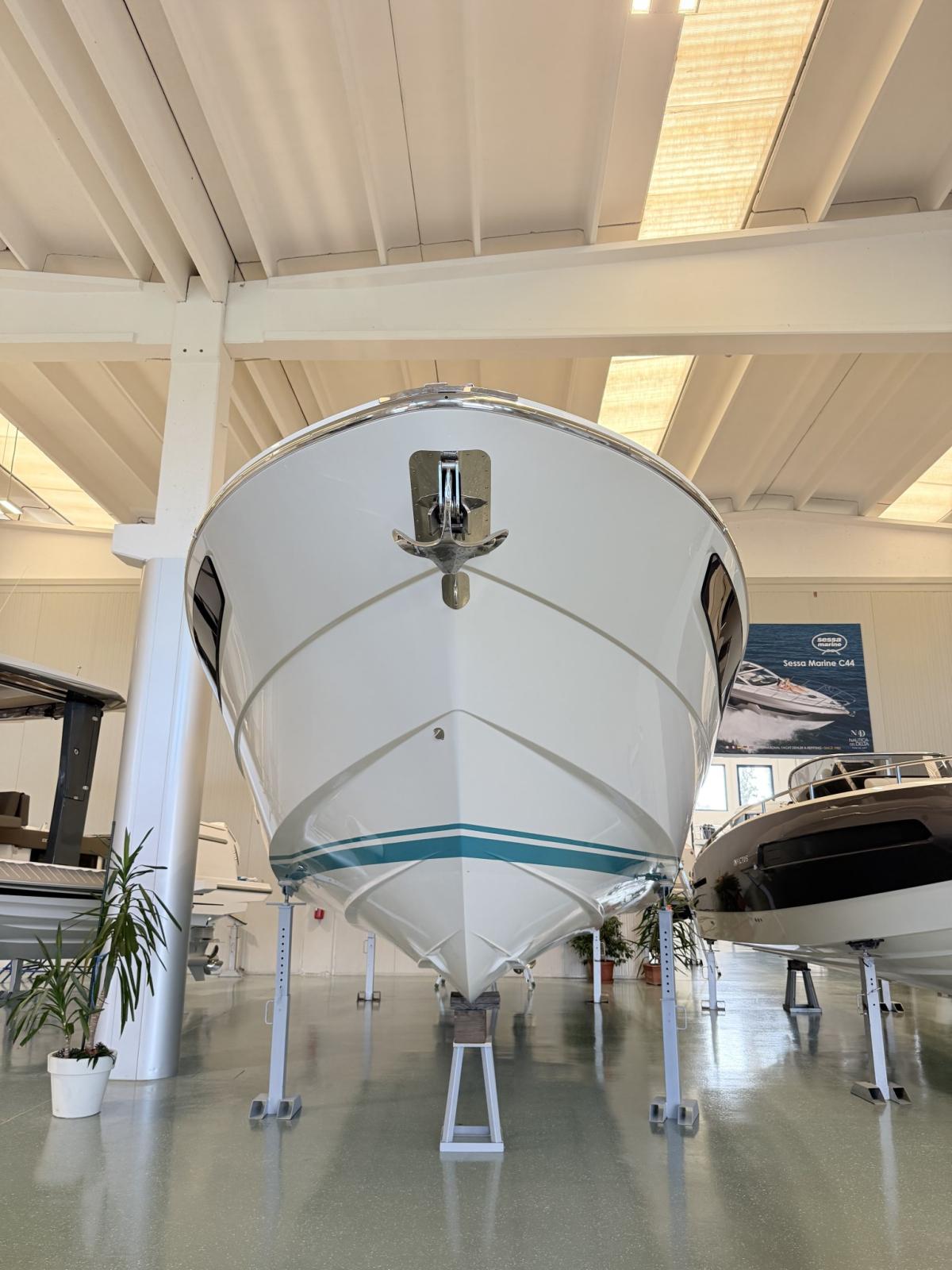 Alarme moteur, Alarme de pompe de cale, Ouverture du compartiment moteur électrique, Eau sous pression, Couleur spéciale, Flaps hydrauliques, Extincteur(s) fixe(s), Éclairage de courtoisie, Spots sous-marins (blu), Plateforme arrière, Prise de quai, Guindeau électrique, Echelle de bain, Corne.