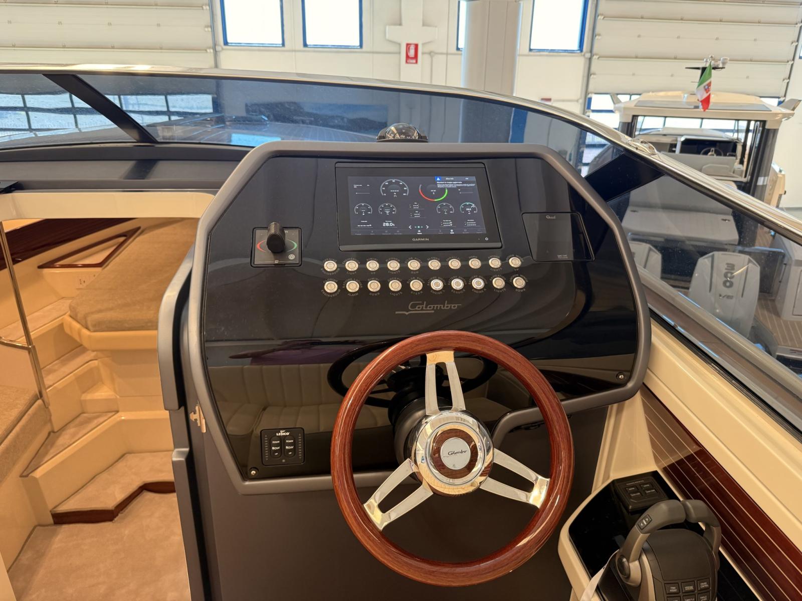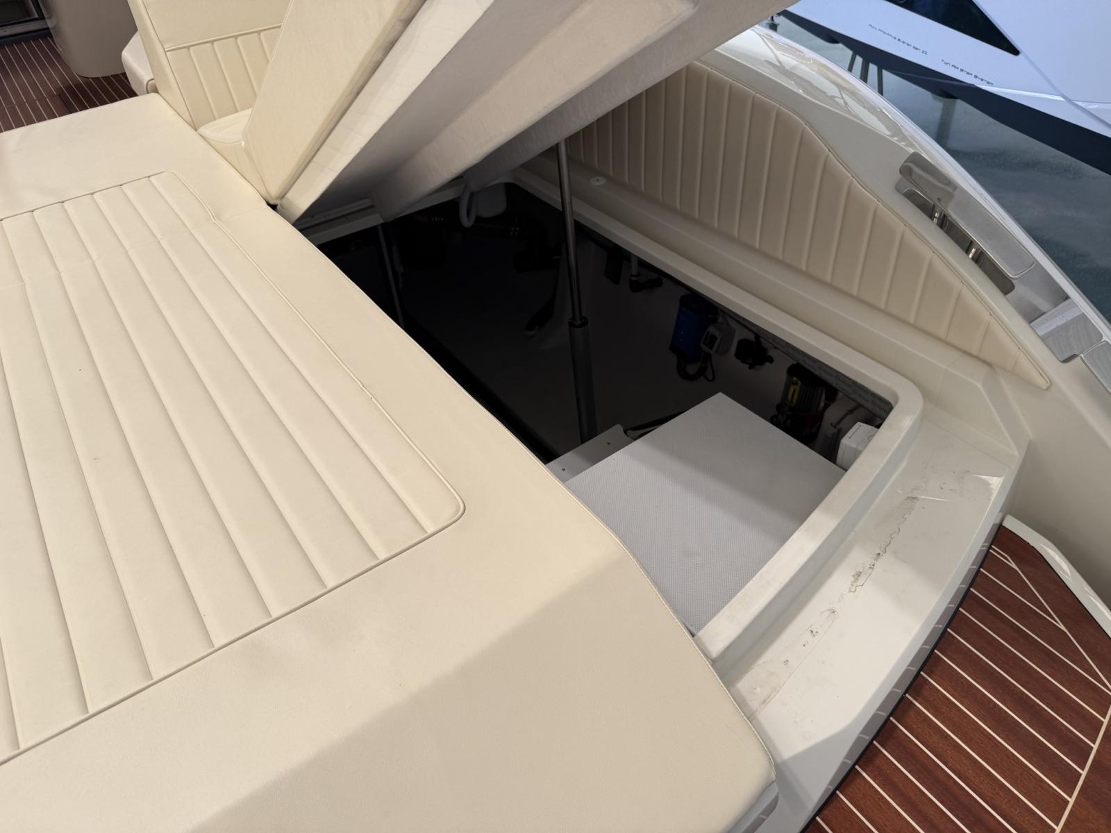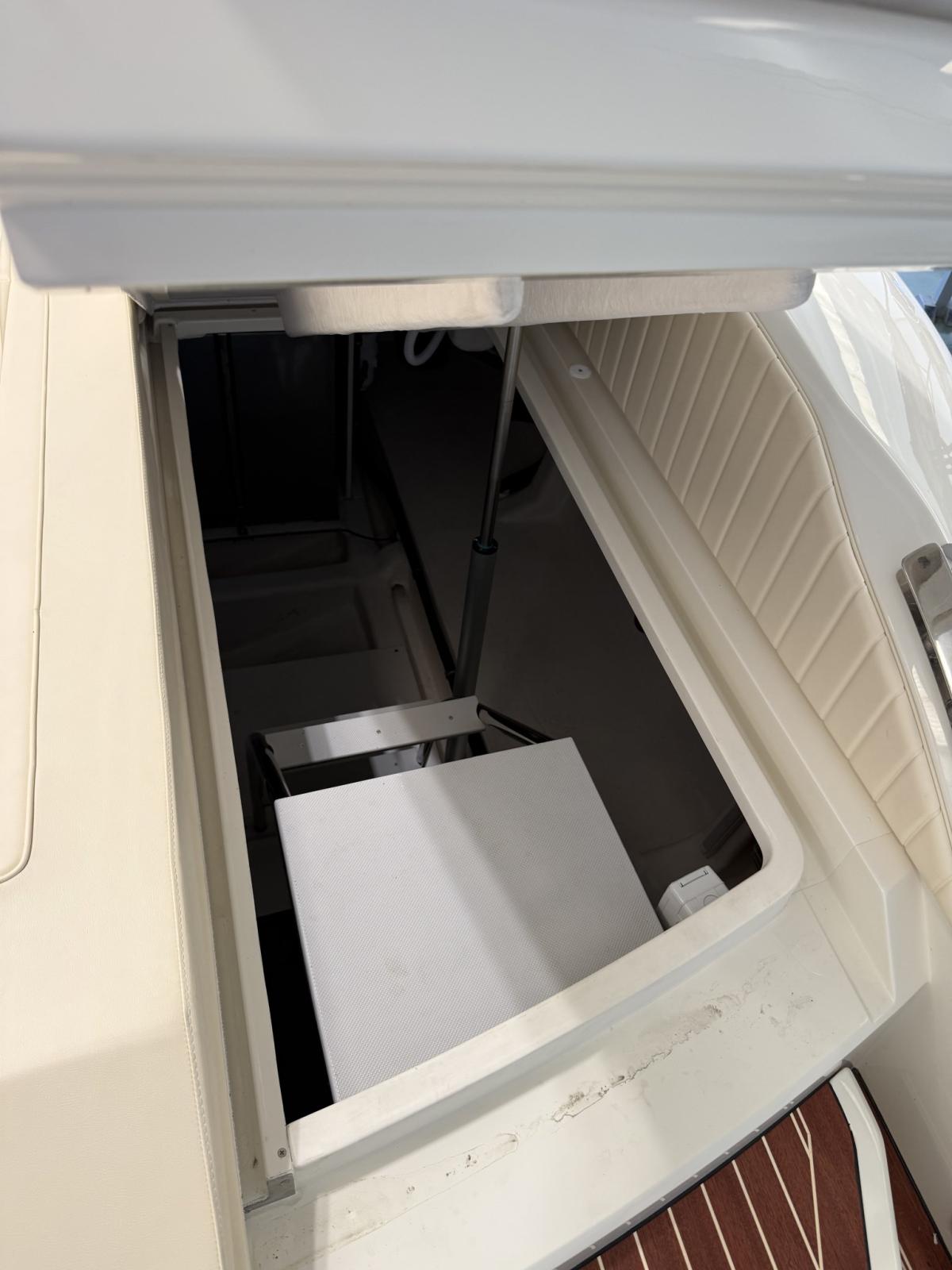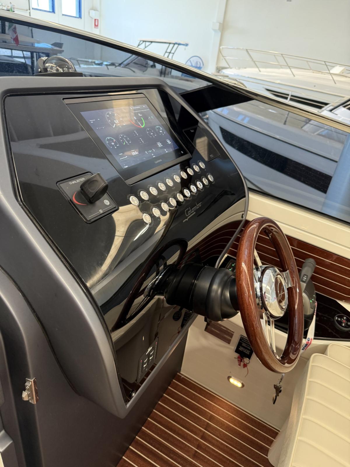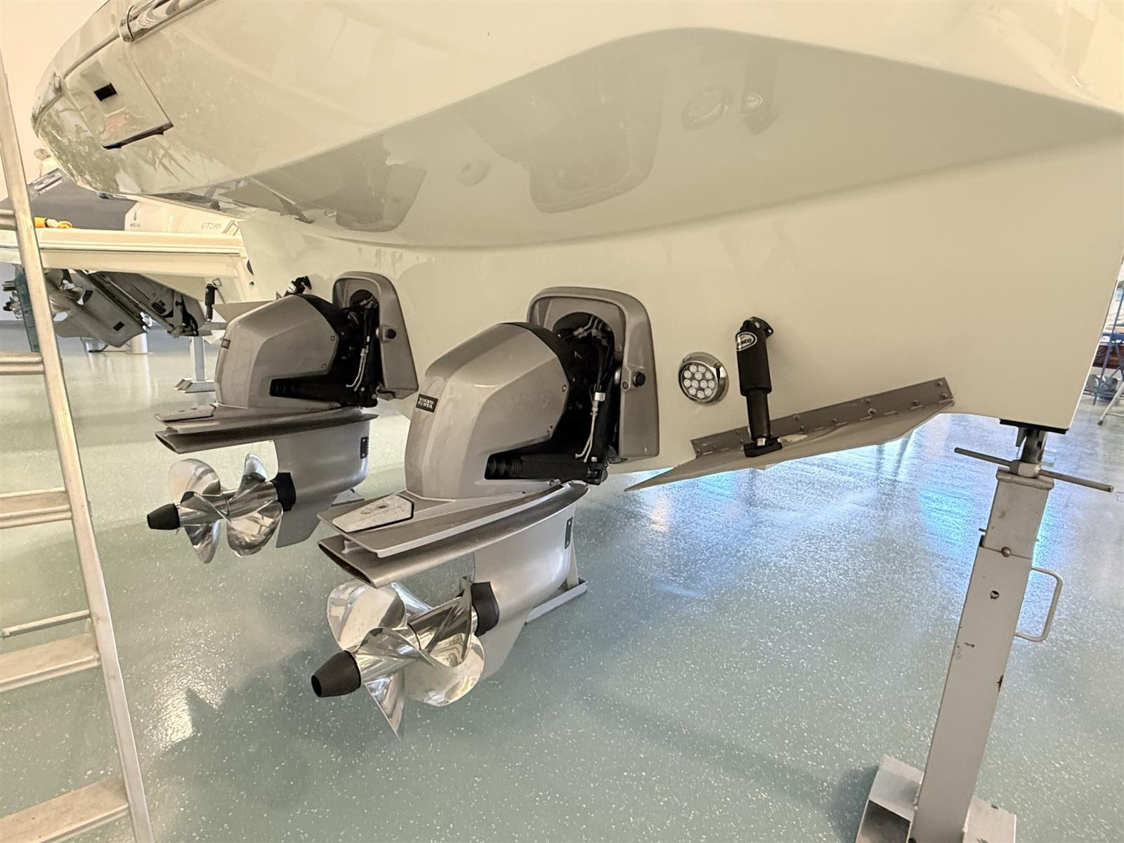 Alarme moteur, Alarme de pompe de cale, Ouverture du compartiment moteur électrique, Eau sous pression, Couleur spéciale, Flaps hydrauliques, Extincteur(s) fixe(s), Éclairage de courtoisie, Spots sous-marins (blu), Plateforme arrière, Prise de quai, Guindeau électrique, Echelle de bain, Corne.