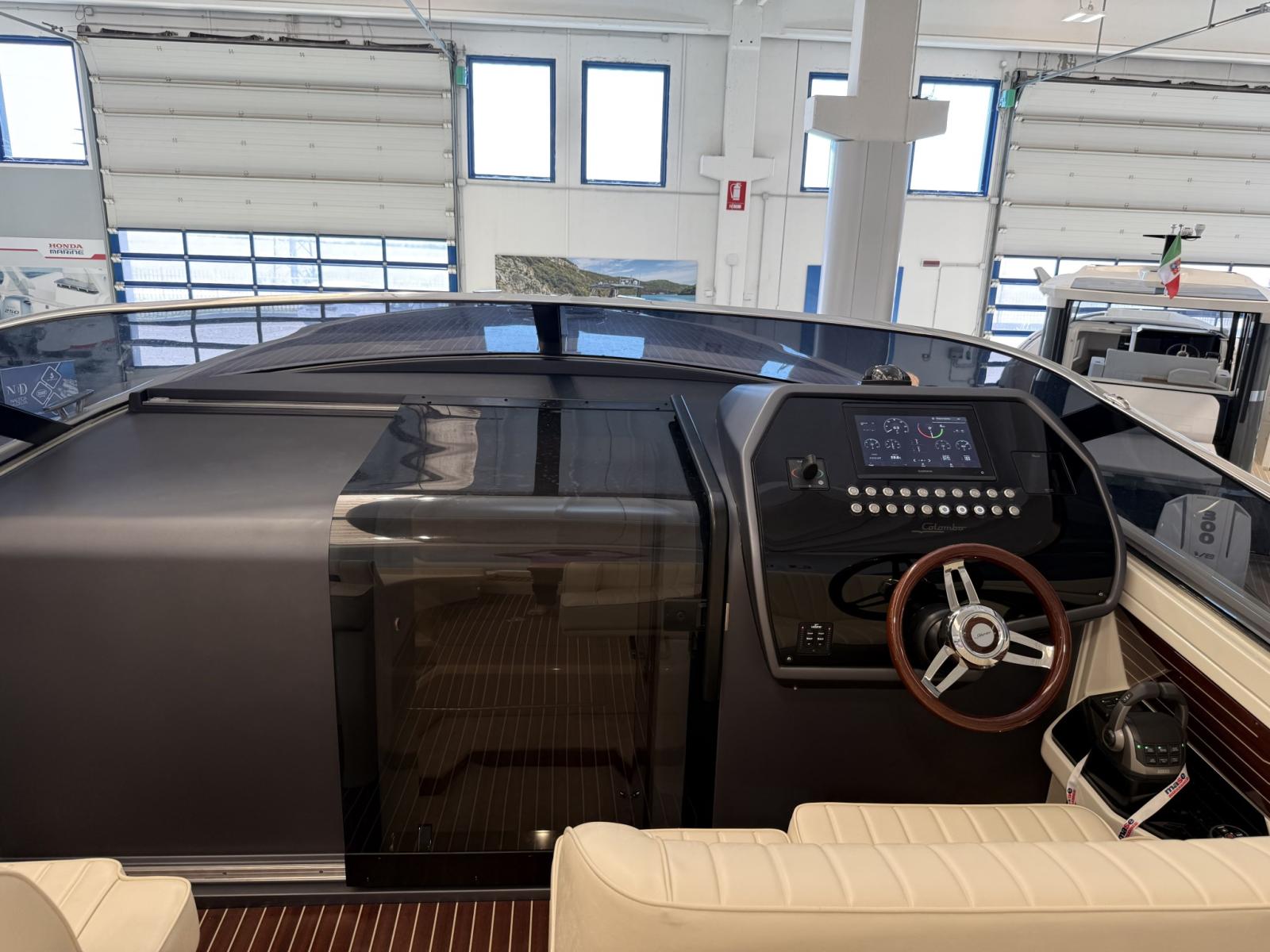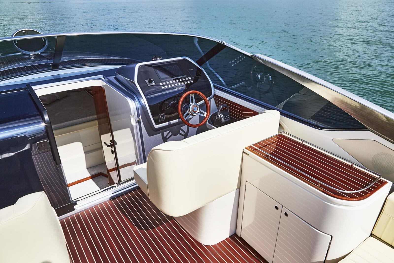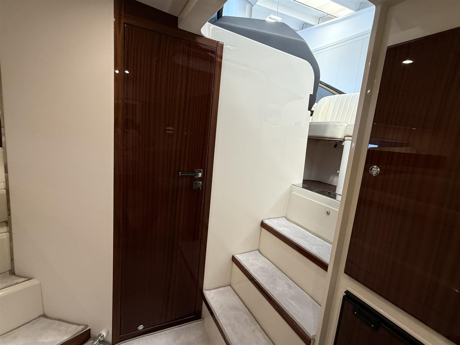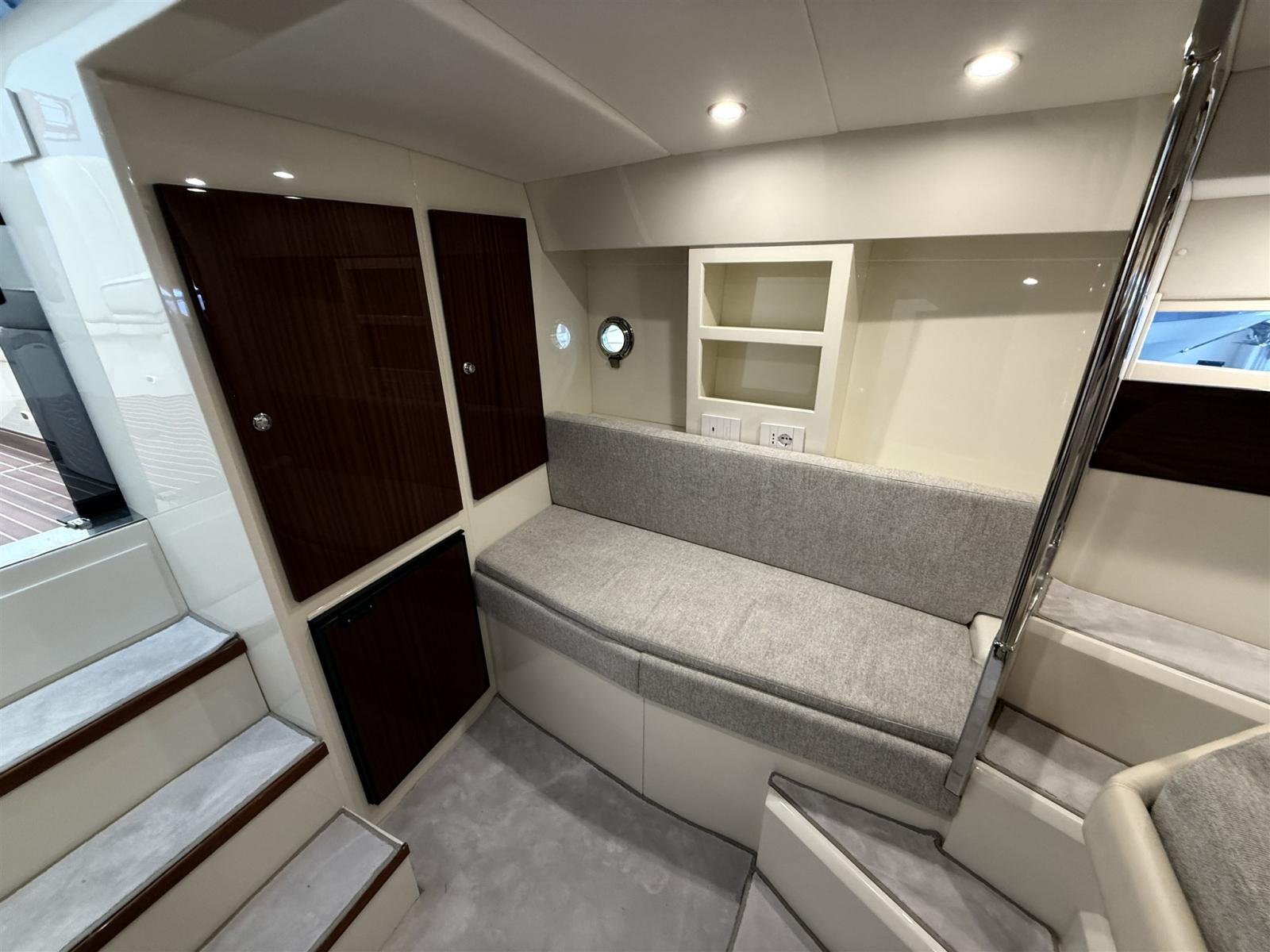 Alarme moteur, Alarme de pompe de cale, Ouverture du compartiment moteur électrique, Eau sous pression, Couleur spéciale, Flaps hydrauliques, Extincteur(s) fixe(s), Éclairage de courtoisie, Spots sous-marins (blu), Plateforme arrière, Prise de quai, Guindeau électrique, Echelle de bain, Corne.