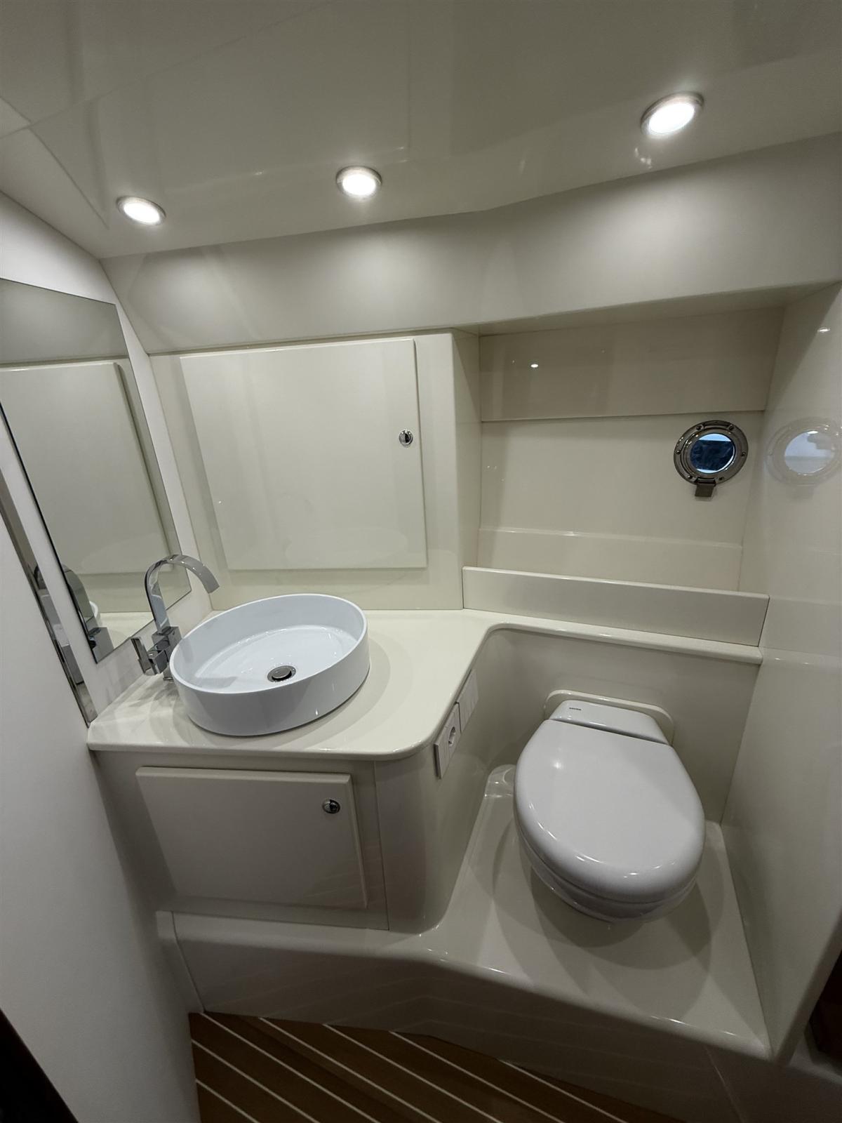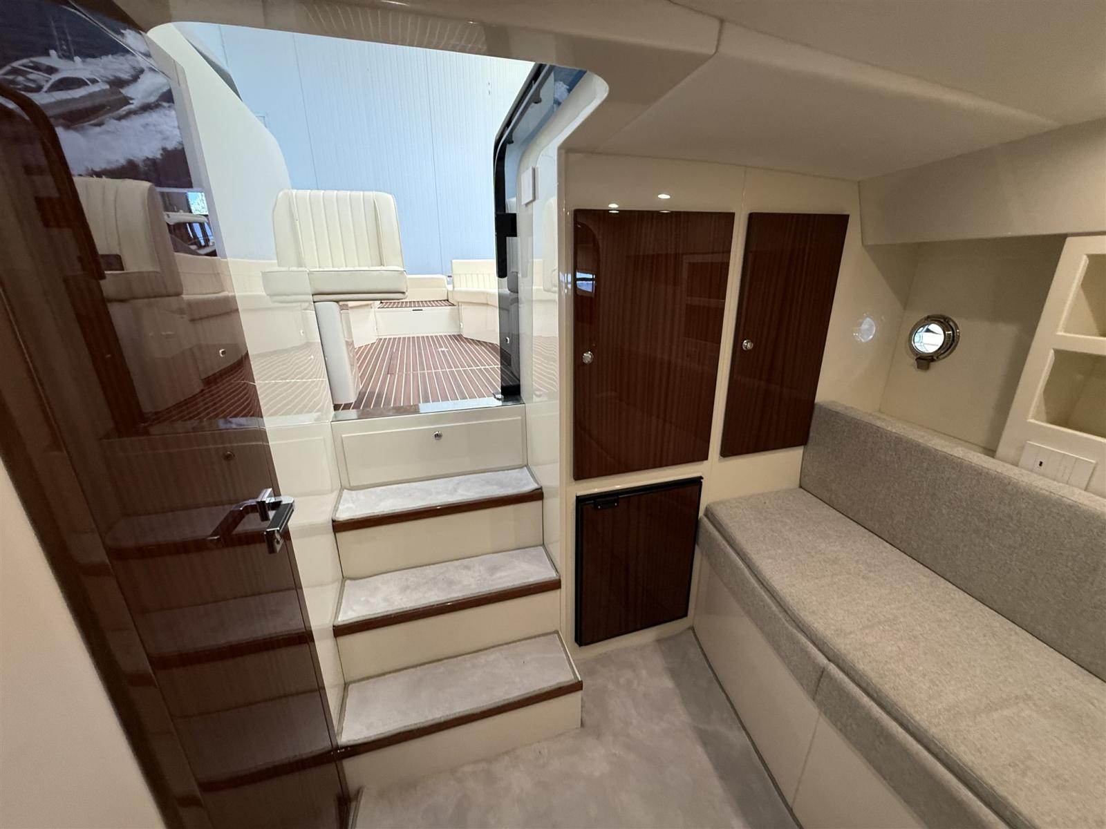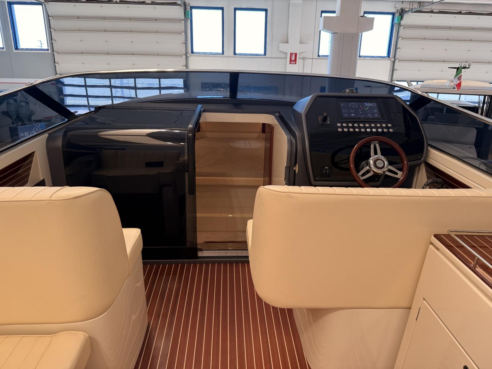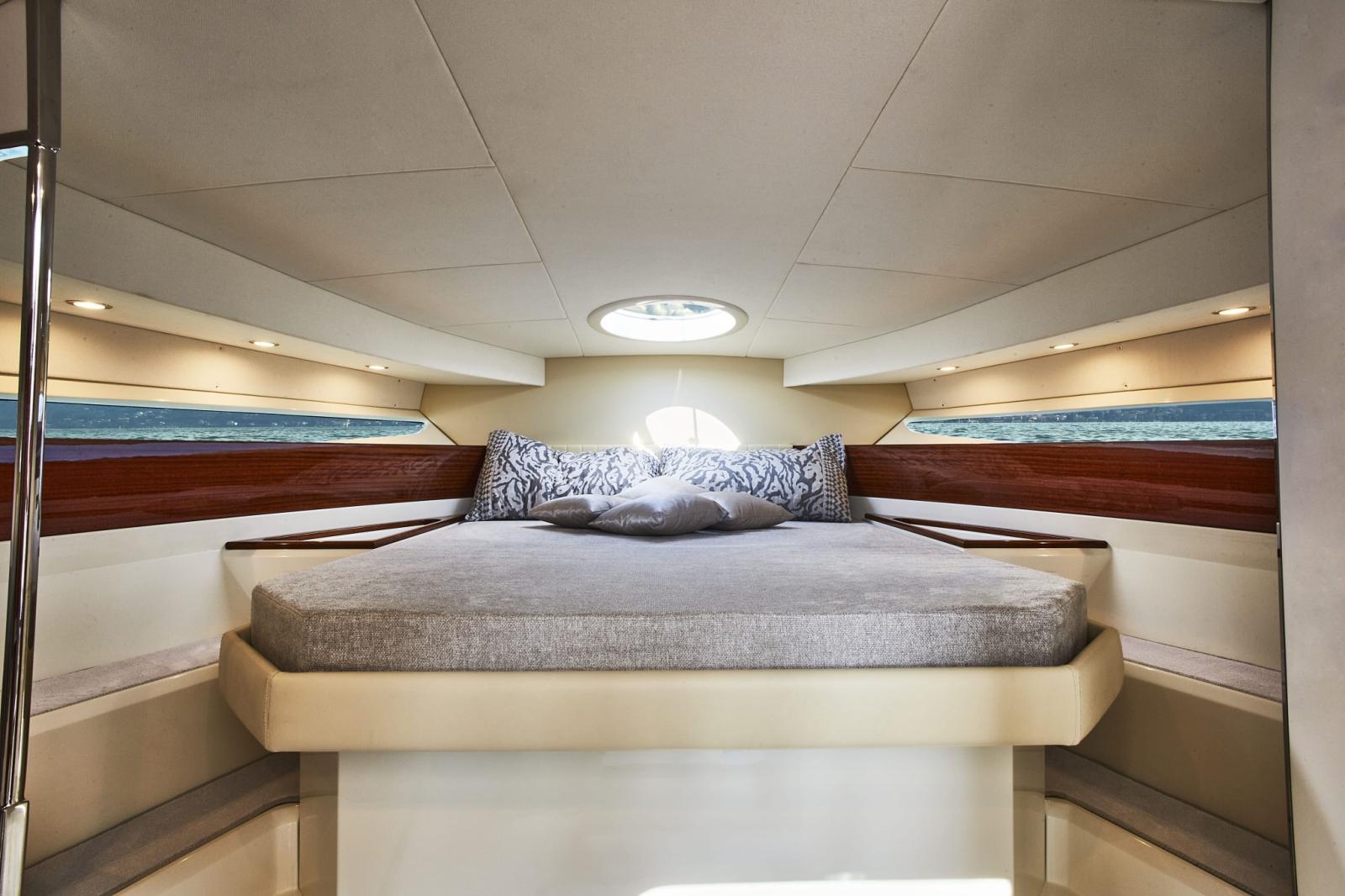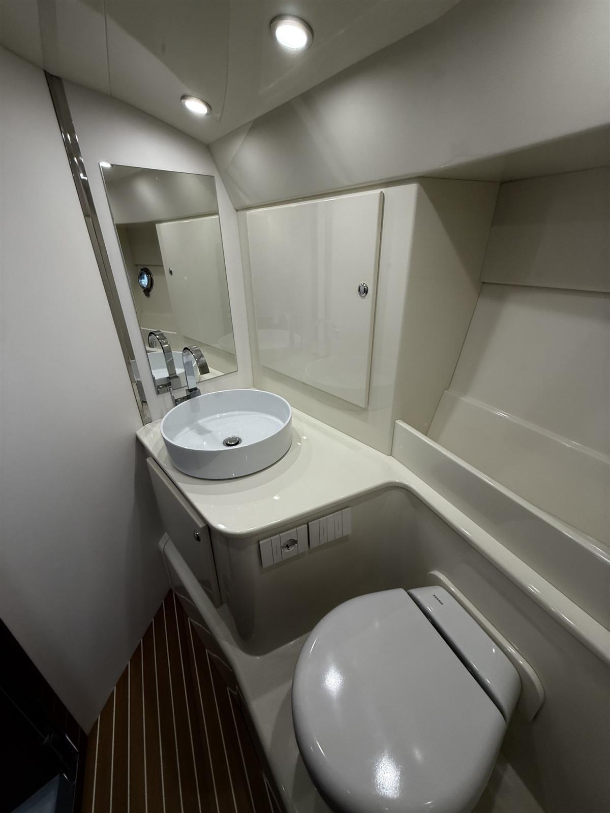 Alarme moteur, Alarme de pompe de cale, Ouverture du compartiment moteur électrique, Eau sous pression, Couleur spéciale, Flaps hydrauliques, Extincteur(s) fixe(s), Éclairage de courtoisie, Spots sous-marins (blu), Plateforme arrière, Prise de quai, Guindeau électrique, Echelle de bain, Corne.