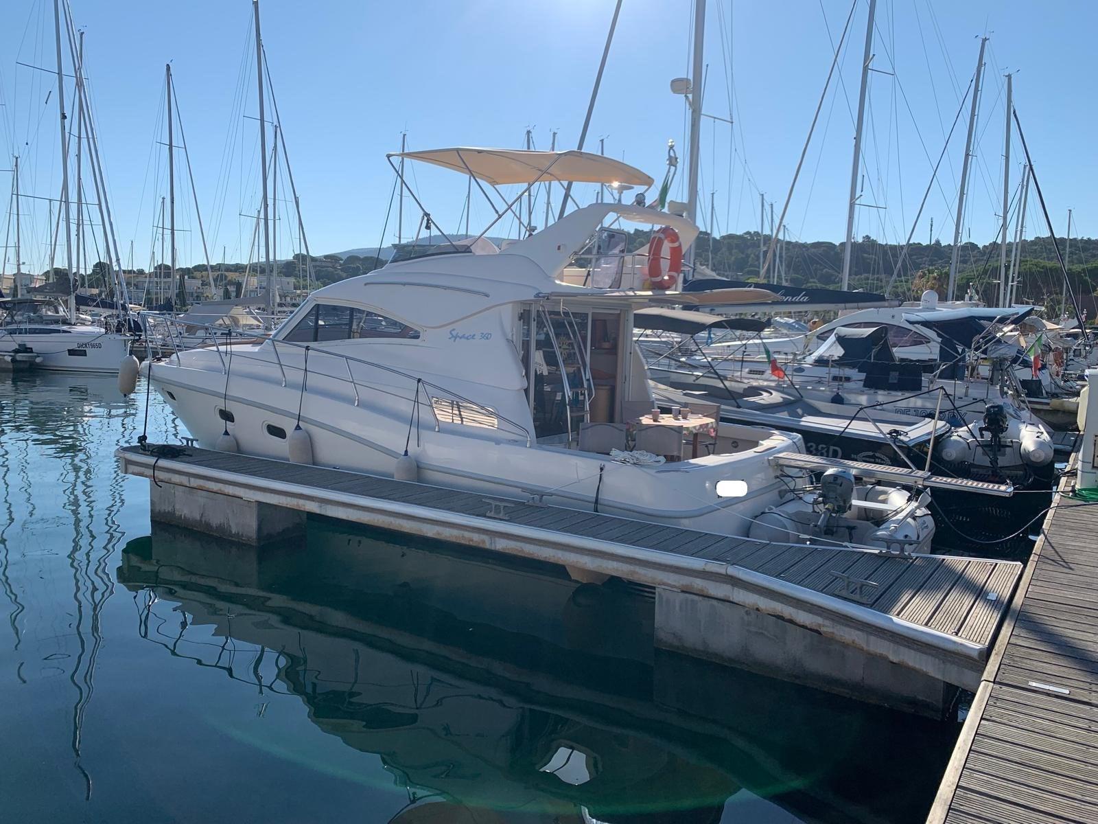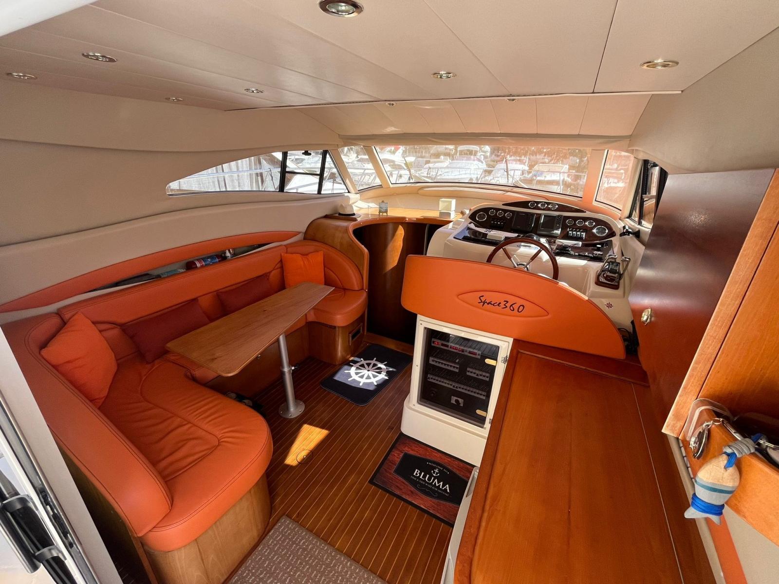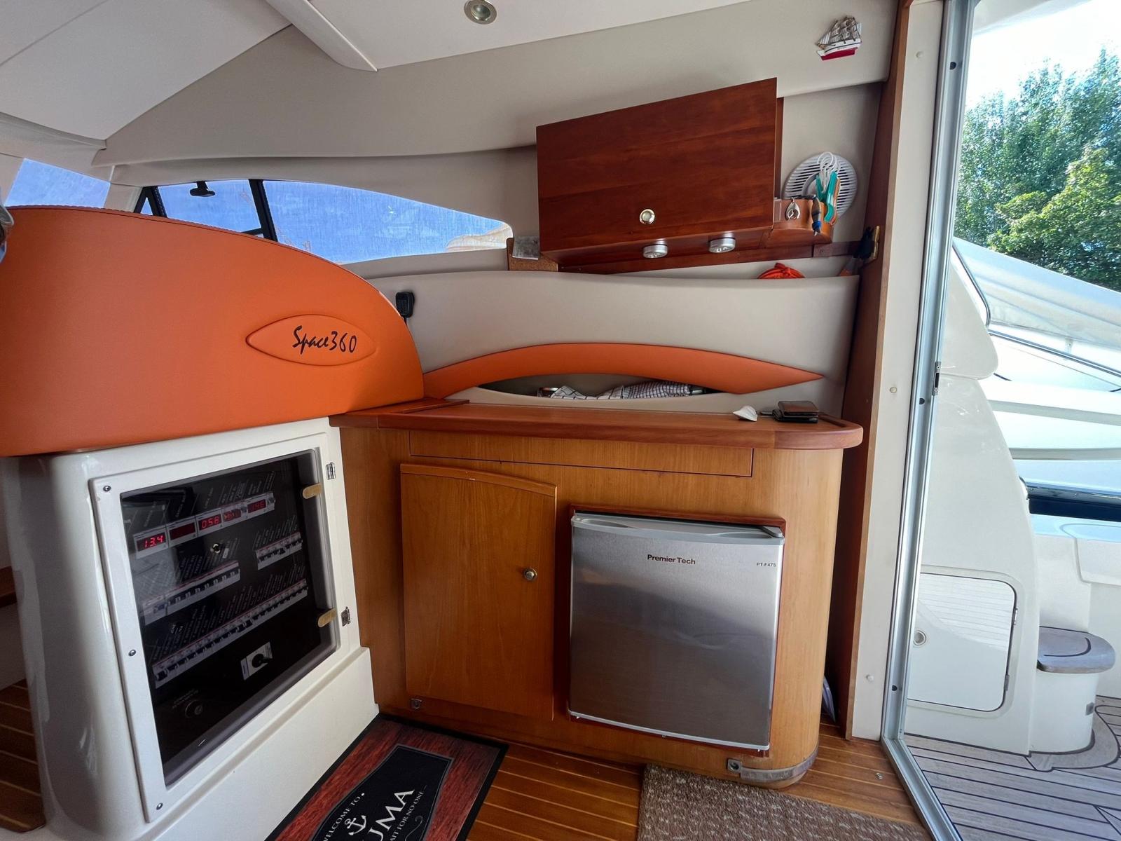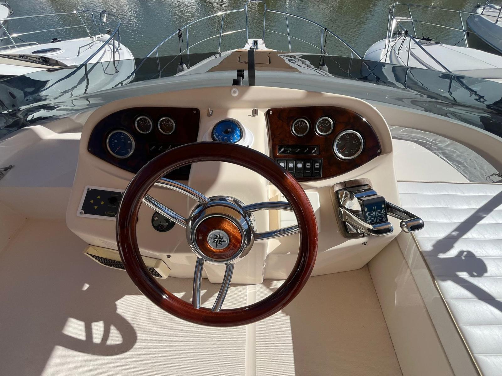 Alarme moteur, Alarme de pompe de cale, Eau sous pression, Douche de cockpit, Double barre à roue, Phare de poursuite, Flaps hydrauliques, Extincteur(s) fixe(s), Éclairage de courtoisie, Passerelle (idraulica), Plateforme arrière, Pompe de cale automatique, Pompe de cale manuelle, Porte latérale, Cockpit en teck, Prise de quai, Onduleur, Rollbar, Guindeau électrique, Echelle de bain, Corne.