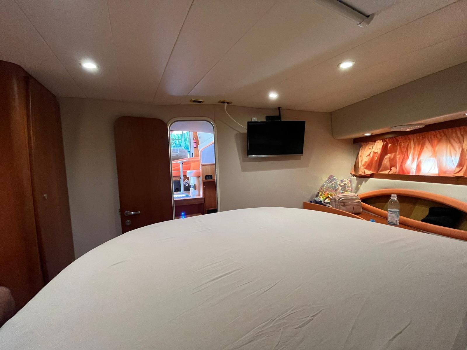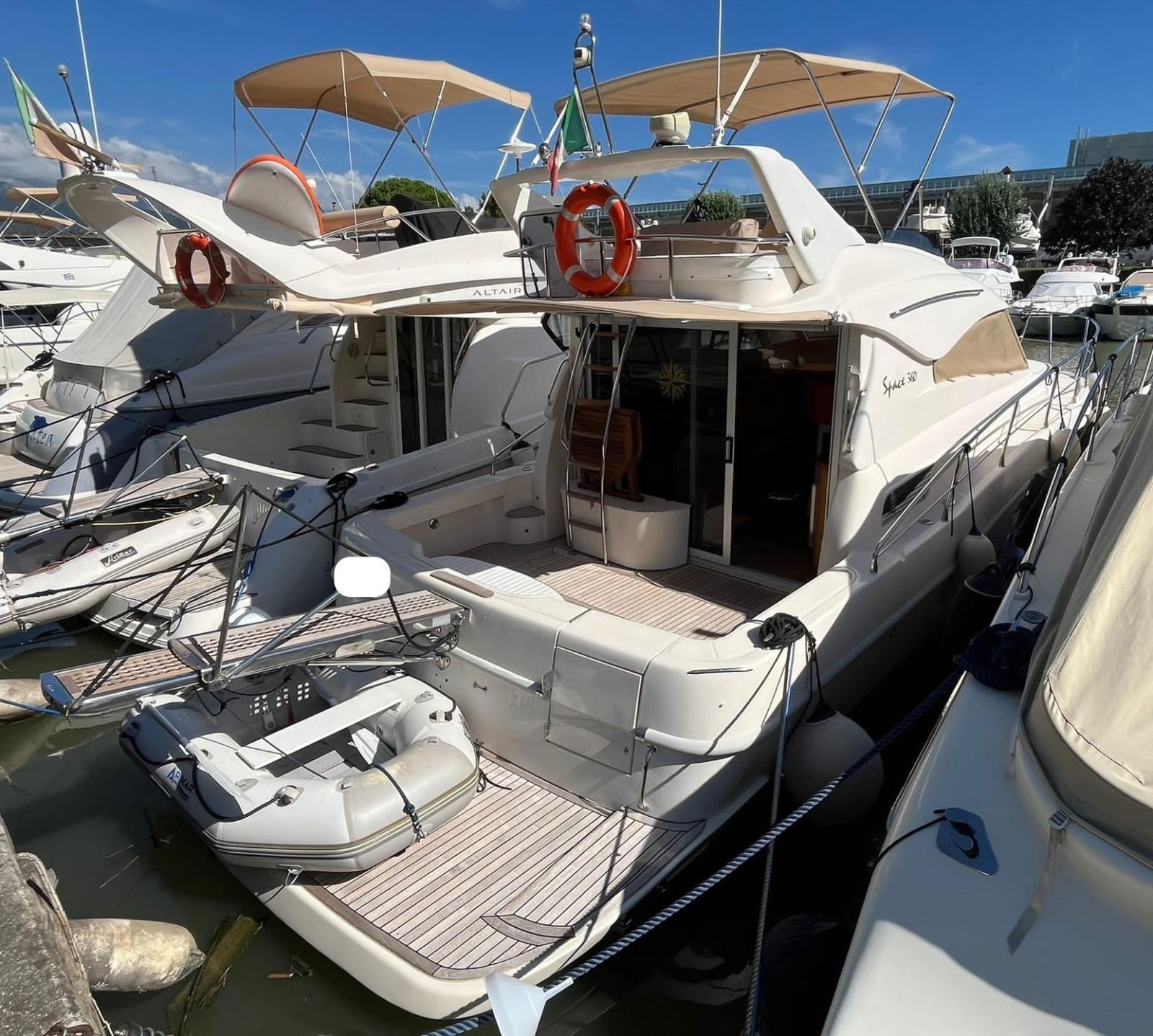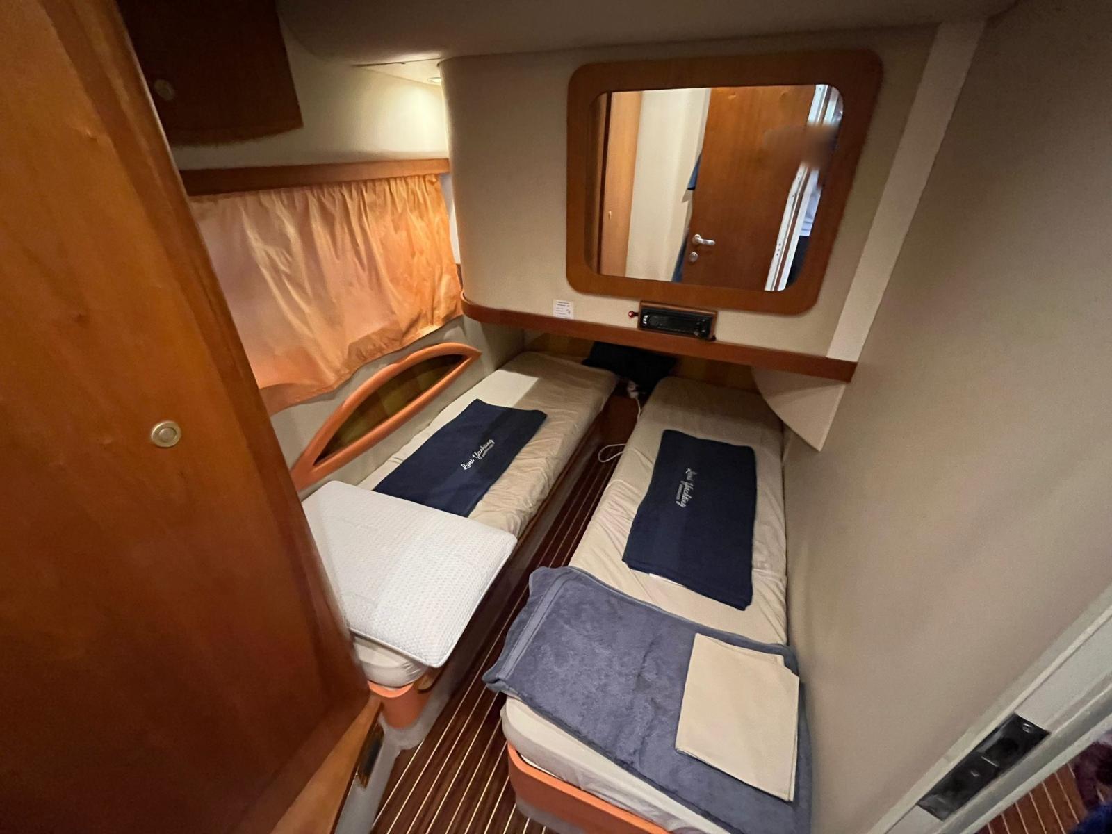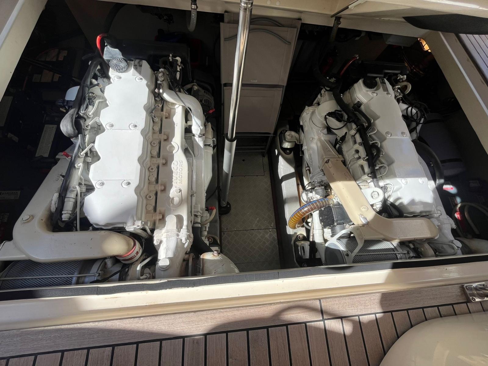 Alarme moteur, Alarme de pompe de cale, Eau sous pression, Douche de cockpit, Double barre à roue, Phare de poursuite, Flaps hydrauliques, Extincteur(s) fixe(s), Éclairage de courtoisie, Passerelle (idraulica), Plateforme arrière, Pompe de cale automatique, Pompe de cale manuelle, Porte latérale, Cockpit en teck, Prise de quai, Onduleur, Rollbar, Guindeau électrique, Echelle de bain, Corne.