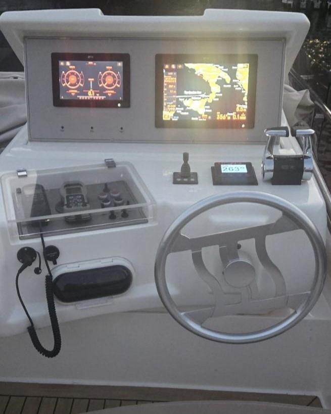 Indicateur d'angle de barre, Antenne radar, Commande électrique, Ordinateur fixe de bord, Compteur de chaîne, DSC VHF, Plotter GPS, Panneau de commande, Siège copilote.