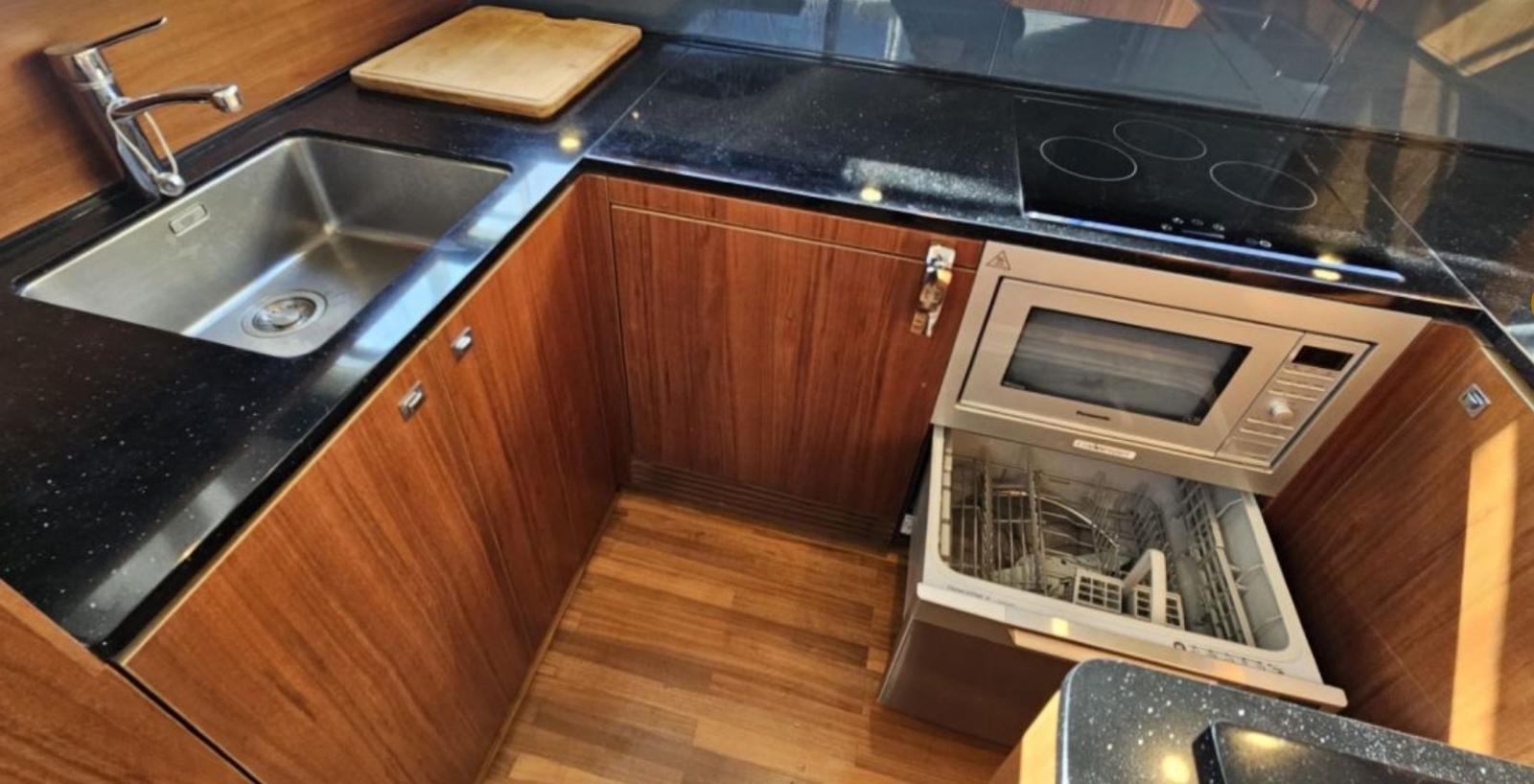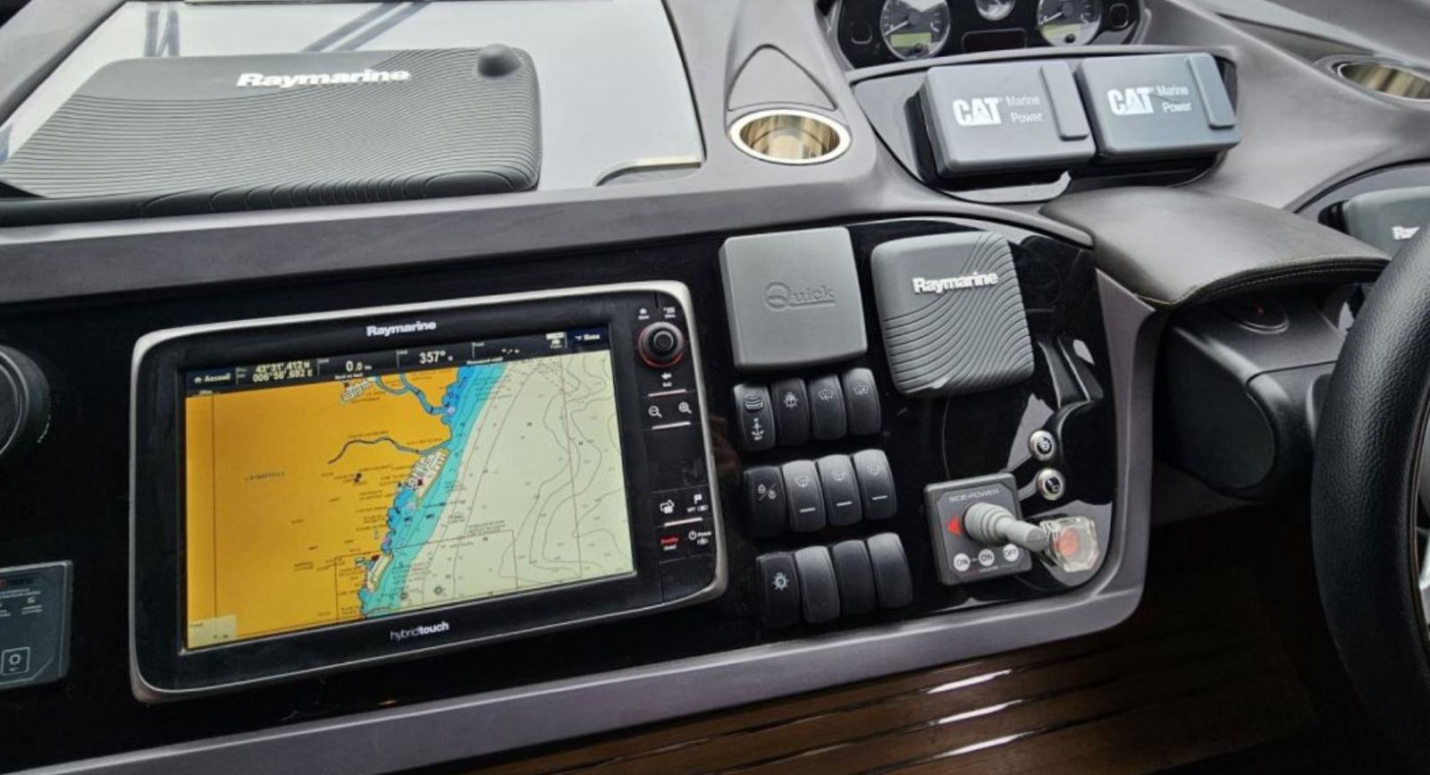 Alarme moteur, Eau sous pression, Câble d’alimentation à quai, Flaps hydrauliques, Plateforme arrière (Affondabile), Pont en teck, Cockpit en teck, Prise de quai, Connexion eau sous pression à quai, Guindeau électrique, Echelle de bain, Winch électrique arrière.