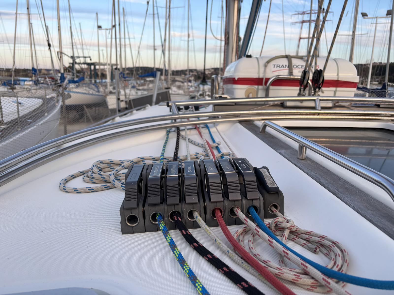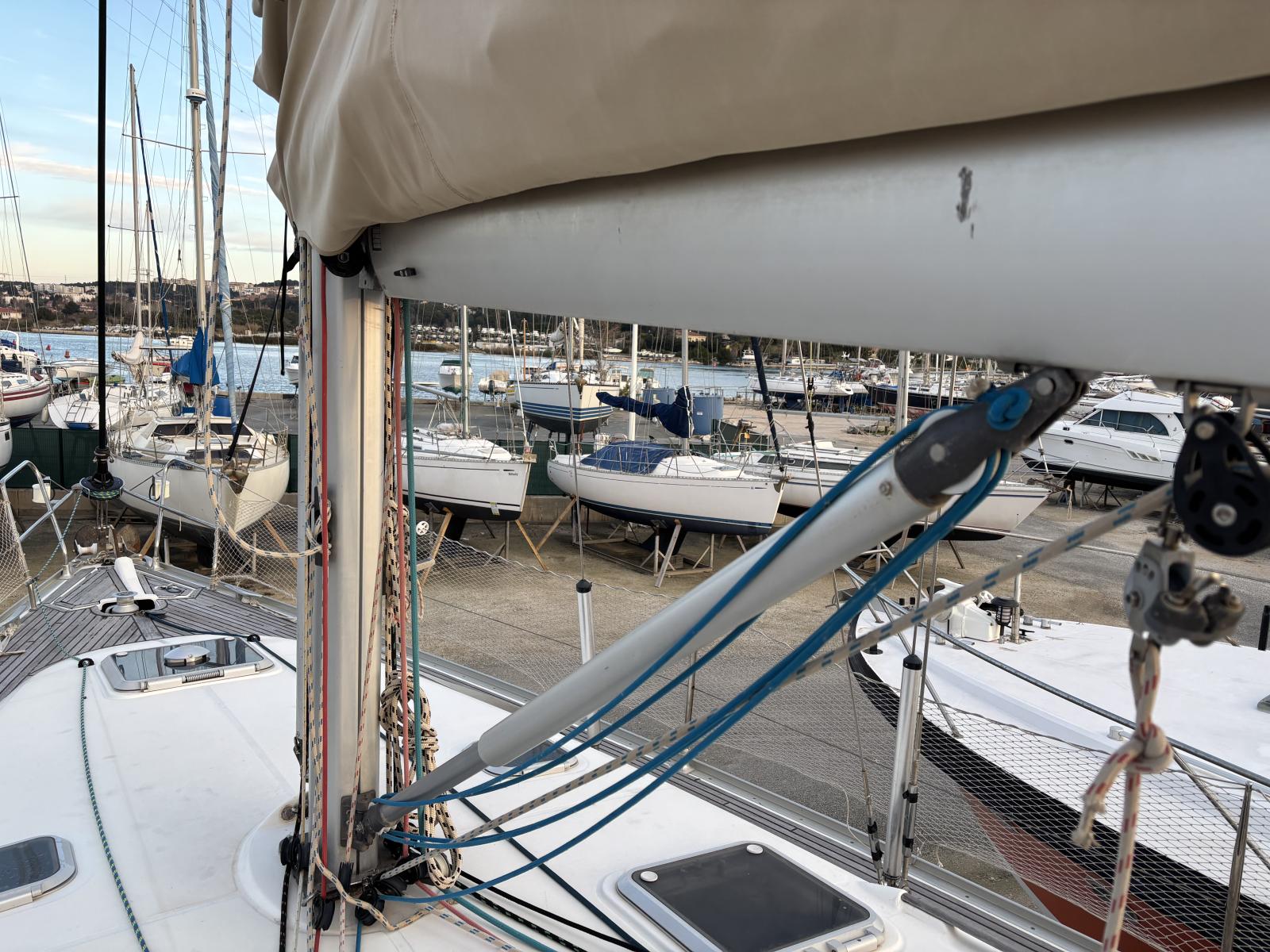 Le pont est équipé d’un jeu de voiles complet et polyvalent : grand-voile, génois, spi asymétrique et trinquette sur étai largable, offrant performance et sécurité dans toutes les conditions.