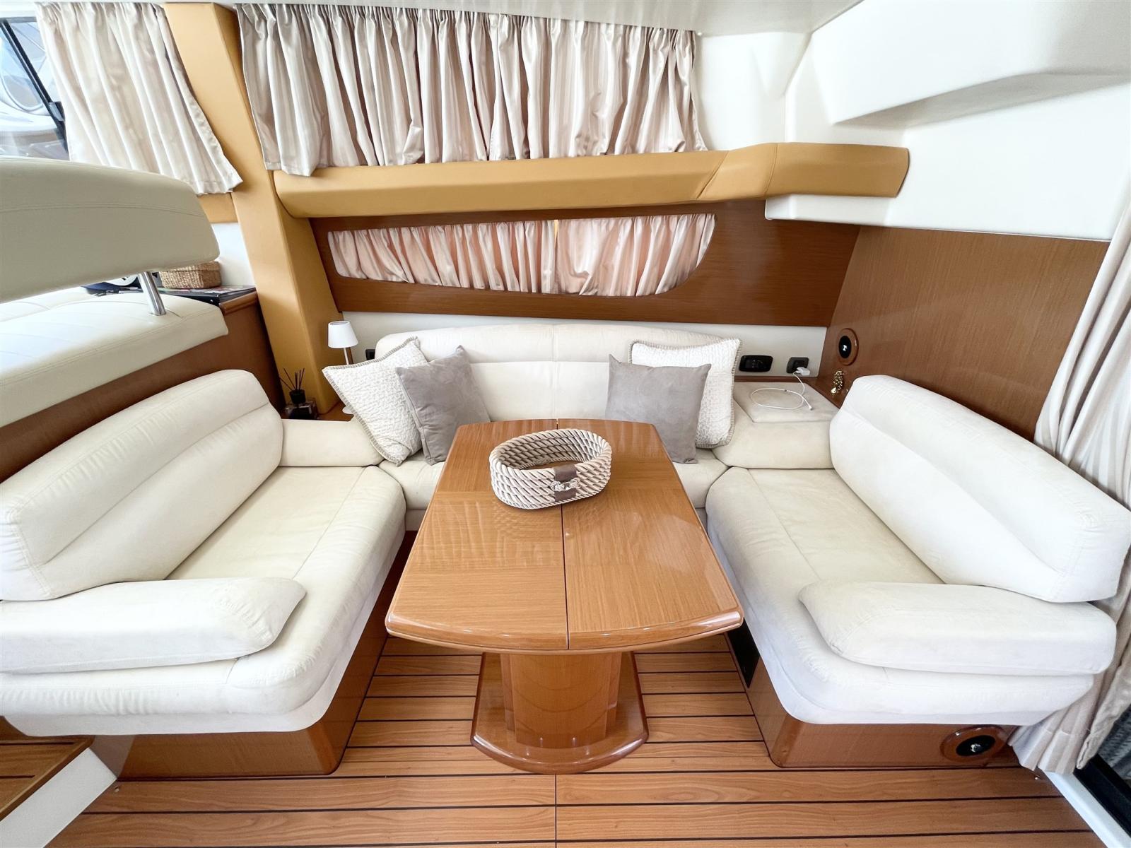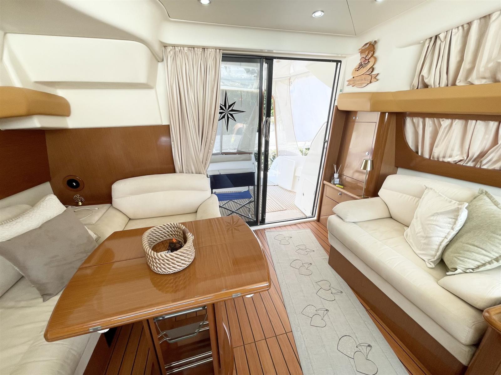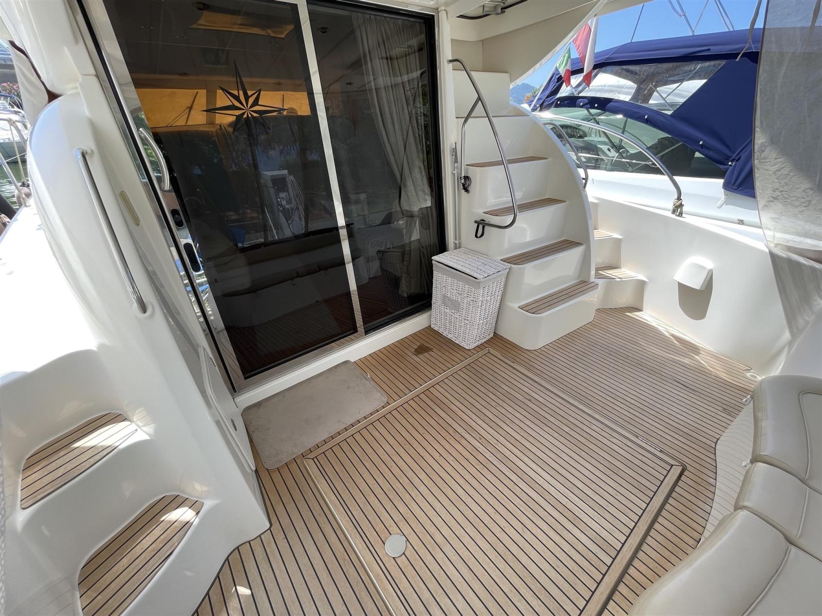 Alarme gaz, Alarme moteur, Alarme de pompe de cale, Flaps hydrauliques, Spots sous-marins, Passerelle, Pompe de cale automatique, Pompe de cale manuelle, Pont en teck, Porte latérale, Cockpit en teck, Prise de quai, Connexion eau sous pression à quai, Guindeau électrique.