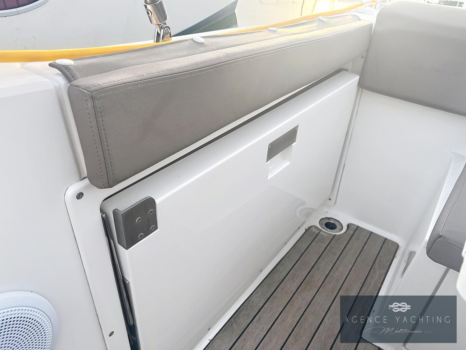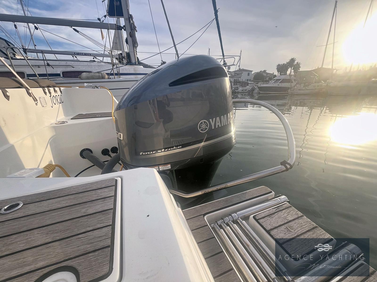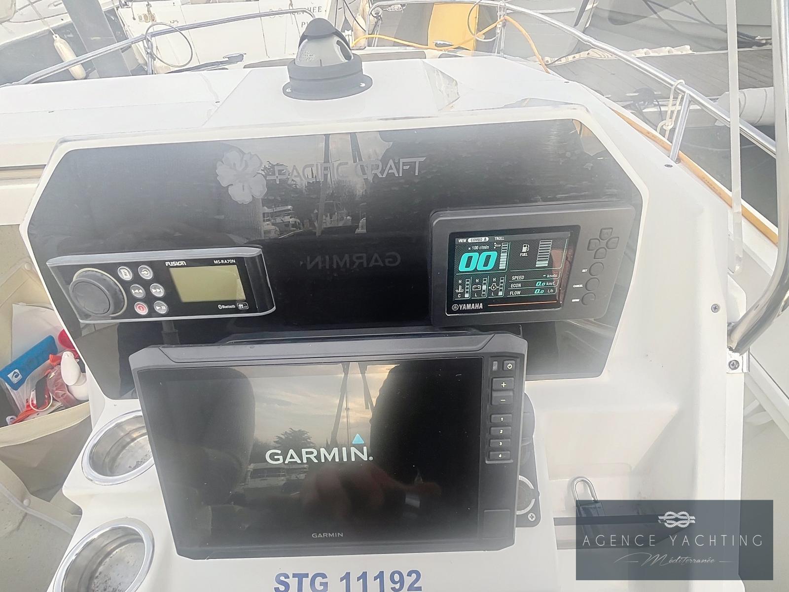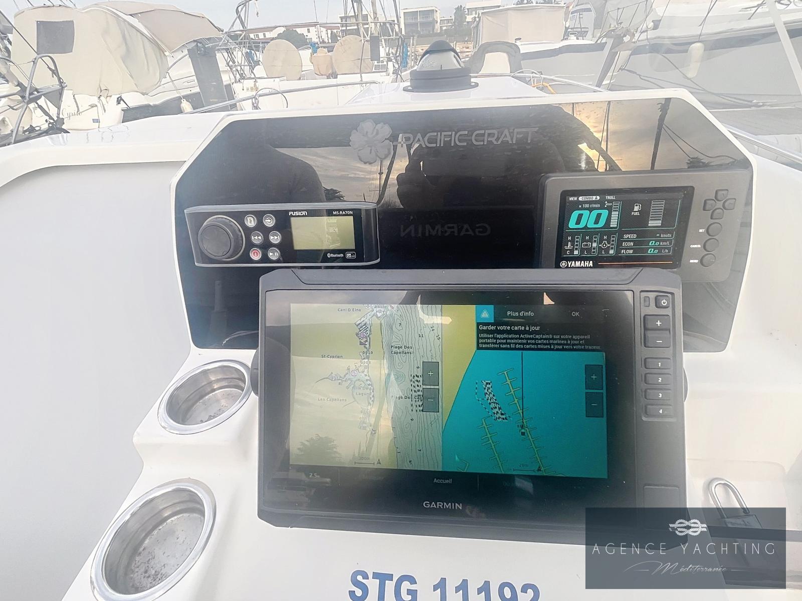 L’équipement est particulièrement riche : Combiné GPS/Sondeur Garmin UHD2 92 SV, Direction hydraulique, Commandes électriques YAMAHA avec ordinateur de bord, Guindeau électrique, Pont en Teck, Réfrigérateur, Radio Fusion, Bimini inox, Prise de quai avec chargeur, Douchette de pont, WC chimiques neufs, Extensions de plages arrière avec échelle de bain intégrée et "Turbo Swing" pour les sports tractés.