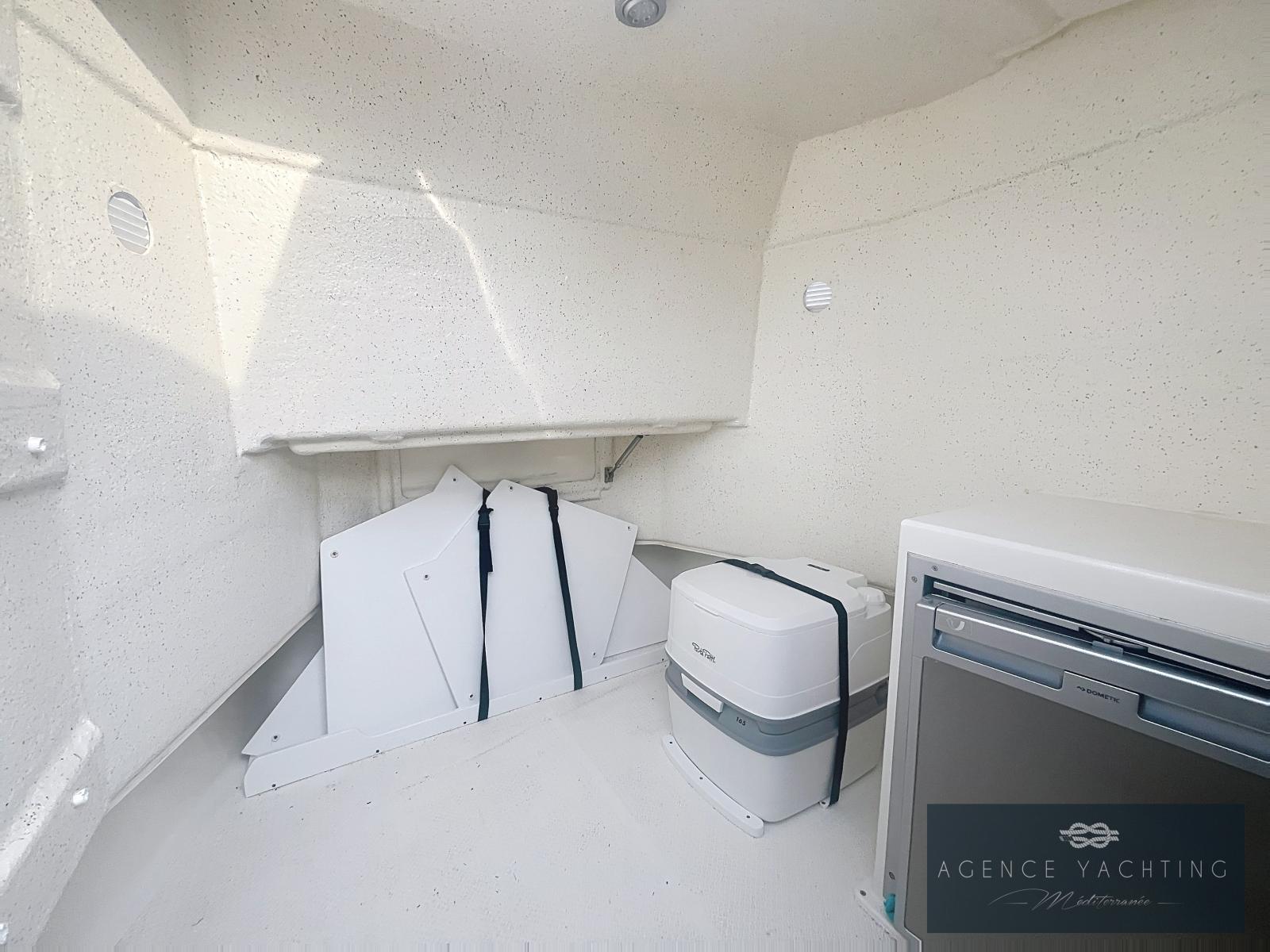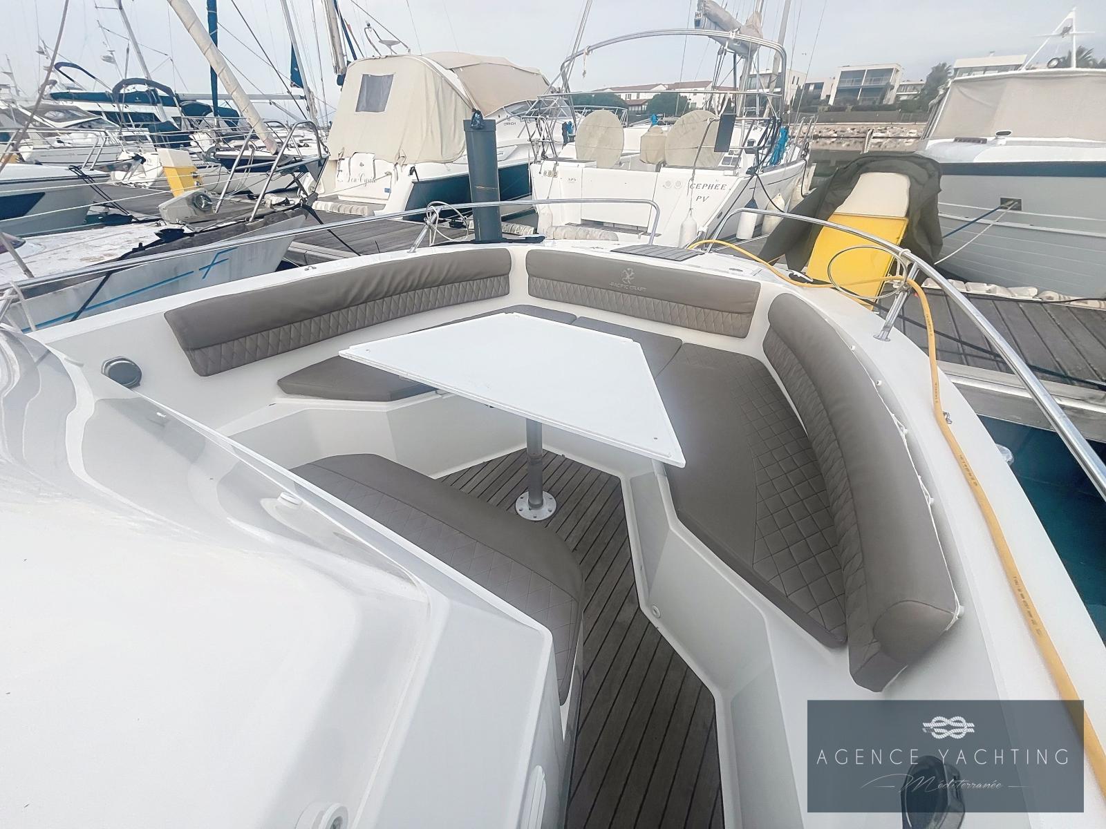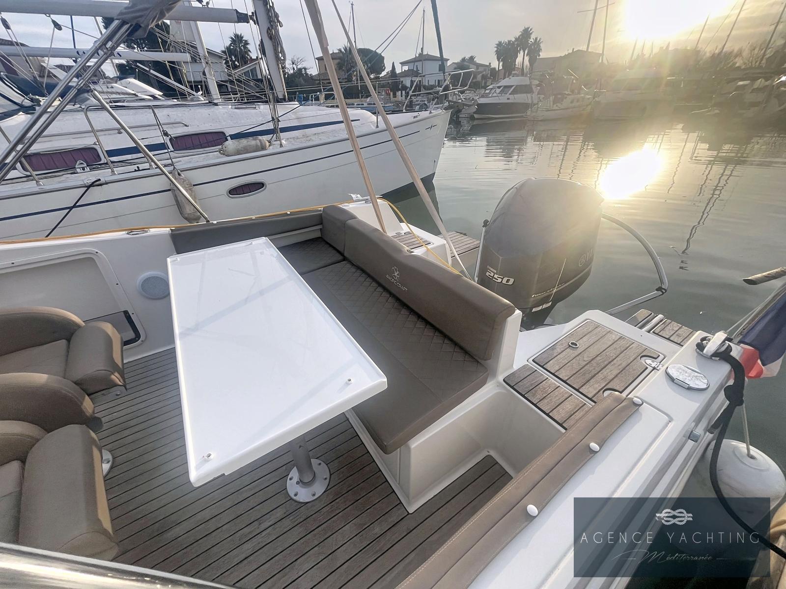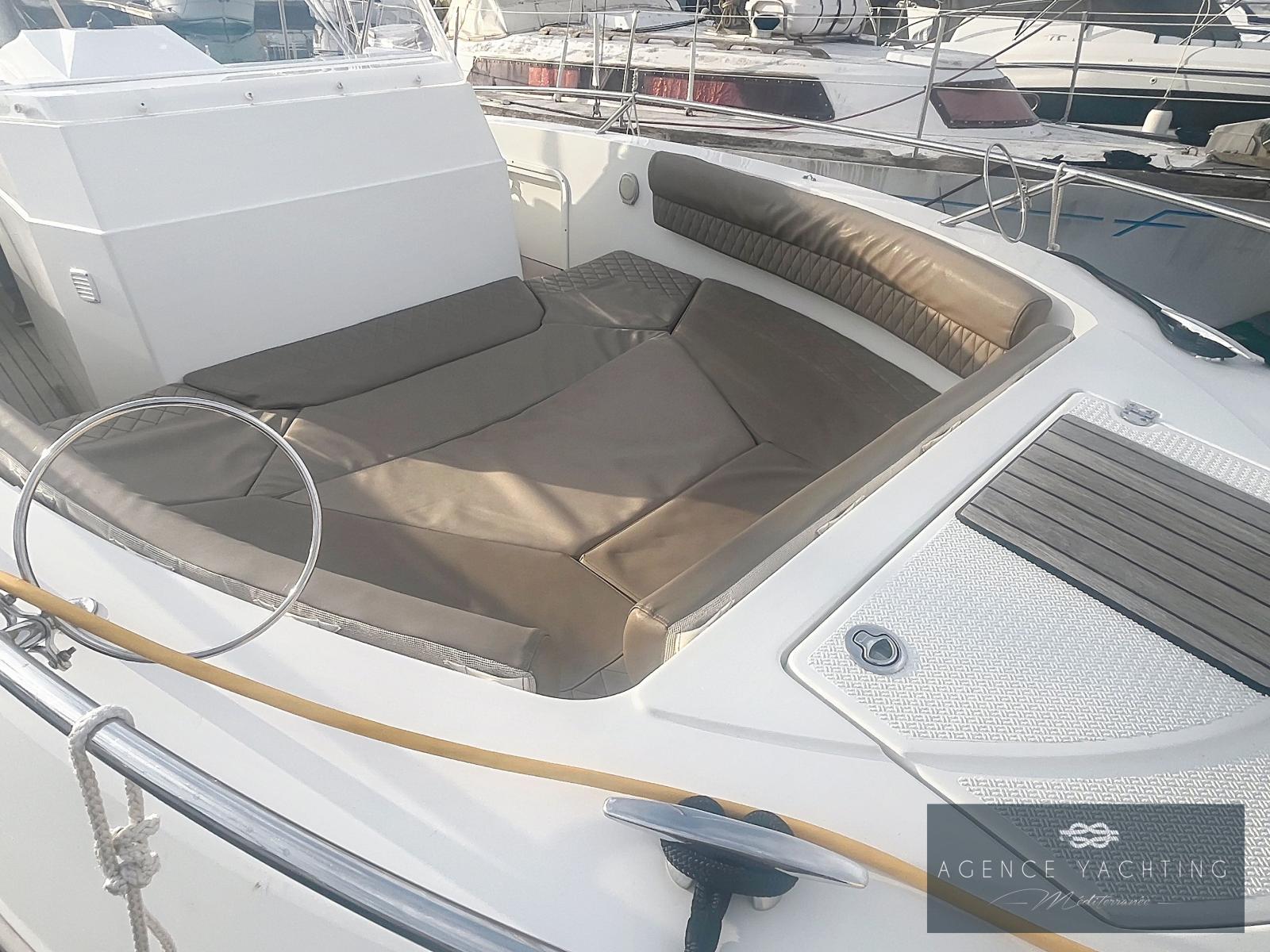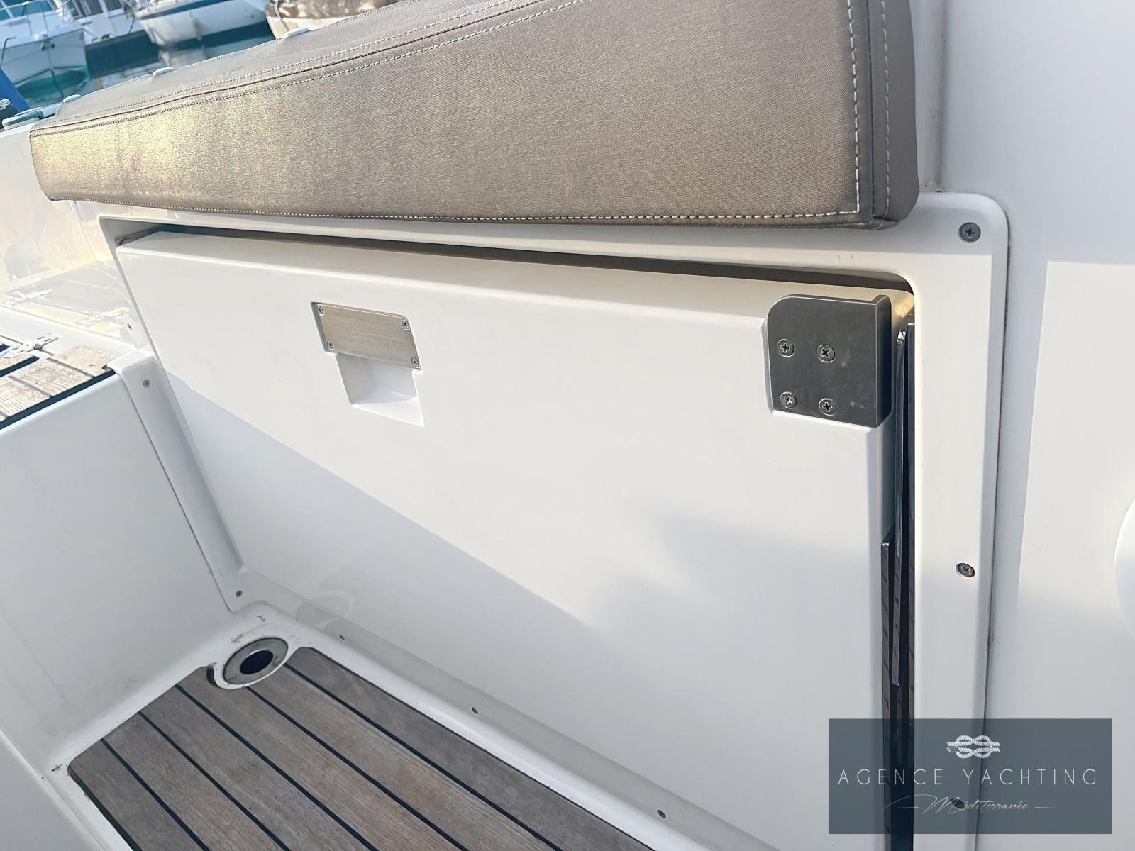 L’équipement est particulièrement riche : Combiné GPS/Sondeur Garmin UHD2 92 SV, Direction hydraulique, Commandes électriques YAMAHA avec ordinateur de bord, Guindeau électrique, Pont en Teck, Réfrigérateur, Radio Fusion, Bimini inox, Prise de quai avec chargeur, Douchette de pont, WC chimiques neufs, Extensions de plages arrière avec échelle de bain intégrée et "Turbo Swing" pour les sports tractés.
