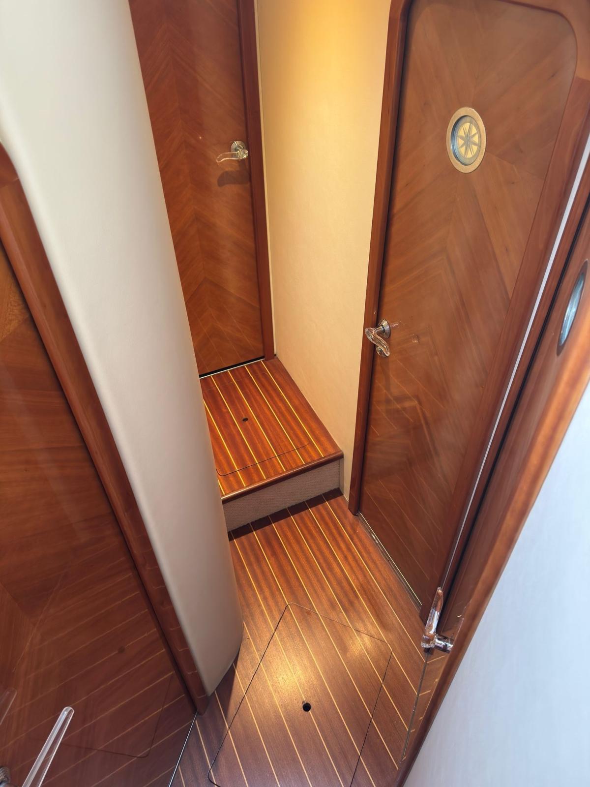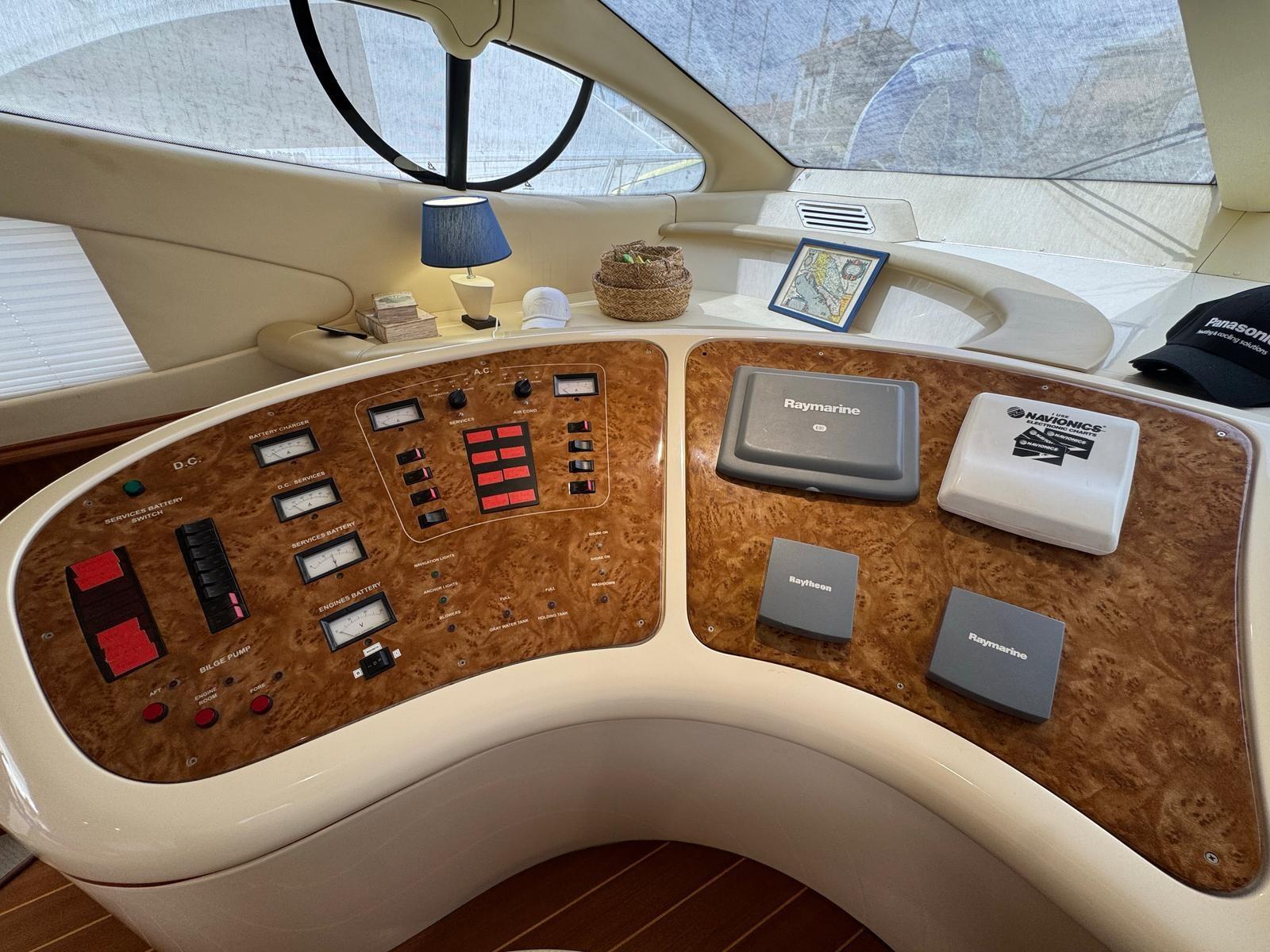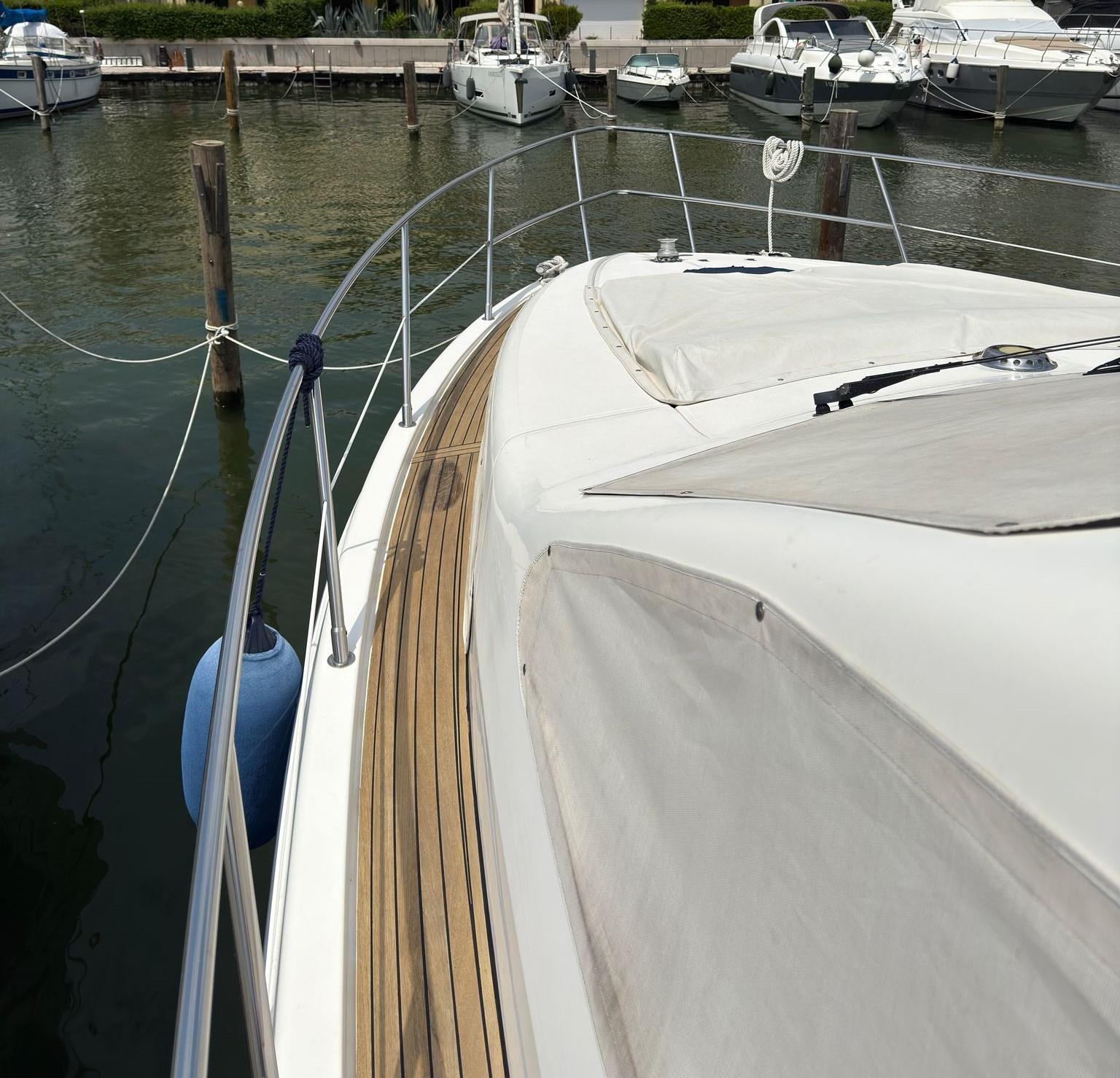 Alarme gaz, Alarme moteur, Eau sous pression, Passavant en teck, Douche de cockpit, Double barre à roue, Phare de poursuite, Flaps hydrauliques, Extincteur(s) fixe(s) (Estintori), Indicateurs de flaps, Éclairage de courtoisie, Spots sous-marins, Passerelle (Besenzoni), Pompe de cale automatique, Pompe de cale manuelle, Porte latérale, Cockpit en teck, Prise de quai, Connexion eau sous pression à quai, Rollbar, Guindeau électrique, Echelle de bain, table de cockpit, Annexe (Zar mini Rib10 (3m doppio fondo) + fuoribordo Yamaha 25cv), Corne, Winch électrique arrière, Winch électrique avant.