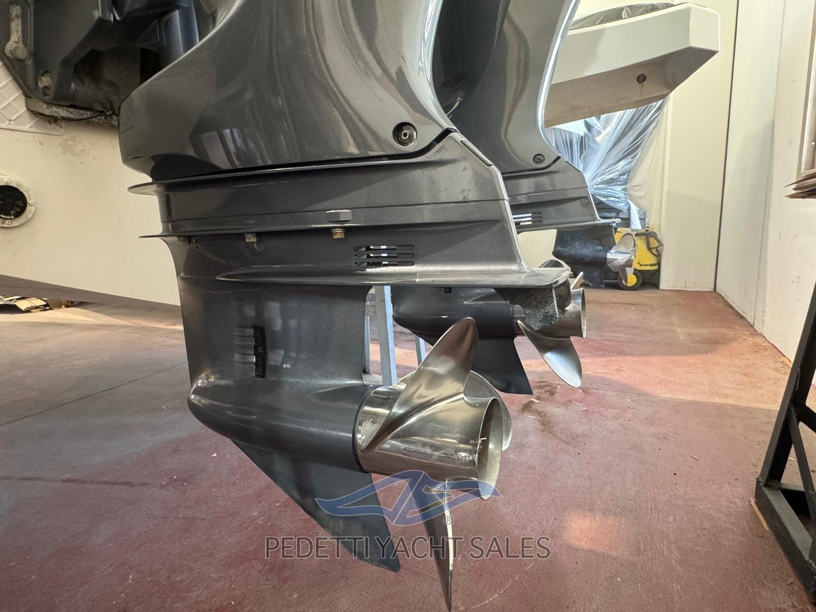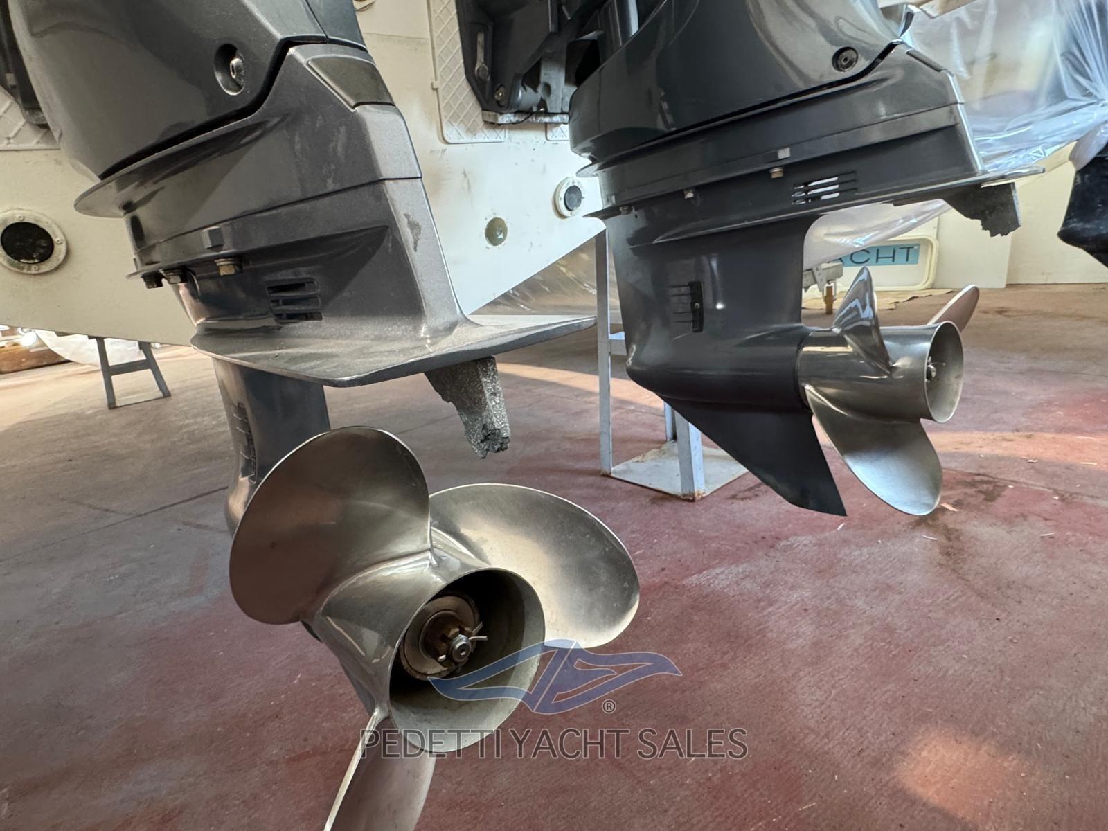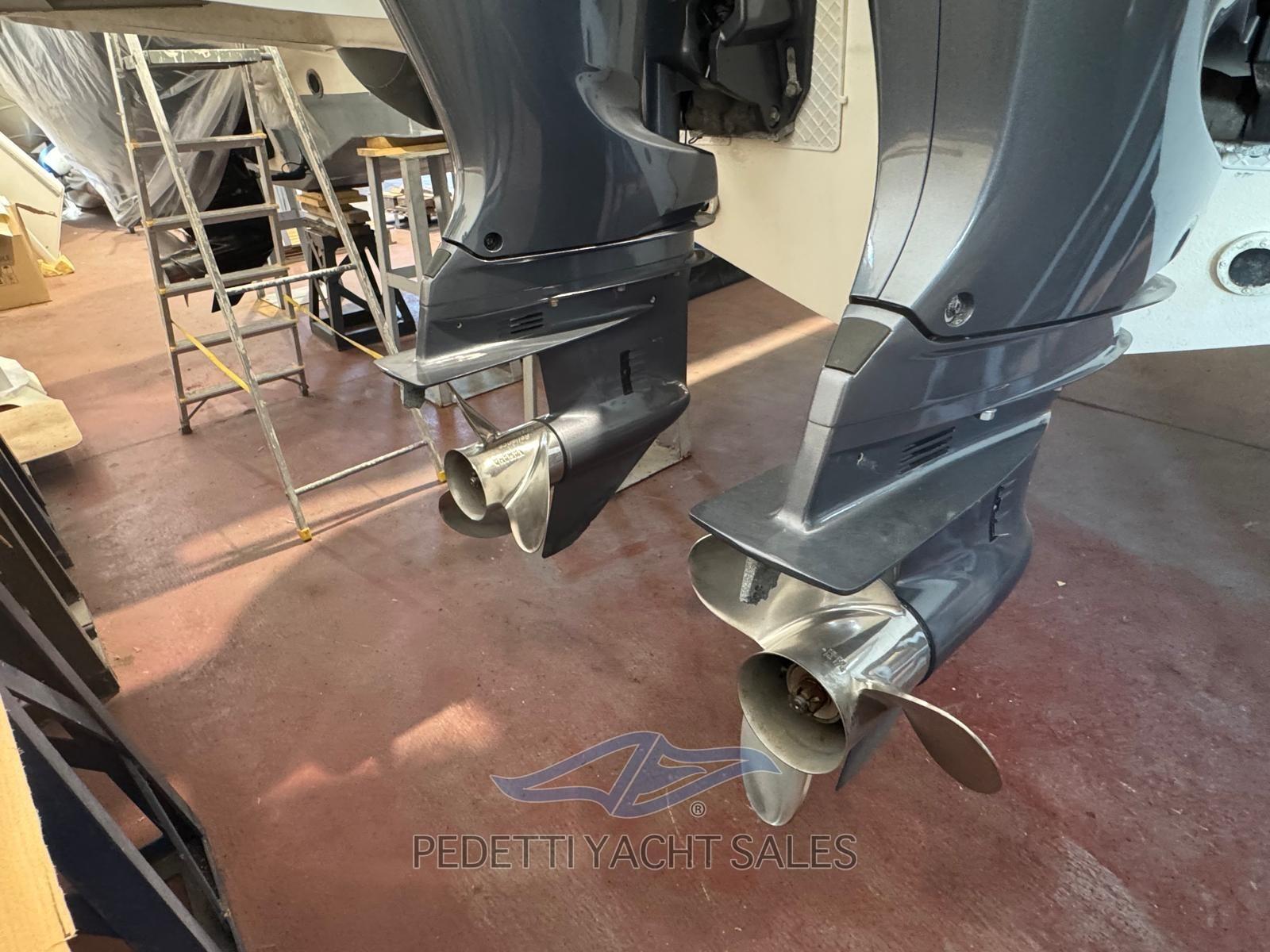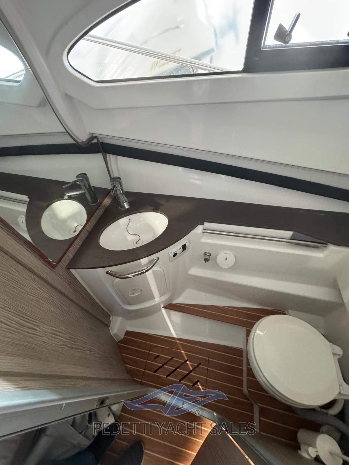 Cabine avec salle de bain séparée équipée de toilettes électriques. Il y a une barre de sécurité en fibre de verre avec auvent télescopique en acier inoxydable, un propulseur à proue, des cales rétractables, des plateformes sur le tableau arrière et un éclairage LED.