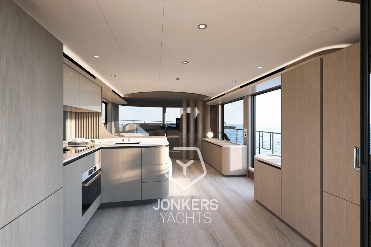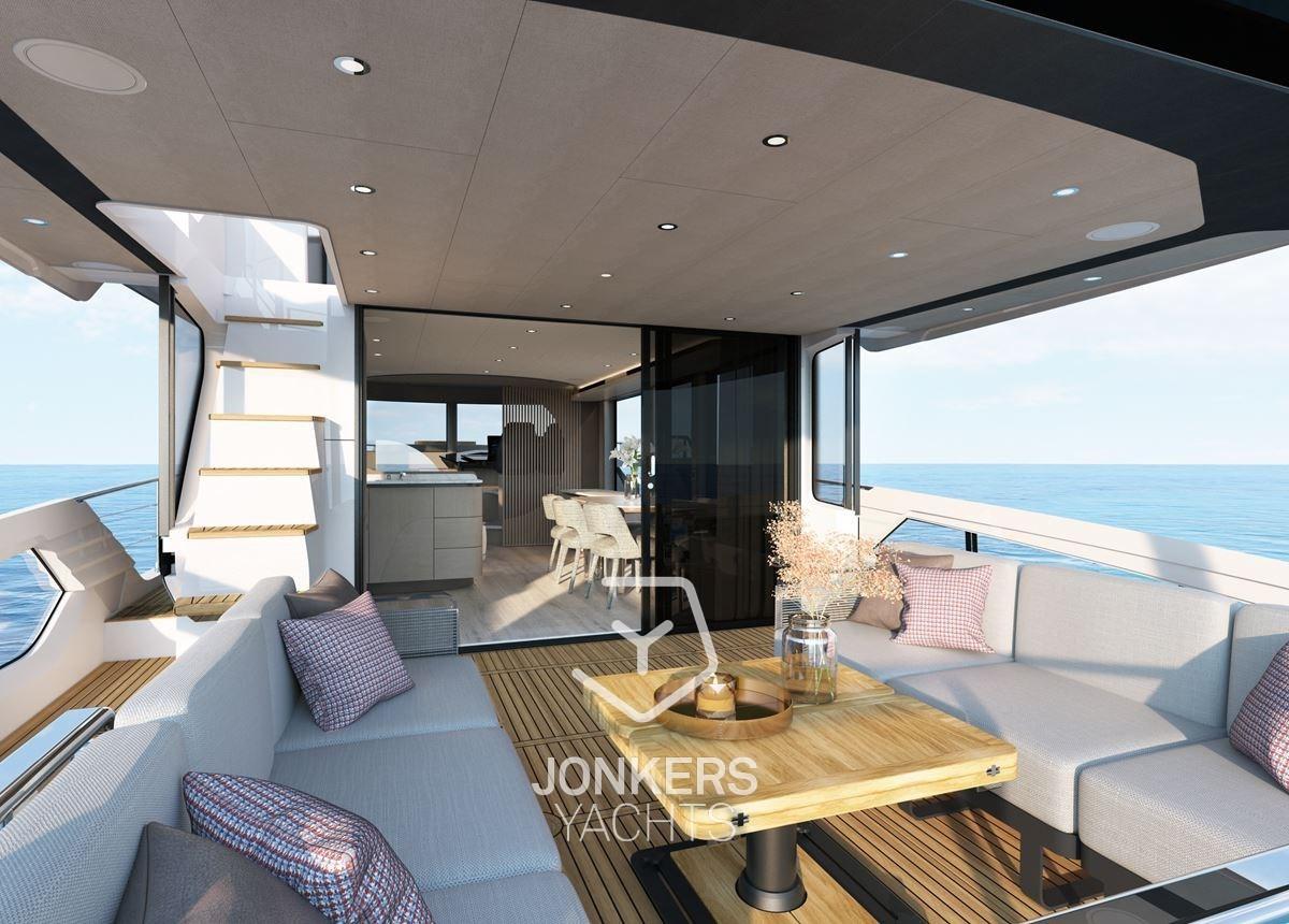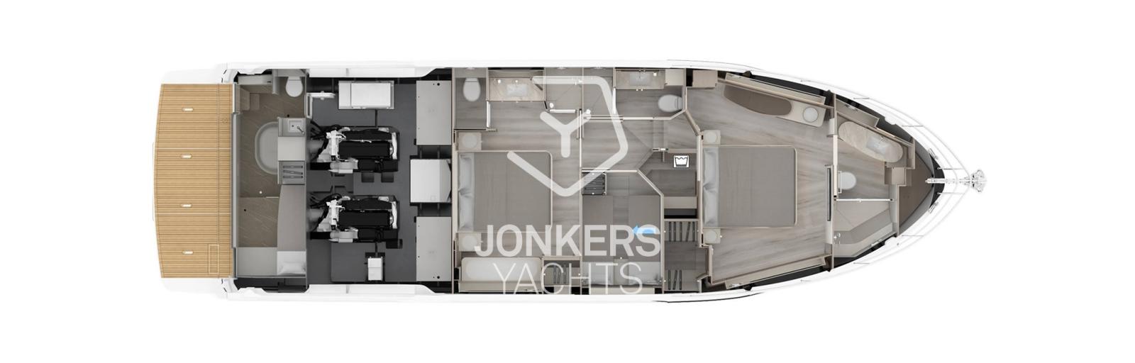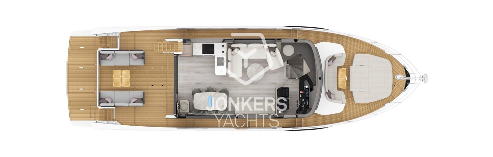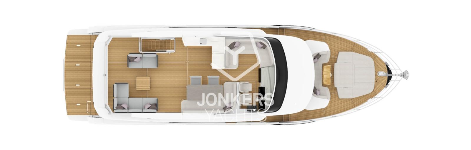 La passerelle sans marches offre une terrasse arrière personnalisable, un généreux canapé en forme de L avec table coulissante en céramique, un bar humide entièrement équipé avec barbecue, réfrigérateur, machine à glace et congélateur, ainsi qu’un poste de timonerie tribord conçu pour simplifier les manœuvres d’amarrage. Le toit rigide spacieux, disponible avec une section ouvrante ou des panneaux solaires, complète l’espace avec des plafonniers dimmables et un éclairage au sol intégré, créant une expérience intégrée raffinée et atmosphérique.