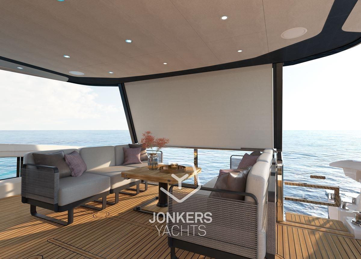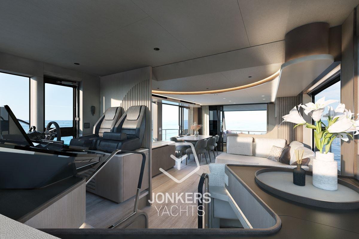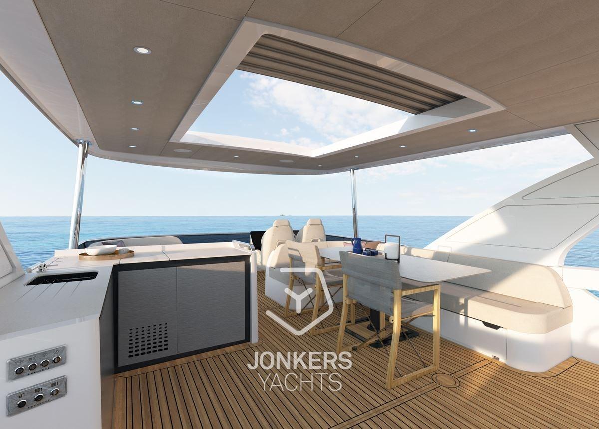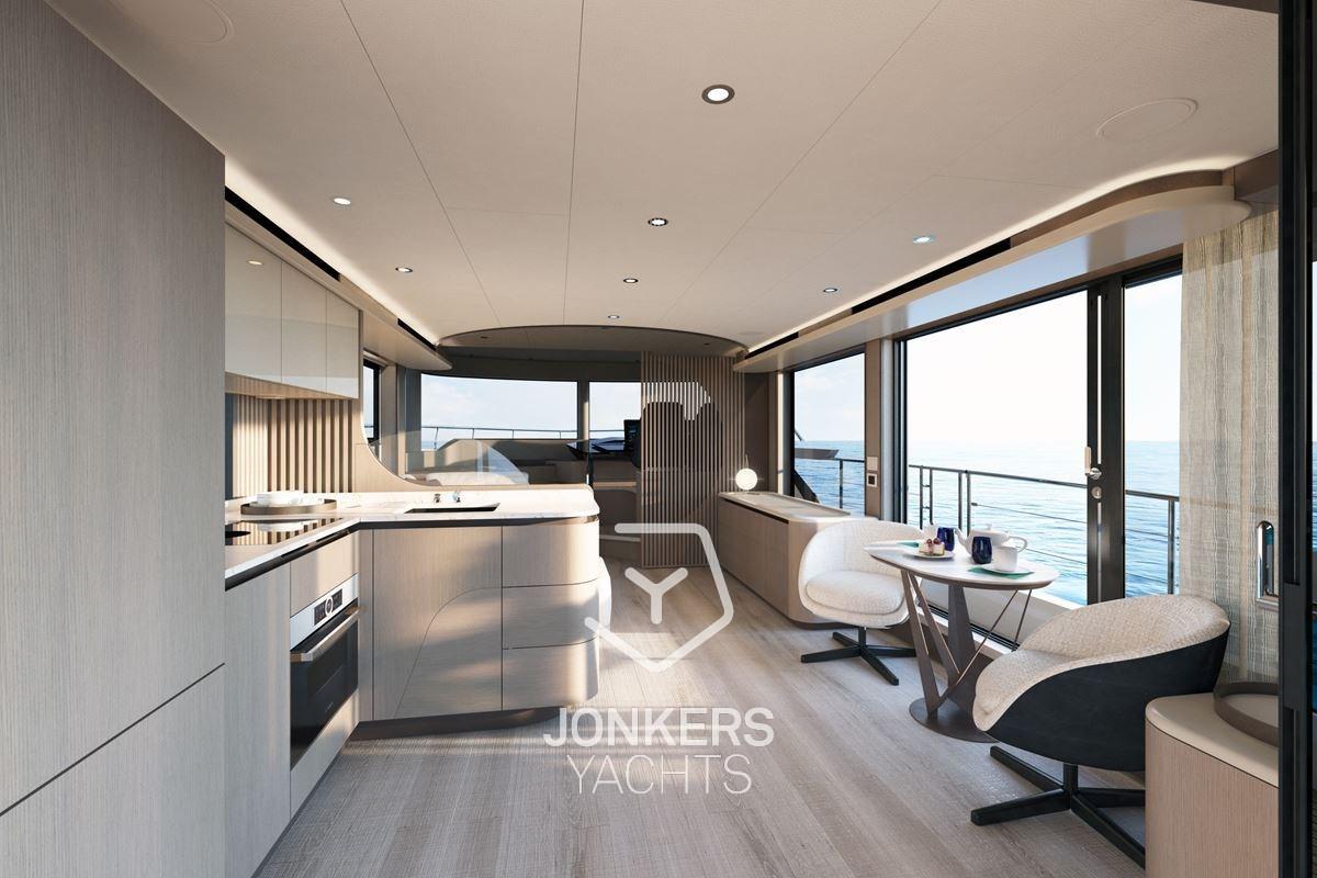 La passerelle sans marches offre une terrasse arrière personnalisable, un généreux canapé en forme de L avec table coulissante en céramique, un bar humide entièrement équipé avec barbecue, réfrigérateur, machine à glace et congélateur, ainsi qu’un poste de timonerie tribord conçu pour simplifier les manœuvres d’amarrage. Le toit rigide spacieux, disponible avec une section ouvrante ou des panneaux solaires, complète l’espace avec des plafonniers dimmables et un éclairage au sol intégré, créant une expérience intégrée raffinée et atmosphérique.