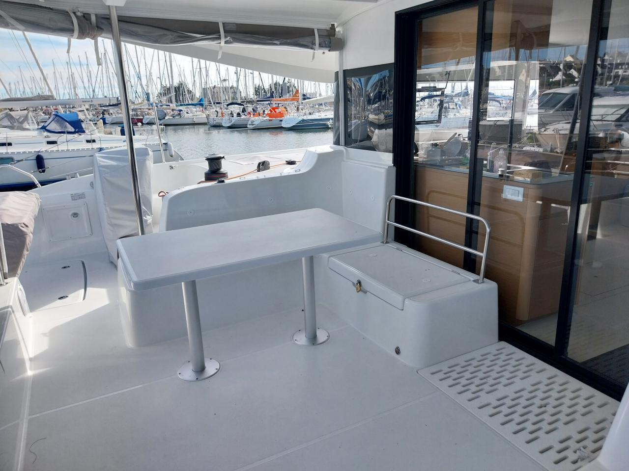 Salon extérieur avec banquette en L à bâbord et table de cockpit en fibre