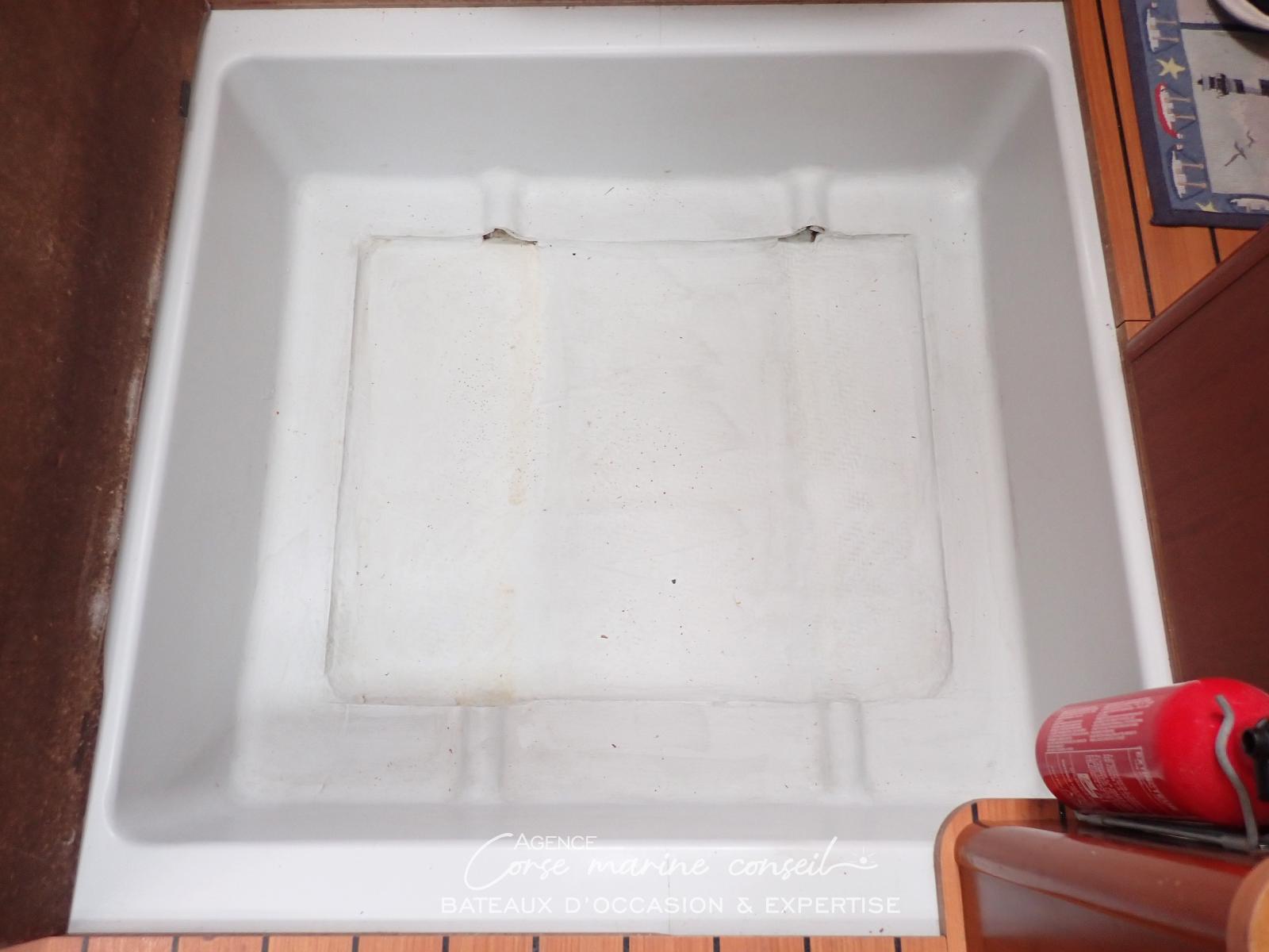 Grande cuisine en U sur babord, Très fonctionnelle , évier double avec eau de mer , gazinière 2 feux et four, réfrigérateur + glacière (2x90L), nombreux rangements fermés et tiroirs.