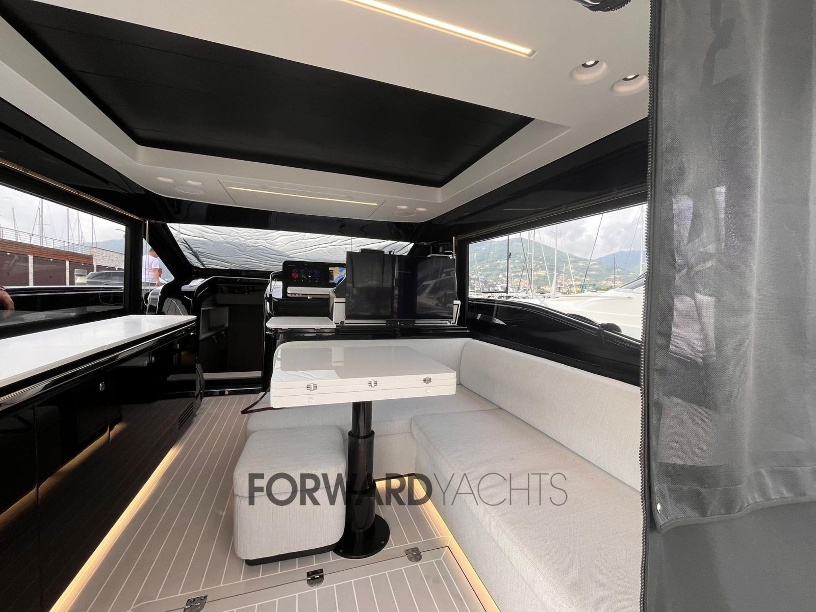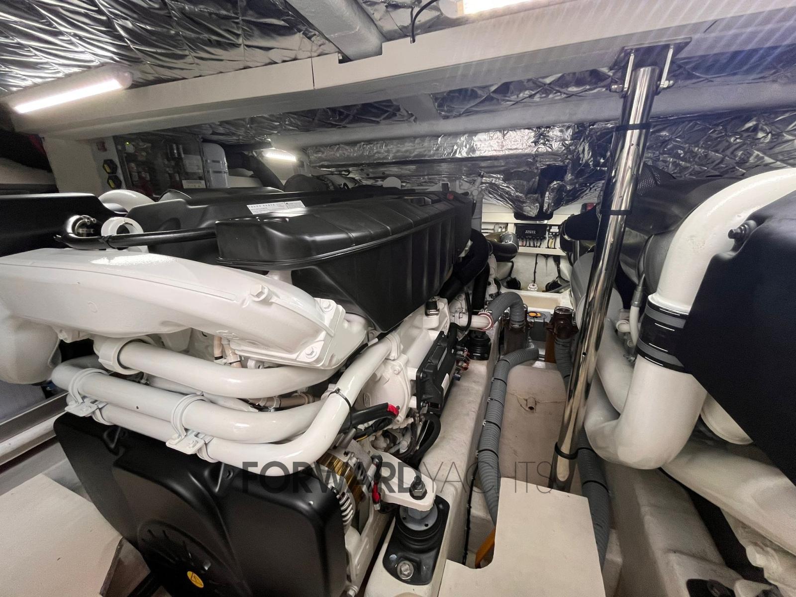 Le bateau est équipé de 2 moteurs Volvo Penta 725Hp et bien équipé avec : ouverture lamellaire à toit rigide, auvent arrière électrique, stabilisateur Quick Gyro, vitres latérales électriques, propulseur d’étrave, passerelle et plate-forme personnalisée, cockpit en teck, garage à annexe, porte coulissante à double vantal pour fermer le salon et bien plus encore.