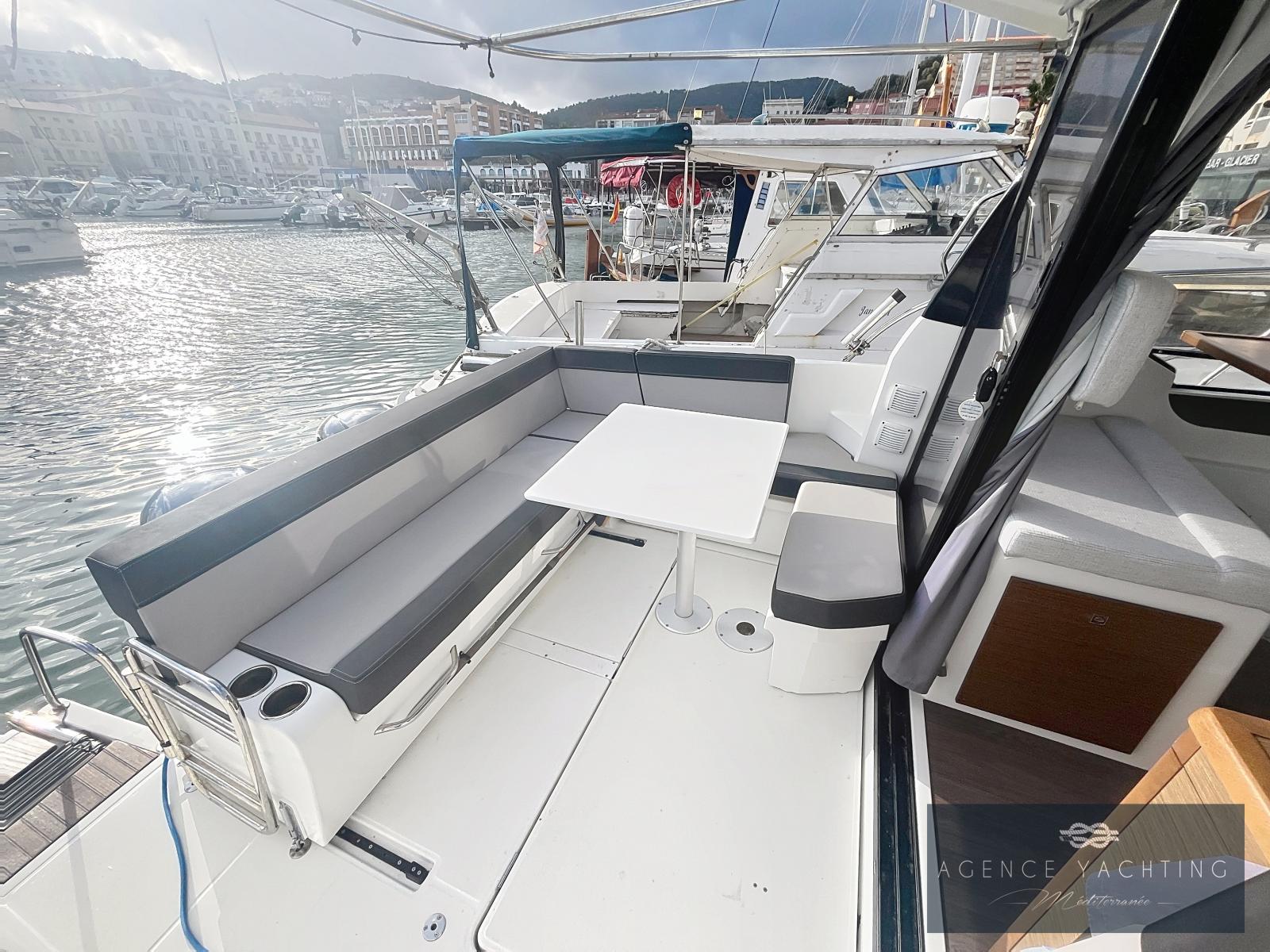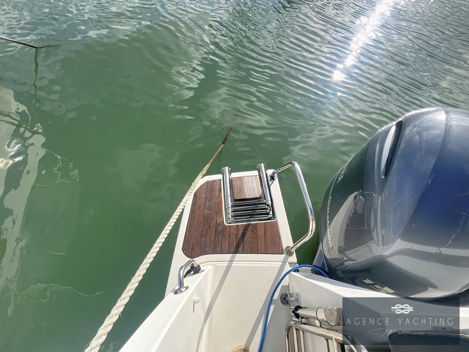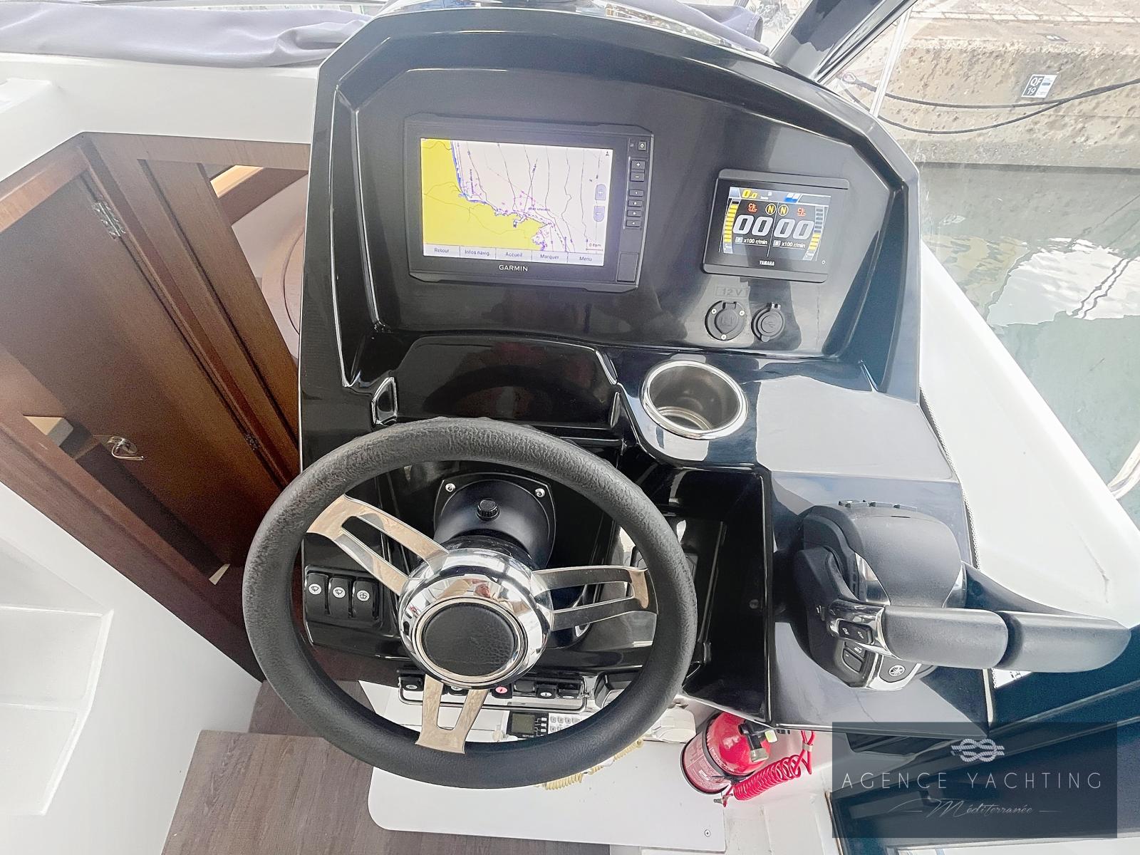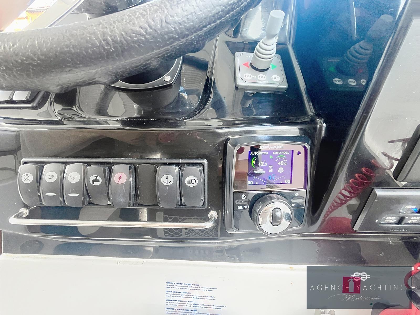 La navigation est assurée par une bi-motorisation YAMAHA GETX 150 CV, totalisant à peine 60 heures, reconnue pour sa fiabilité, sa souplesse et sa sobriété. L’ensemble est complété par une motorisation haut de gamme avec commandes électriques, ordinateur de bord, direction hydraulique, propulseur d’étrave et stabilisateurs automatiques ZIP WAKE, offrant une prise en main immédiate, des manœuvres simples et un confort de navigation particulièrement rassurant, même lorsque les conditions se forment.