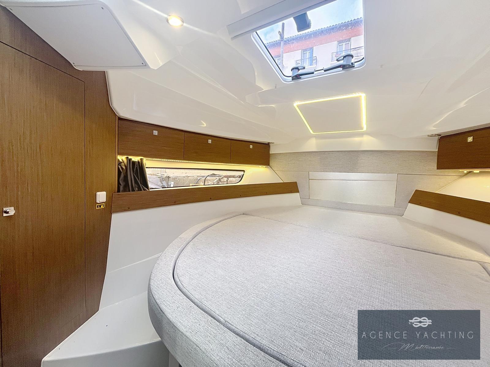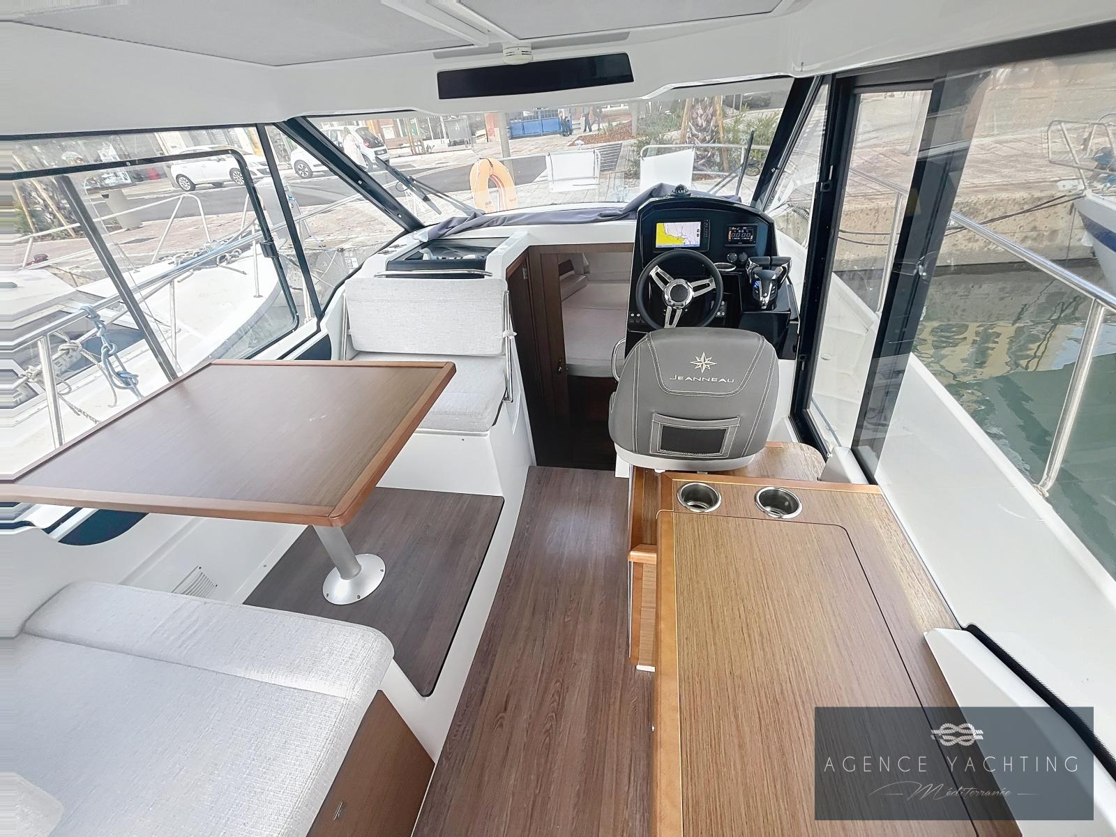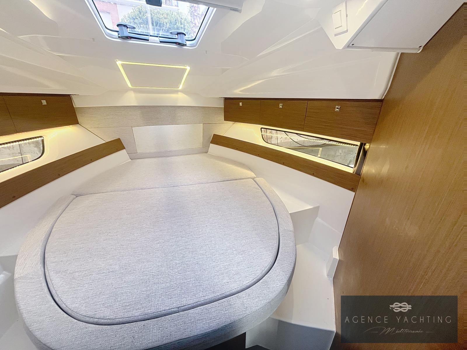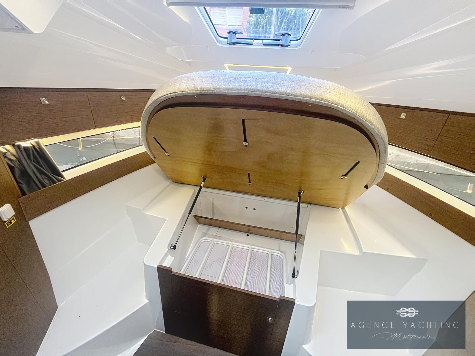 La navigation est assurée par une bi-motorisation YAMAHA GETX 150 CV, totalisant à peine 60 heures, reconnue pour sa fiabilité, sa souplesse et sa sobriété. L’ensemble est complété par une motorisation haut de gamme avec commandes électriques, ordinateur de bord, direction hydraulique, propulseur d’étrave et stabilisateurs automatiques ZIP WAKE, offrant une prise en main immédiate, des manœuvres simples et un confort de navigation particulièrement rassurant, même lorsque les conditions se forment.