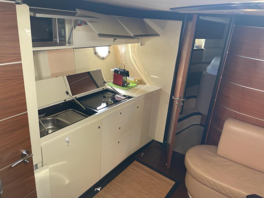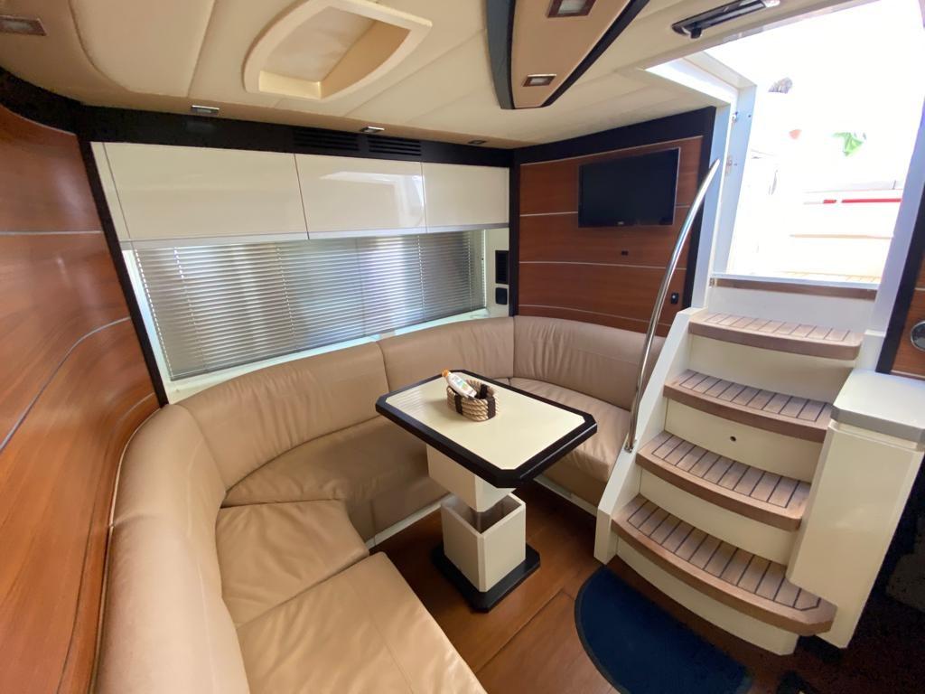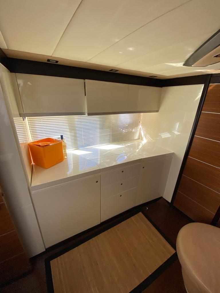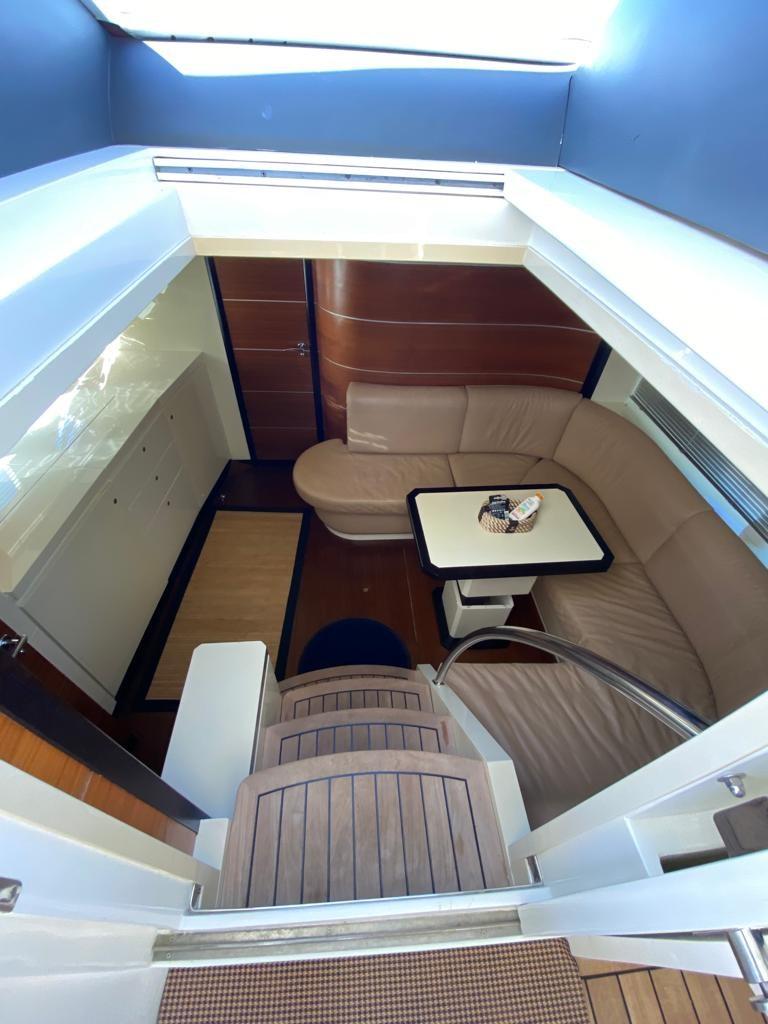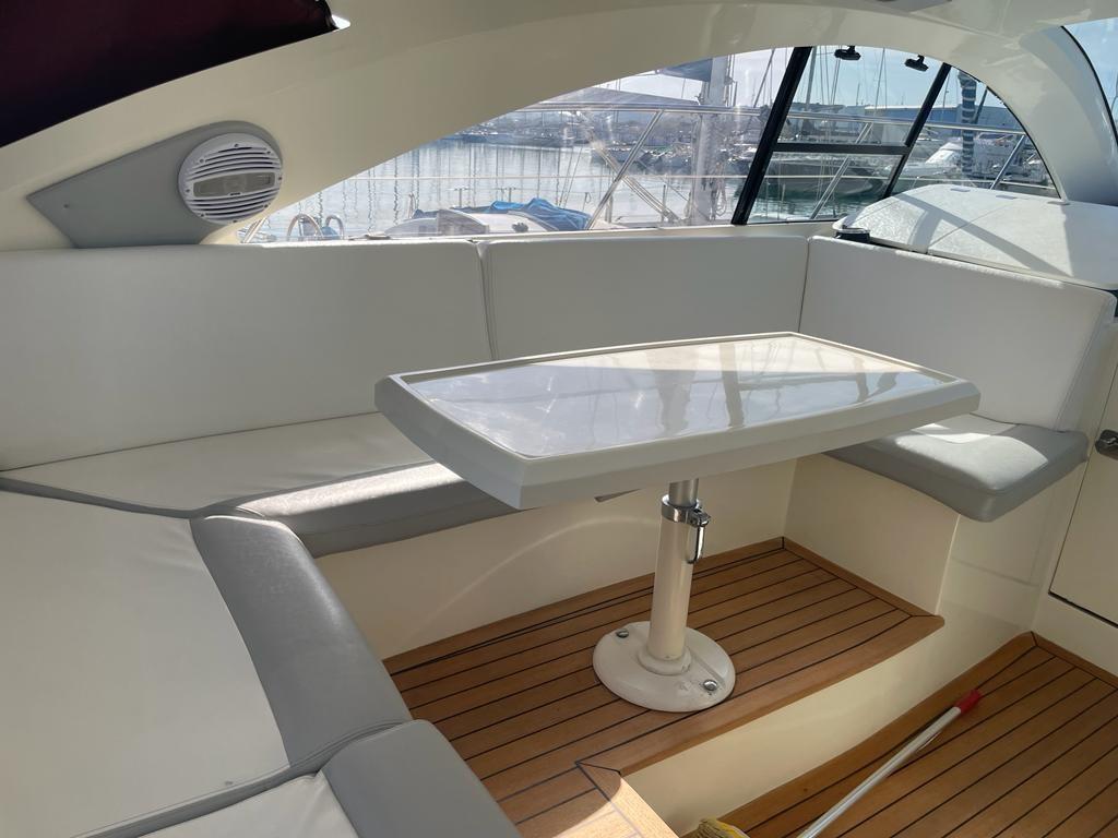 Alarme gaz, Alarme moteur, Alarme de pompe de cale, Eau sous pression, Douche de cockpit, Phare de poursuite, Flaps hydrauliques, Garage à annexe, Hard top, Extincteur(s) fixe(s), Lavage de chaine, Éclairage de courtoisie, Passerelle, Pompe de cale automatique, Pompe de cale manuelle, Cockpit en teck, Prise de quai, Connexion eau sous pression à quai, Guindeau électrique, Echelle de bain, table de cockpit, Corne.