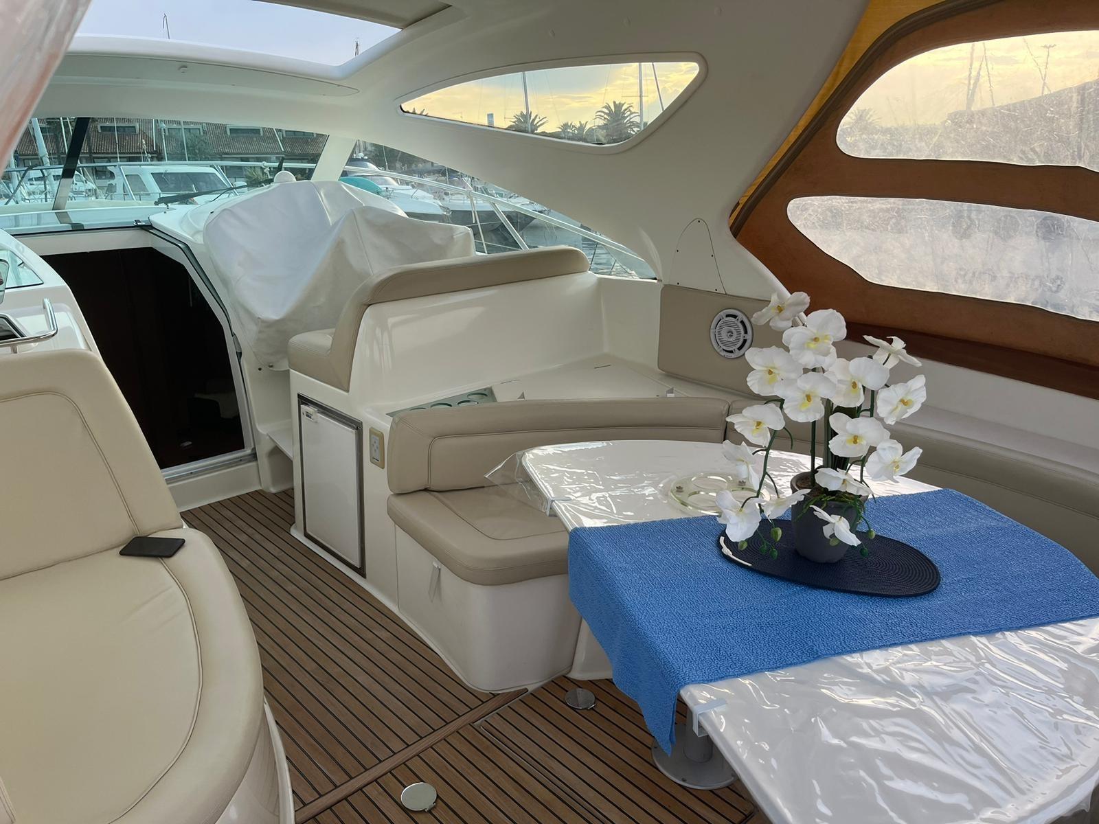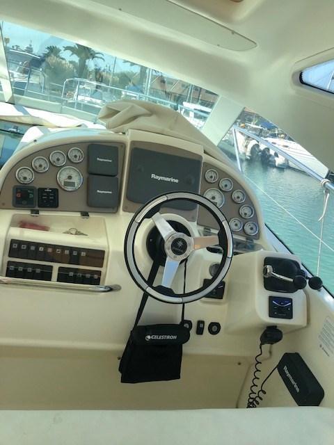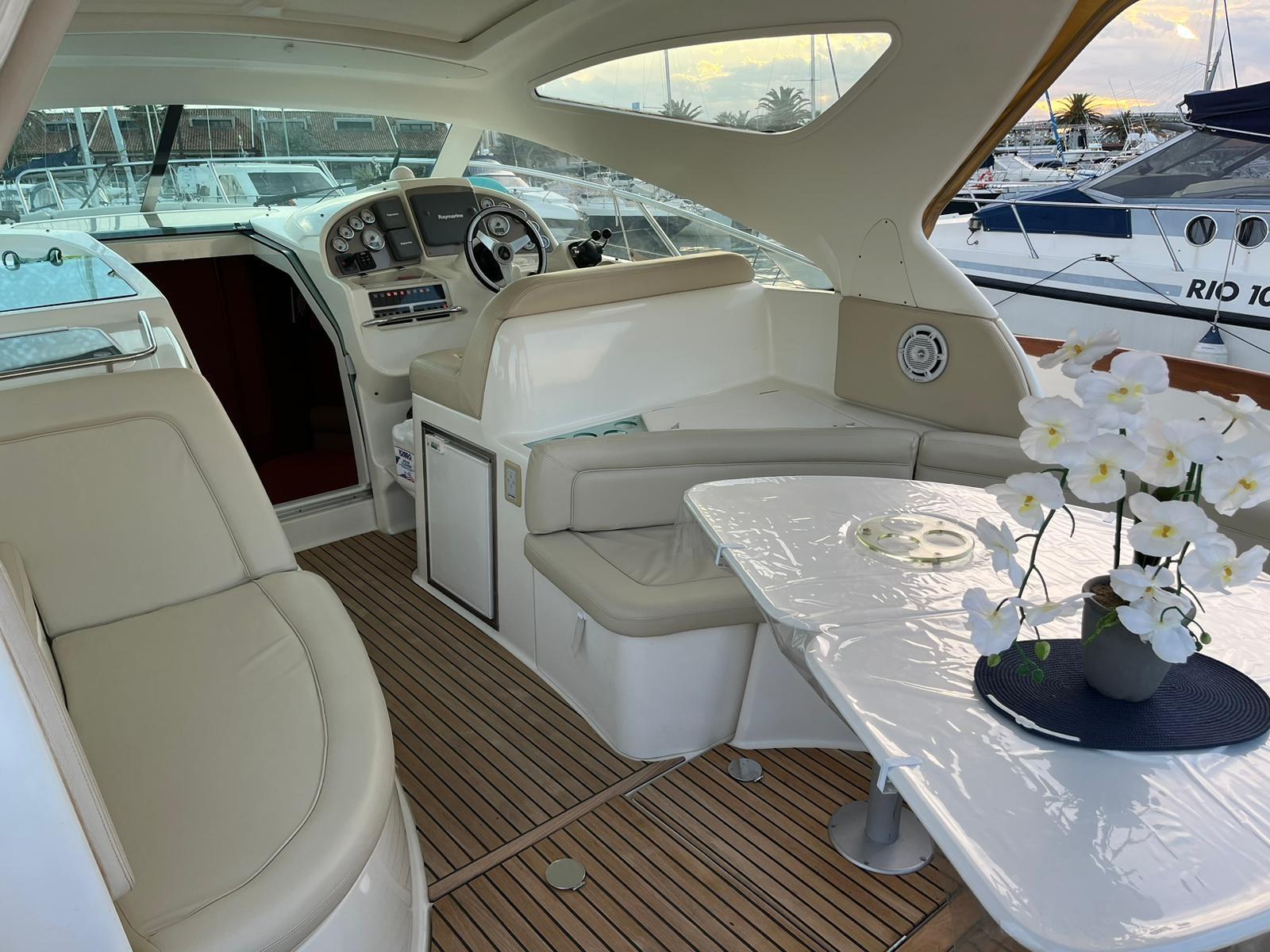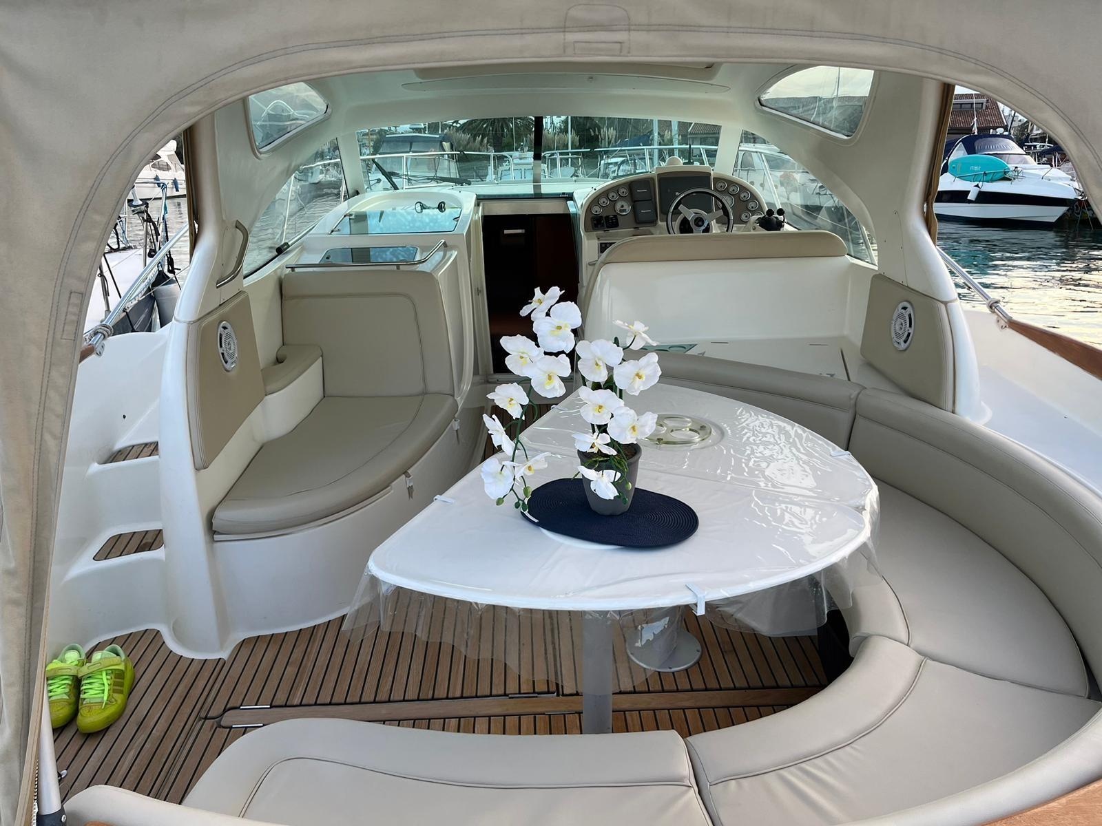 Alarme moteur, Eau sous pression, Douche de cockpit, Flaps hydrauliques, Hard top, Lavabo dans le cockpit, Éclairage de courtoisie, Plateforme arrière, Pompe de cale automatique, Pompe de cale manuelle, Cockpit en teck, Prise de quai, Connexion eau sous pression à quai, Rollbar, Guindeau électrique, Selles pour Annexe, table de cockpit, Table pliante de salon, Annexe, Corne.