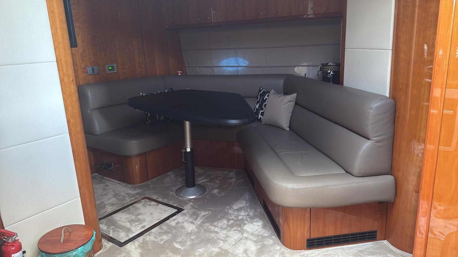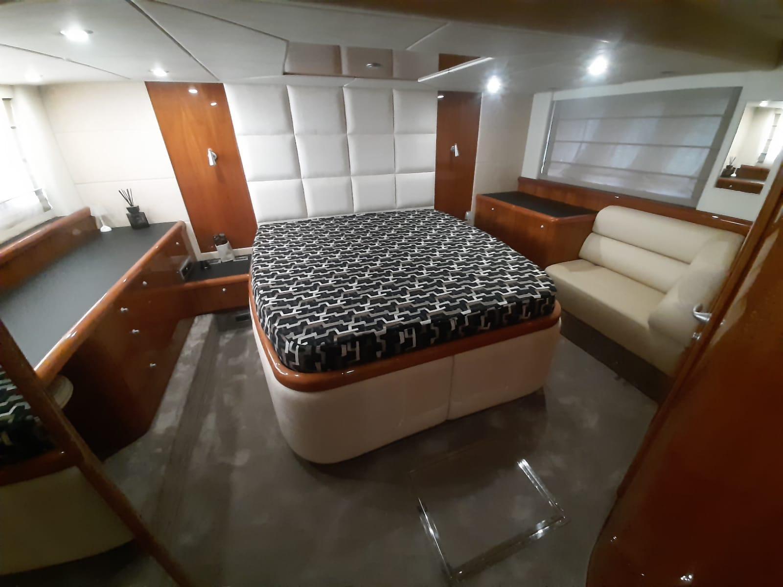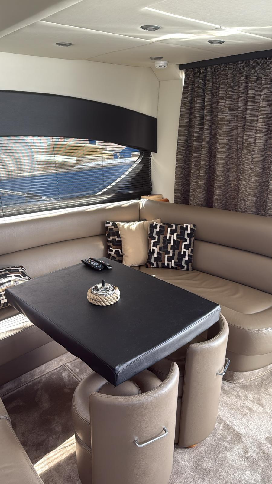 Alarme moteur, Alarme de pompe de cale, Alternateur, Eau sous pression, Douche de cockpit, Flaps hydrauliques, Hard top, Extincteur(s) fixe(s), Indicateurs de flaps, Éclairage de courtoisie, Spots sous-marins, Défenses, Passerelle, Plateforme arrière, Pompe de cale automatique, Pompe de cale manuelle, Pont en teck, Porte latérale, Cockpit en teck, Prise de quai, Connexion eau sous pression à quai, Guindeau électrique, Selles pour Annexe, table de cockpit, Corne, Winch électrique arrière, Winch électrique avant.