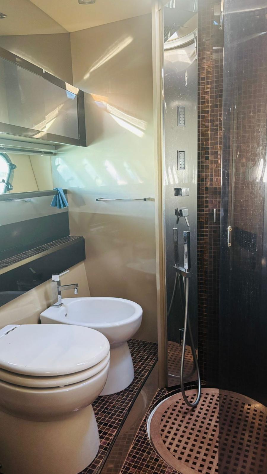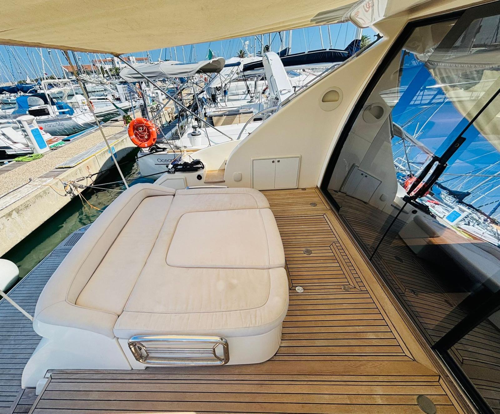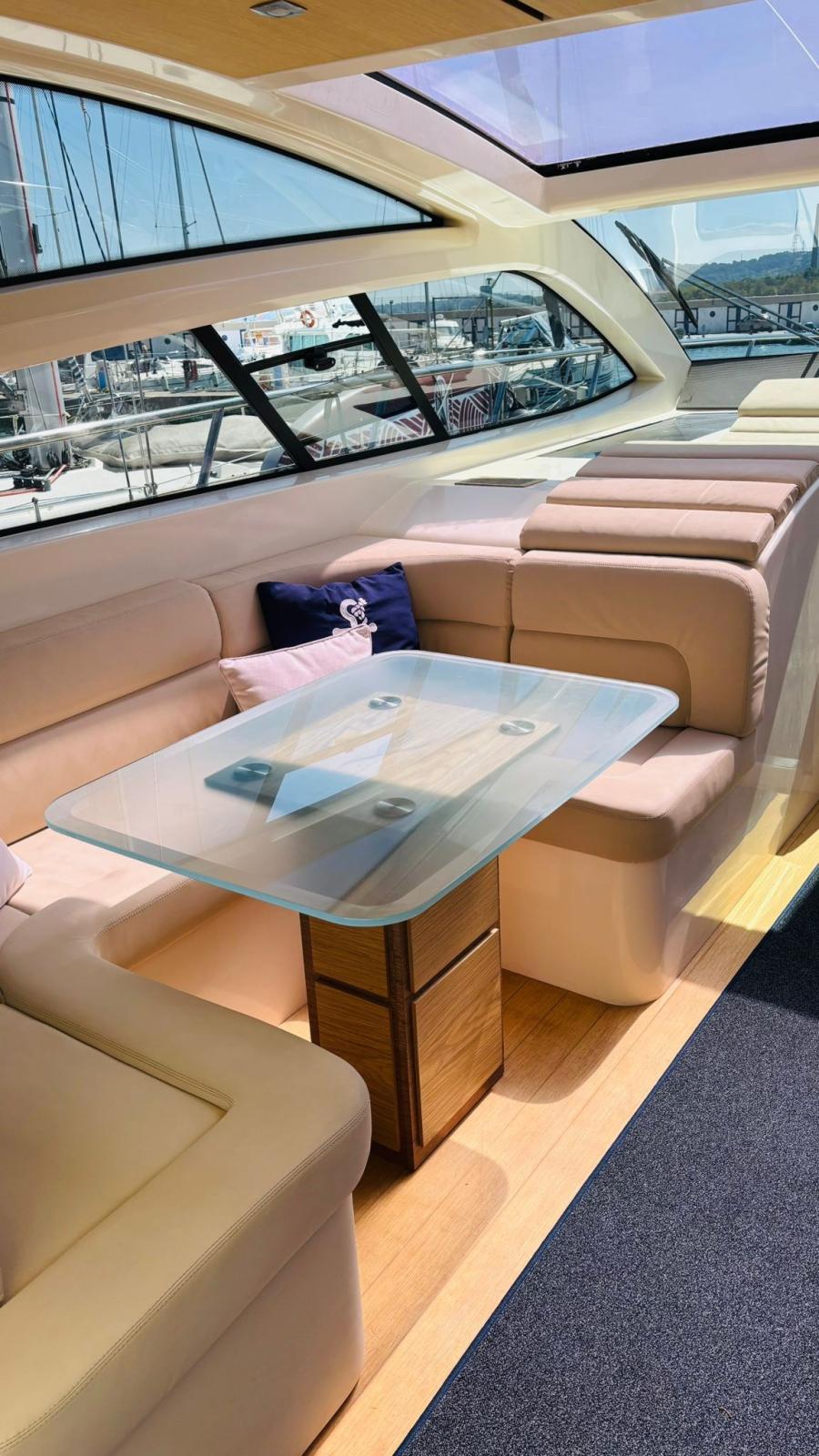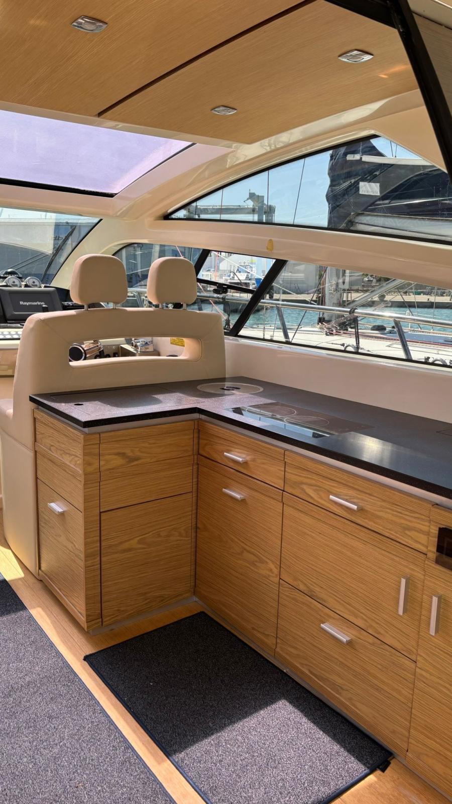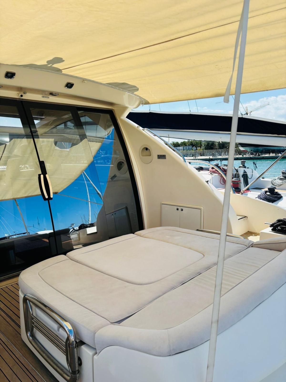 Alarme moteur, Alarme de pompe de cale, Alternateur, Eau sous pression, Passavant en teck, Câble d’alimentation à quai, Douche de cockpit, Phare de poursuite, Flaps hydrauliques (BENNET - CON INDICATORE DI POSIZIONE), Garage à annexe (Con apertura elettrica), Hard top, Spots sous-marins, 2 Panneau solaire (Montati sull’hard top), Passerelle, Pompe de cale automatique, Porte latérale, Cockpit en teck, Prise de quai, Guindeau électrique, table de cockpit, Annexe (Con fuoribordo Johnson 2,5).