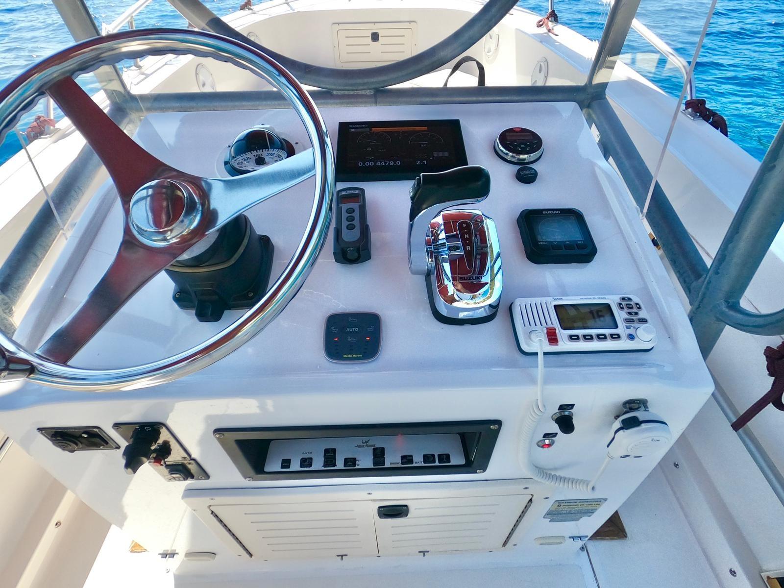 Indicateur d'angle de barre, Commande électrique, Compteur de chaîne, DSC VHF, Cartes et guides, Moniteur de consommation, Plotter GPS, Panneau de commande.