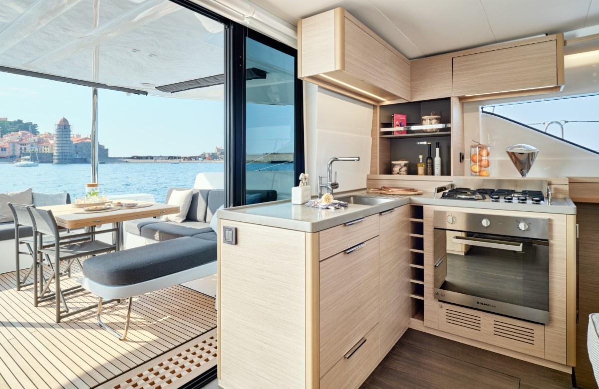 Première nouveauté : les espaces extérieurs optimisés : le flybridge du Lagoon 51 innove par la modularité de ses espaces, l’ergonomie ingénieuse et le confort de ce grand espace convivial. Le flybridge a été reformulé pour occuper 80% du rouf avec 2 beaux bains de soleil à l’avant de la timonerie et une grande zone avec des sièges en forme de C, dans lesquels la table centrale peut être abaissée pour créer un bain de soleil XL.