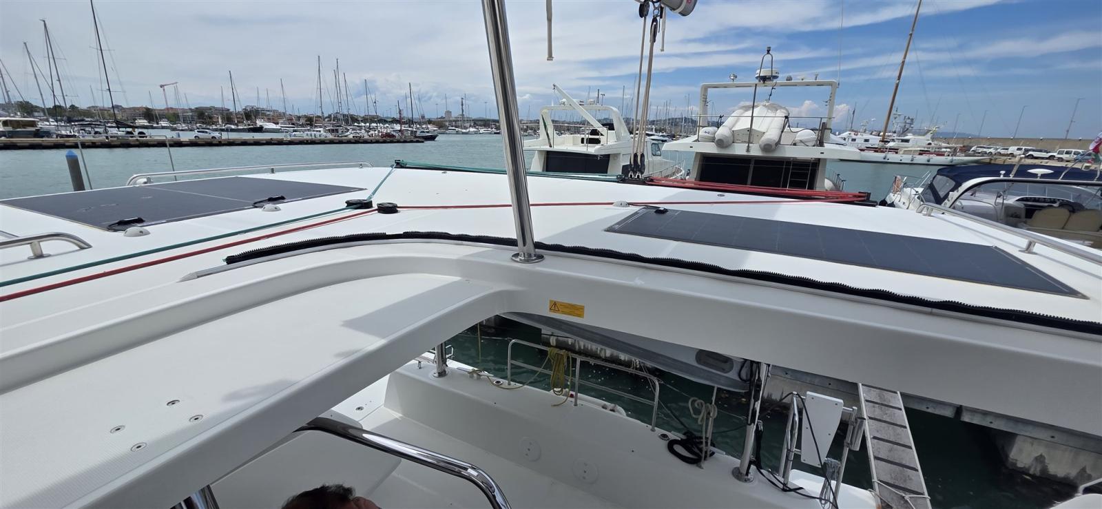 Alarme moteur, Alarme de pompe de cale, Eau sous pression, Batteries (Agosto 2025), Douche de cockpit, Bossoirs pour annexe, 2 Spots sous-marins, 3 Panneau solaire, Passerelle (in carbonio), Pompe de cale automatique, Porte latérale, Prise de quai, Connexion eau sous pression à quai, Guindeau électrique (REMOTE), Gréement monotoron, Echelle de bain, table de cockpit, Annexe, 2 Winch.