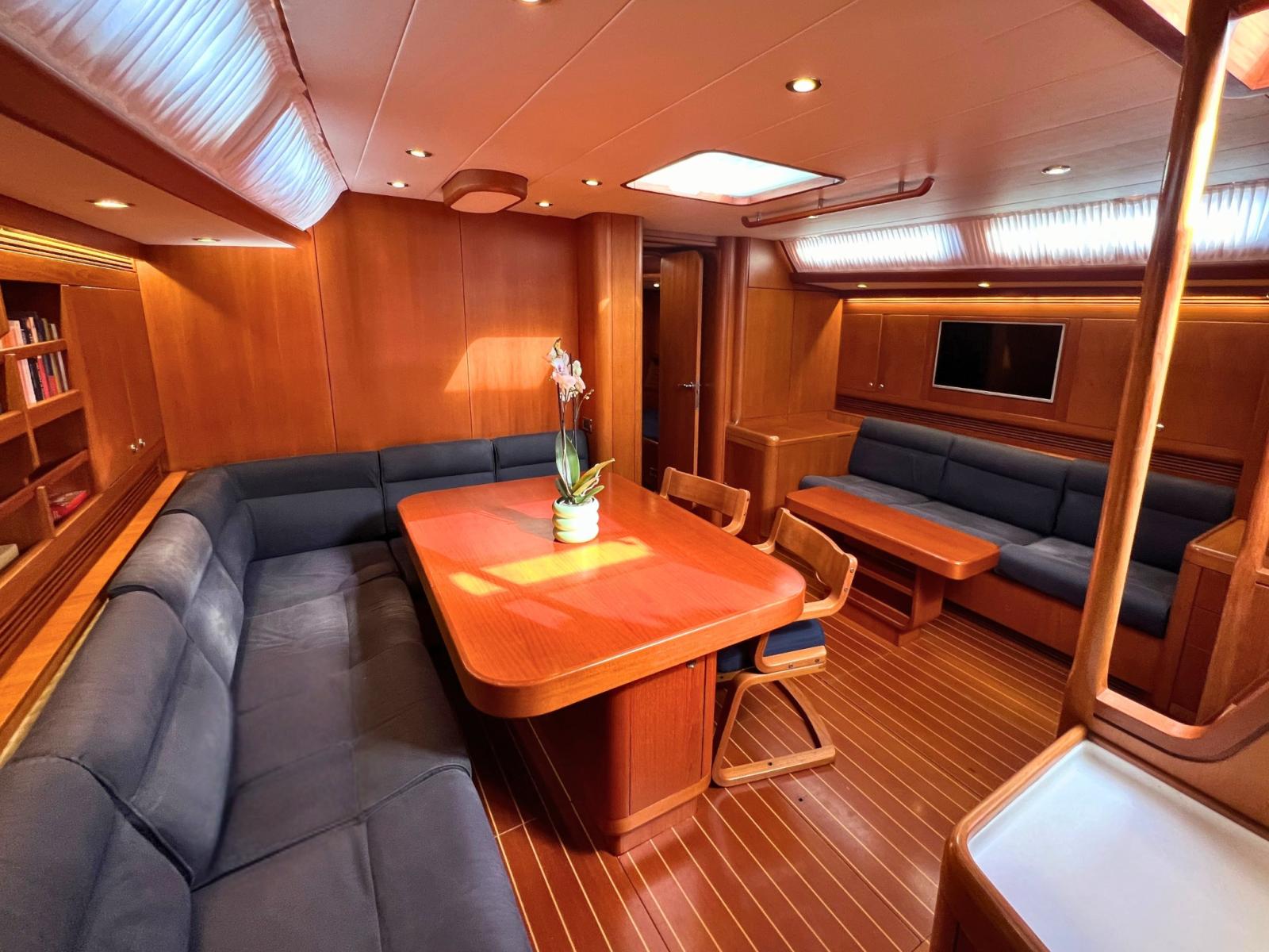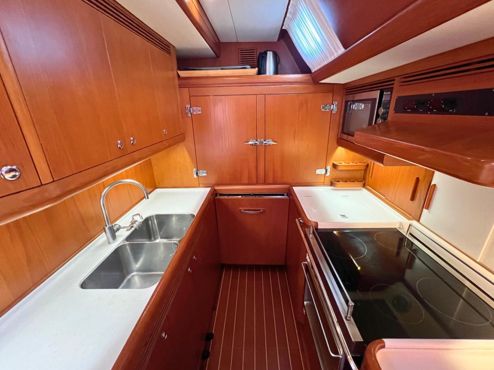 L’intérieur en satin teck couleur miel propose une disposition avec trois cabines doubles et trois salles de bains attenantes, dont une cabine principale avec lit central et douche séparée. La cuisine est entièrement équipée pour des croisières de longue durée, avec des appareils de taille domestique et de nombreux volumes de stockage.