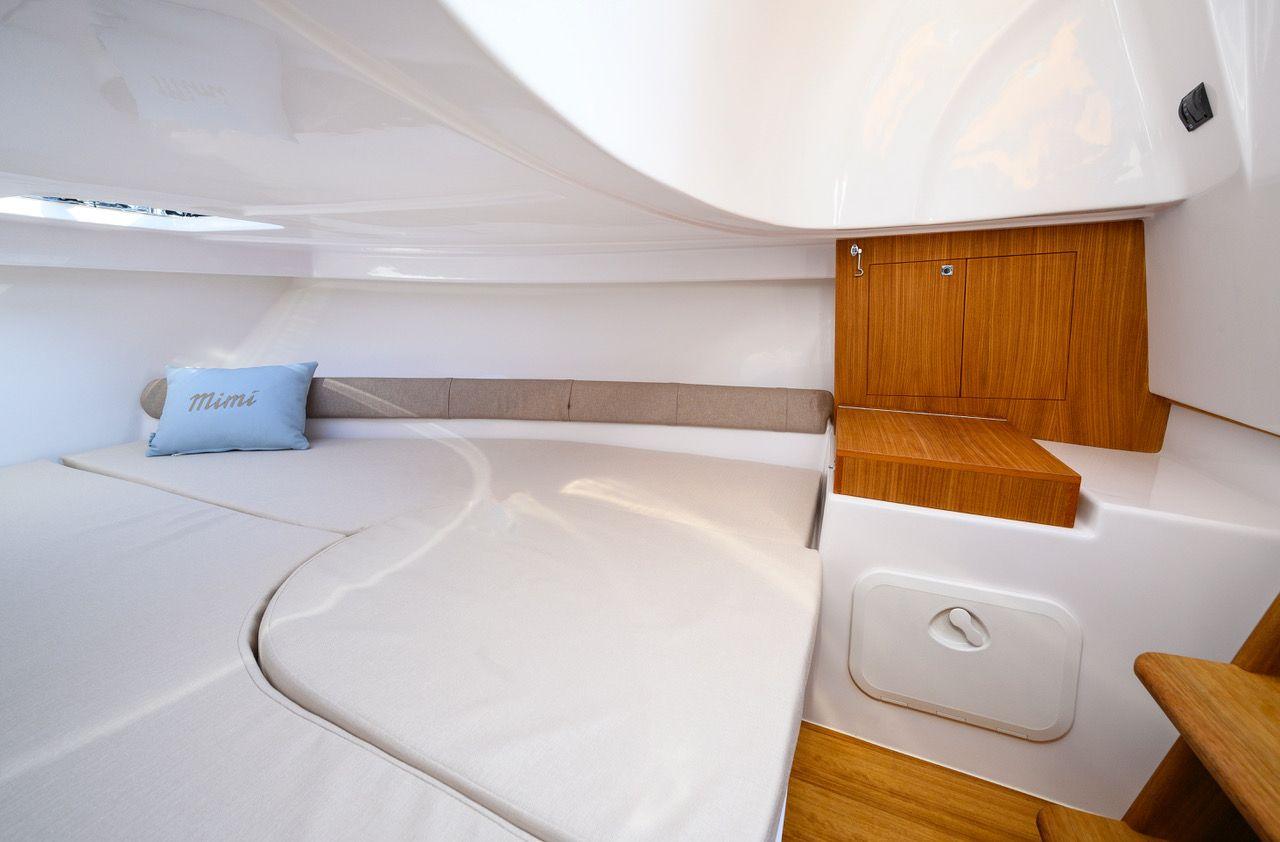 Comme ses grand frères du chantier Mimi, il propose un généreux bain de soleil à l'avant, une banquette de cockpit en U à l'arrière pouvant se transformer en bain de soleil.