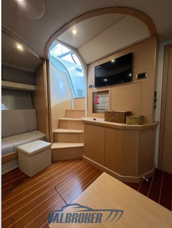 Ancre (80m catena), Ouverture du compartiment moteur électrique, Eau sous pression, Passavant en teck, Douche de cockpit, Phare de poursuite, Flaps hydrauliques, Garage à annexe, Hard top, Indicateurs de flaps, Éclairage de courtoisie, Spots sous-marins, Passerelle (a scomparsa, idraulica), Plateforme arrière (teak), Porte latérale (inox), Cockpit en teck, Guindeau électrique, Echelle de bain, Annexe (Arimar).