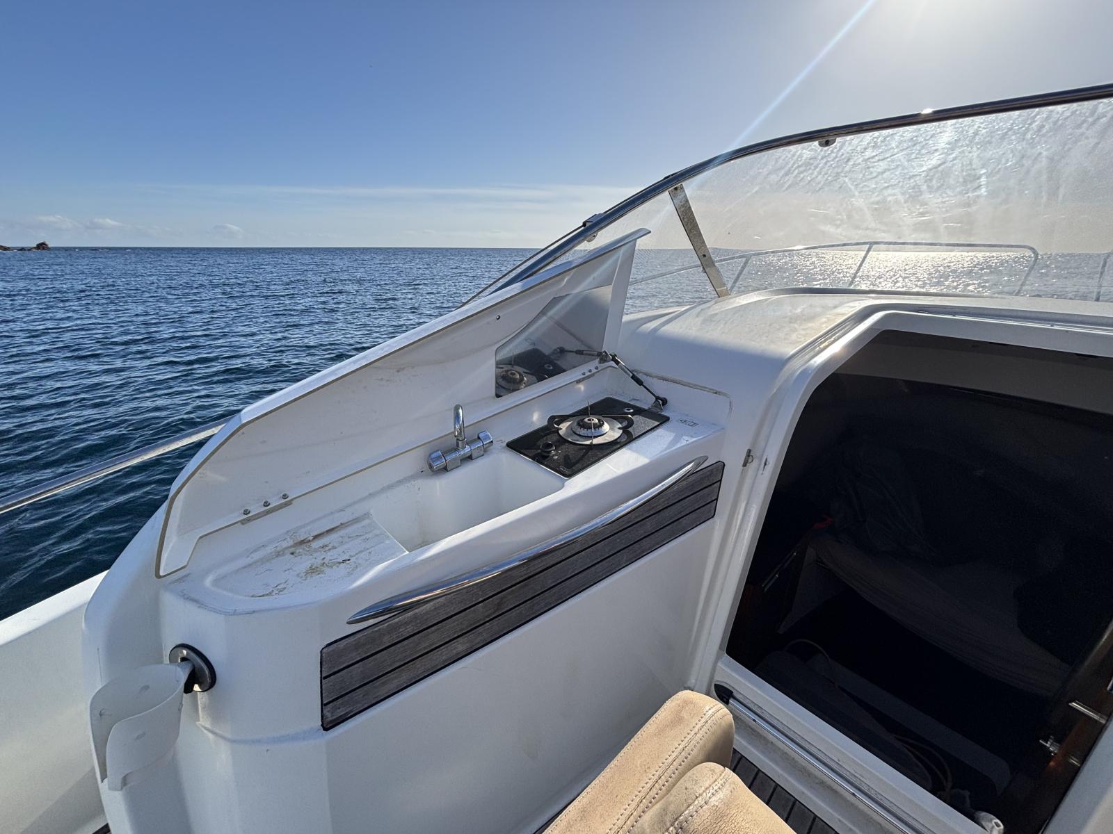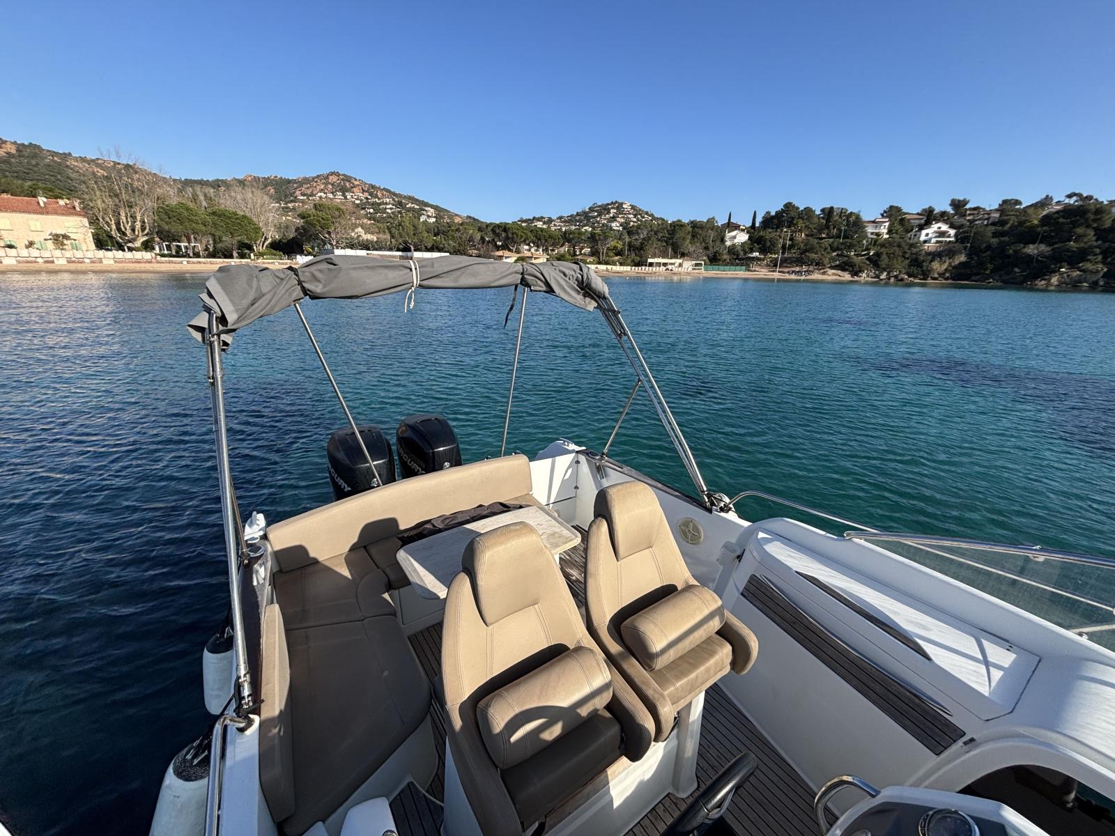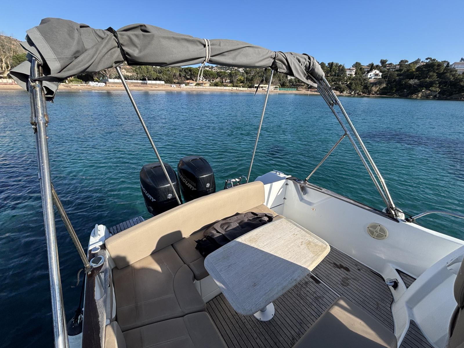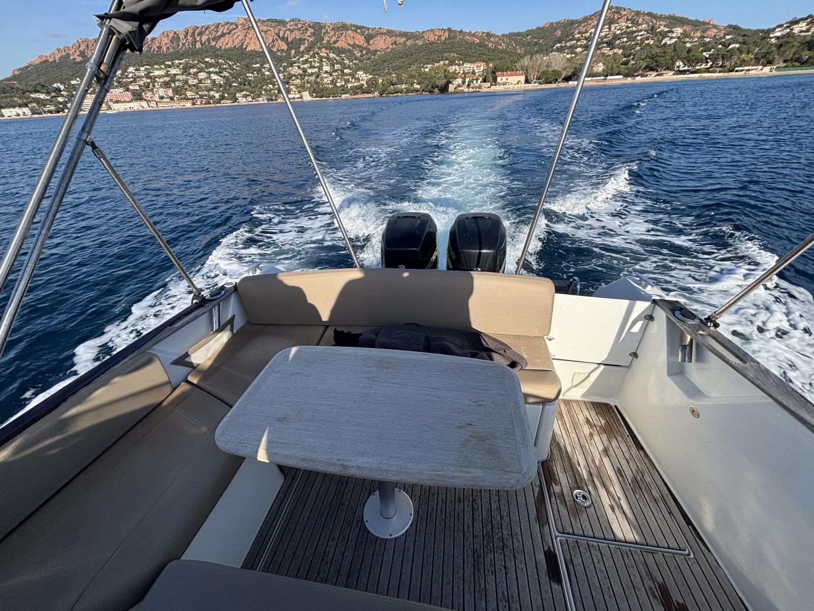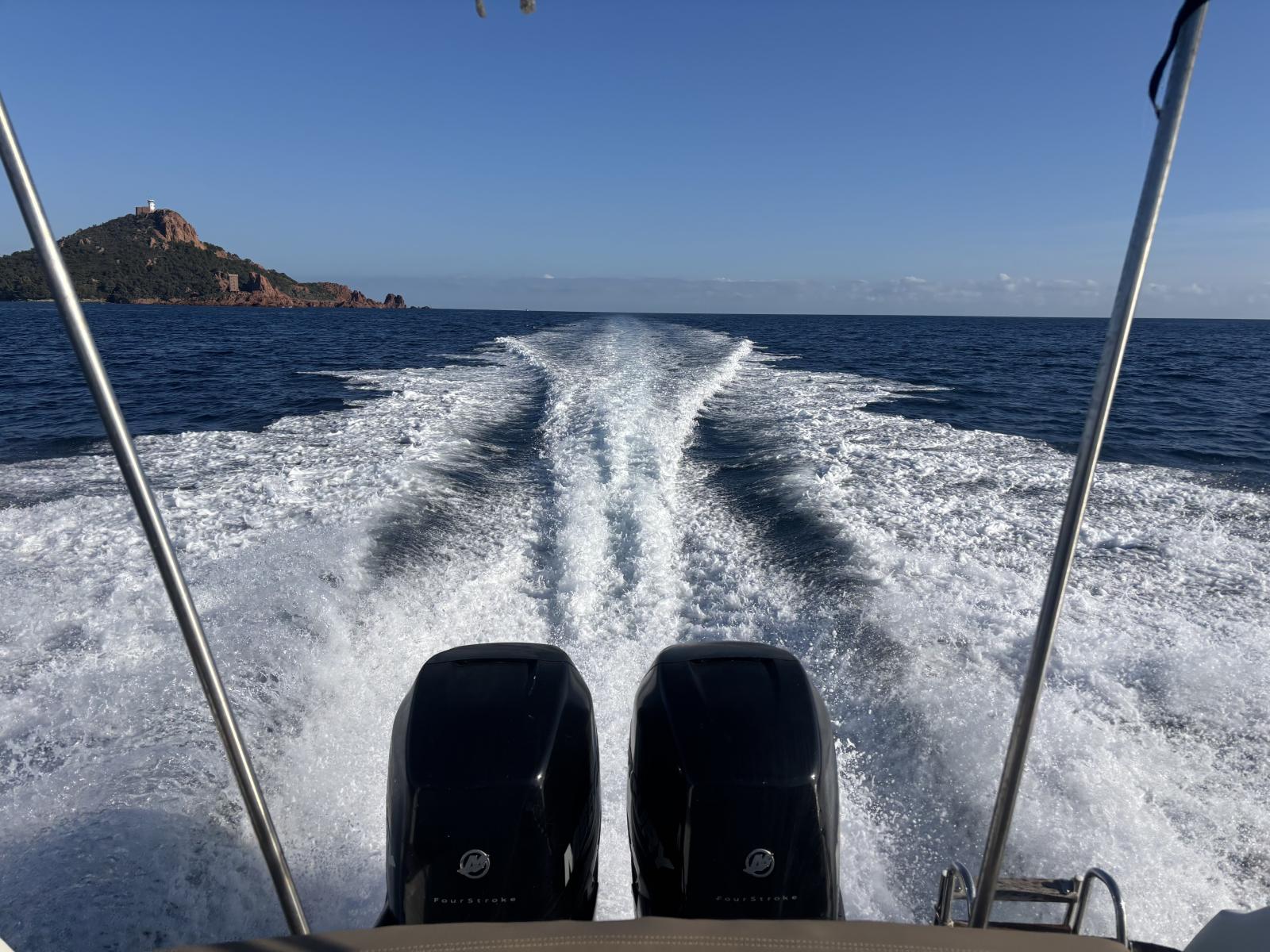 Double motorisation Mercury Verado 225 CV avec commande synchronisée. Entretien et révision moteur effectués régulièrement. Antifouling récent. 2 grandes batteries, une batterie moteur et une batterie service. Bateau hiverné chaque année, sortie de l’eau en novembre et remise à l’eau en avril.