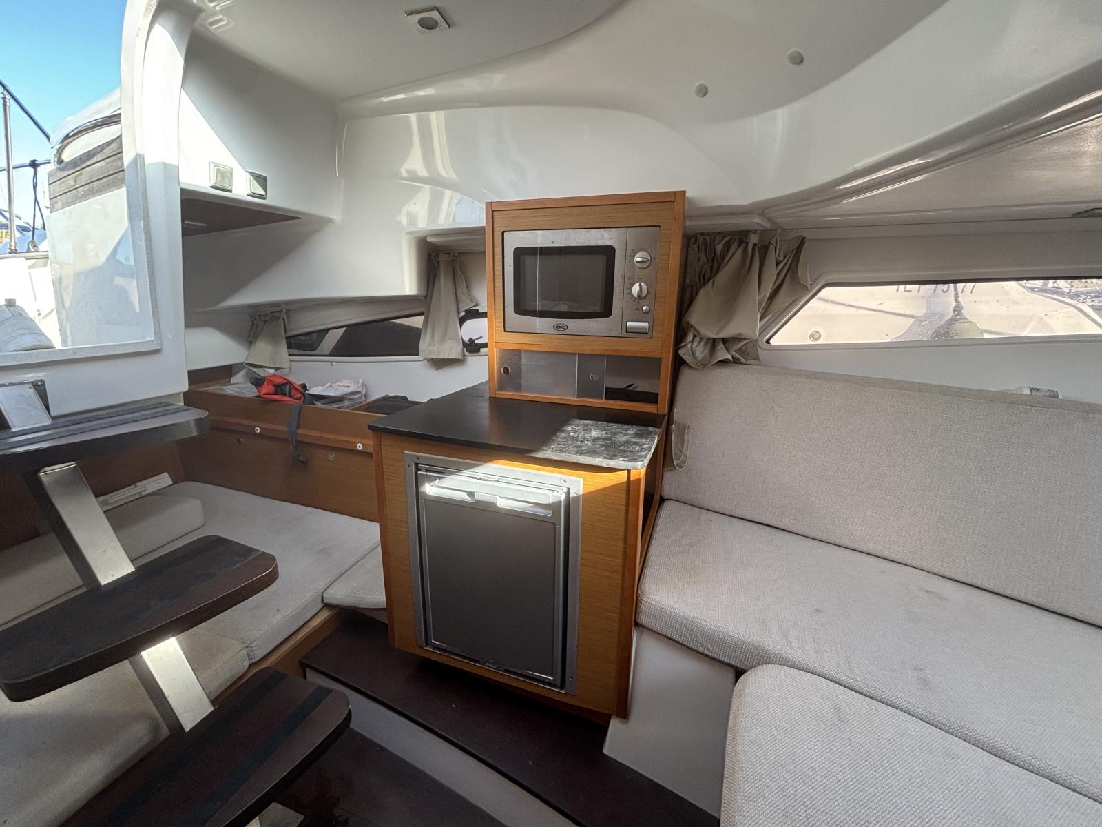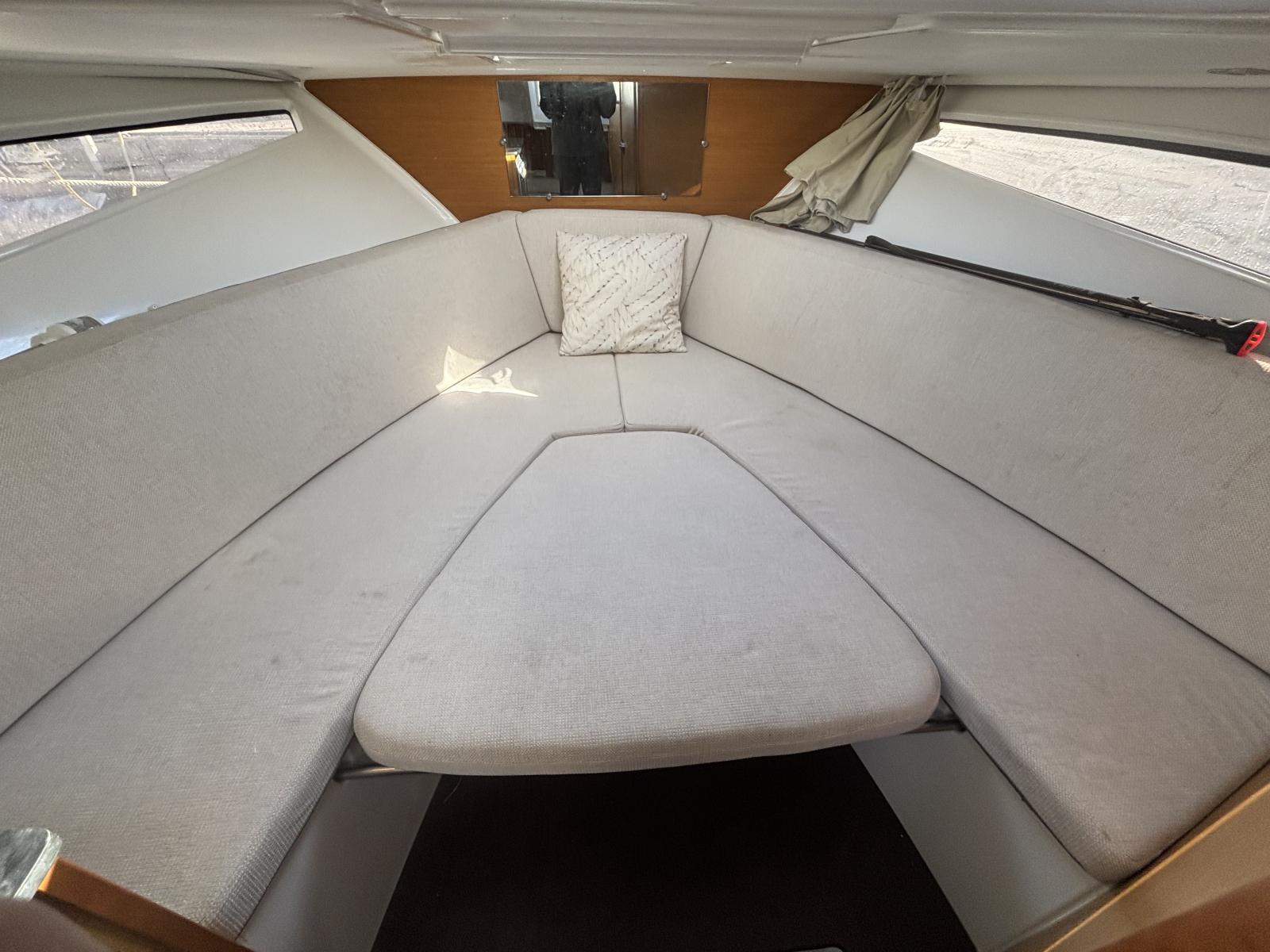 Le bateau dispose d’une cabine avec couchage double, d’une salle d’eau avec toilettes manuelles et douche, eau chaude au lavabo. Douche de pont avec eau froide. Carré extérieur modulable avec assise avant transformable. Frigo intérieur, chauffe-eau et installation gaz.