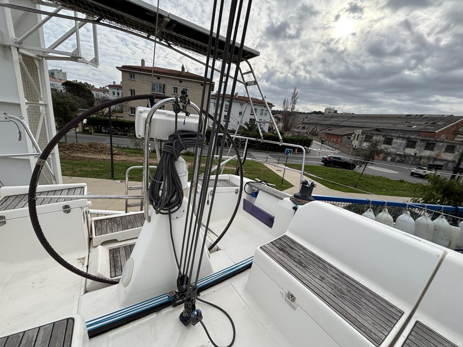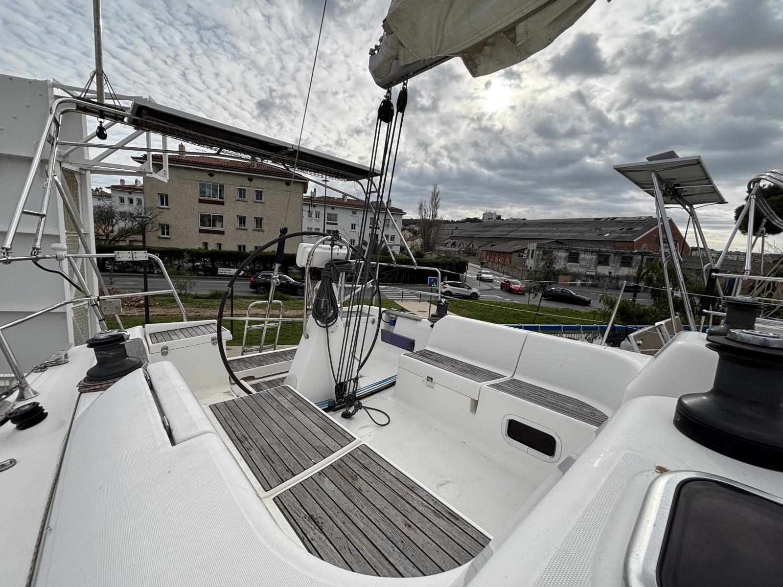 Jeu de voiles complet comprenant une grand-voile full batten, un génois sur enrouleur, un solent et un spinnaker, permettant d’exploiter pleinement le bateau dans toutes les allures. L’équipement est complété par un guindeau électrique, des panneaux solaires, un convertisseur et un GPS/sondeur.