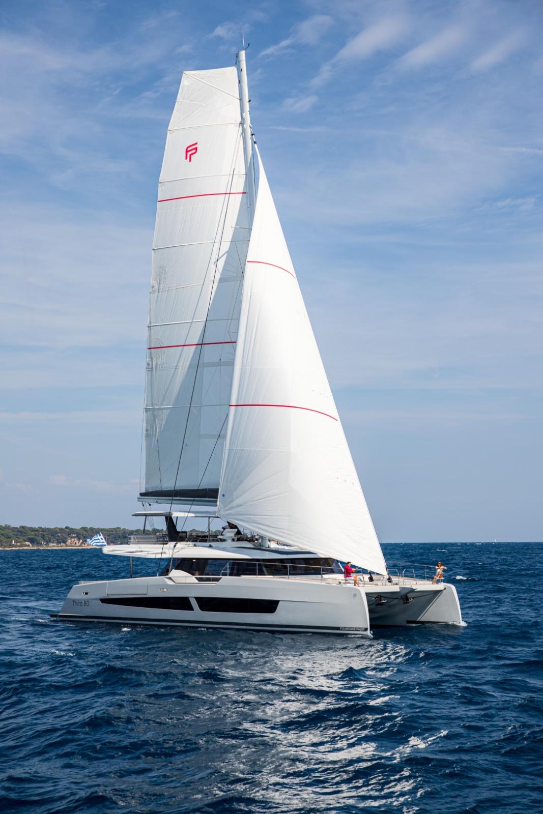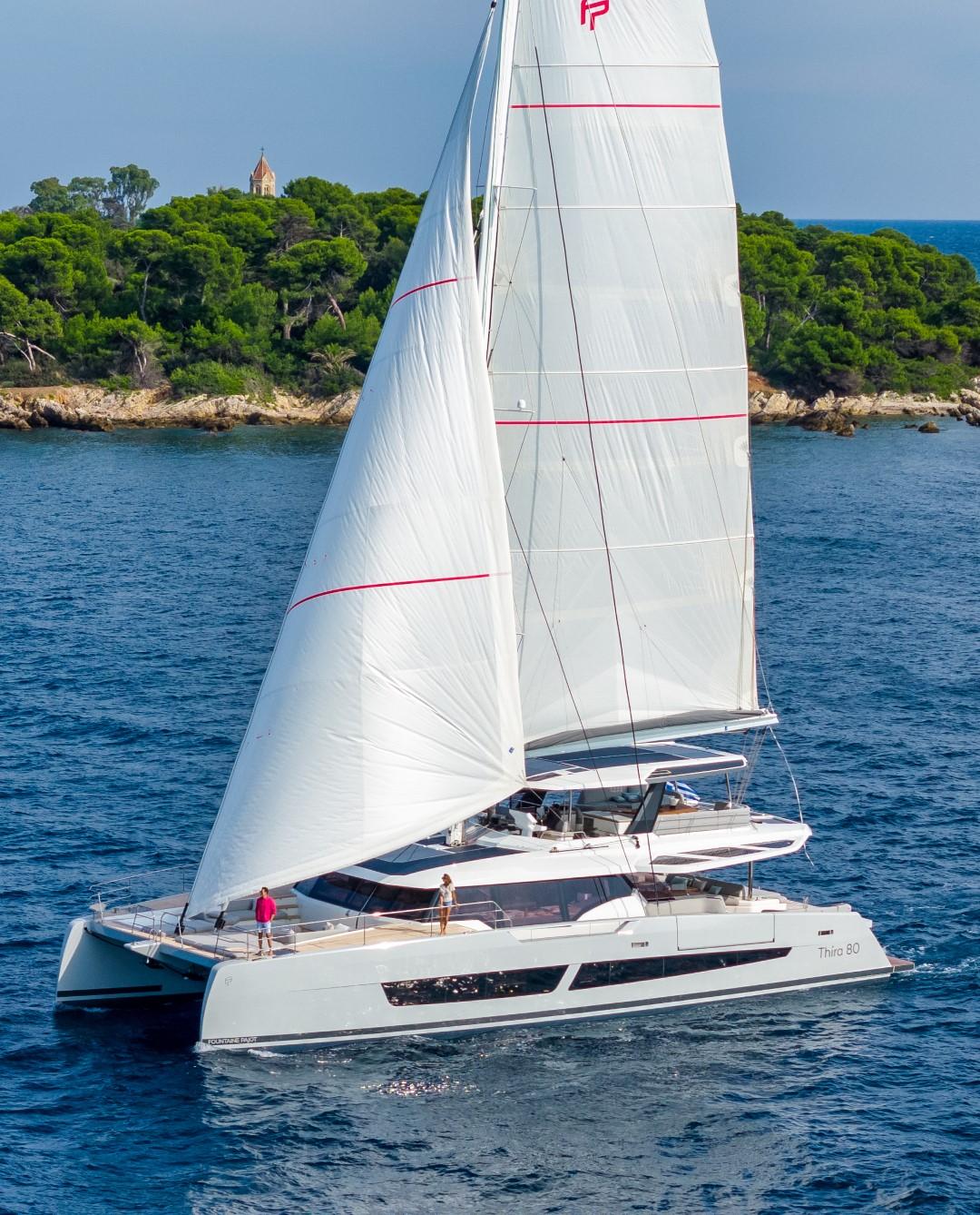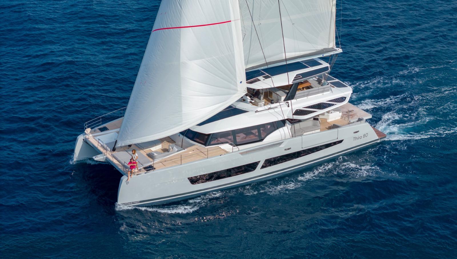 Le Fountaine Pajot Thíra 80 est un catamaran à voile de luxe hors normes, positionné comme le yacht emblématique de la gamme voile du chantier français .