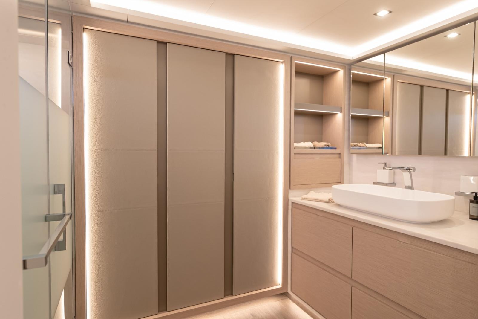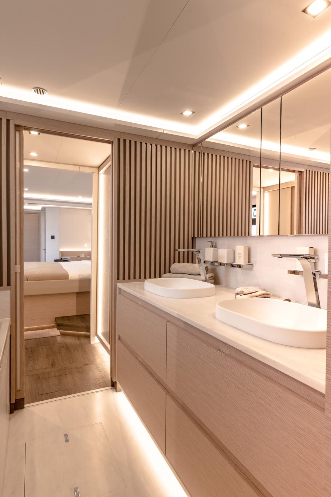 À bord, les aménagements sont conçus pour le confort et l’intimité des propriétaires et invités. Selon les configurations, le Thíra 80 peut intégrer des suites propriétaires majestueuses, des cabines VIP, ainsi que des espaces invités allant jusqu’à 5 à 7 cabines avec leurs salles de bains privatives. Les finitions utilisent des matériaux haut de gamme (bois, cuir, bains type spa, etc.).